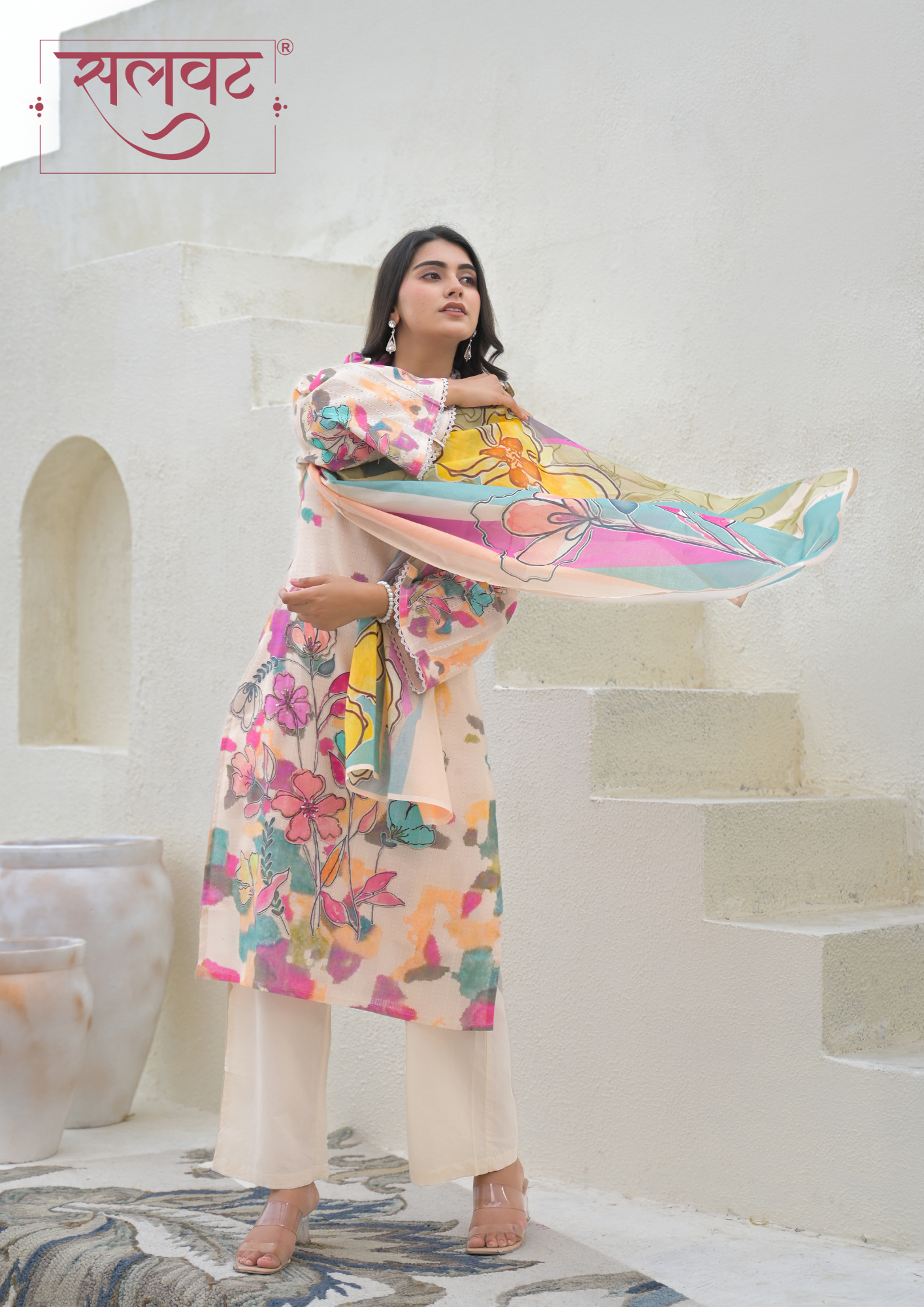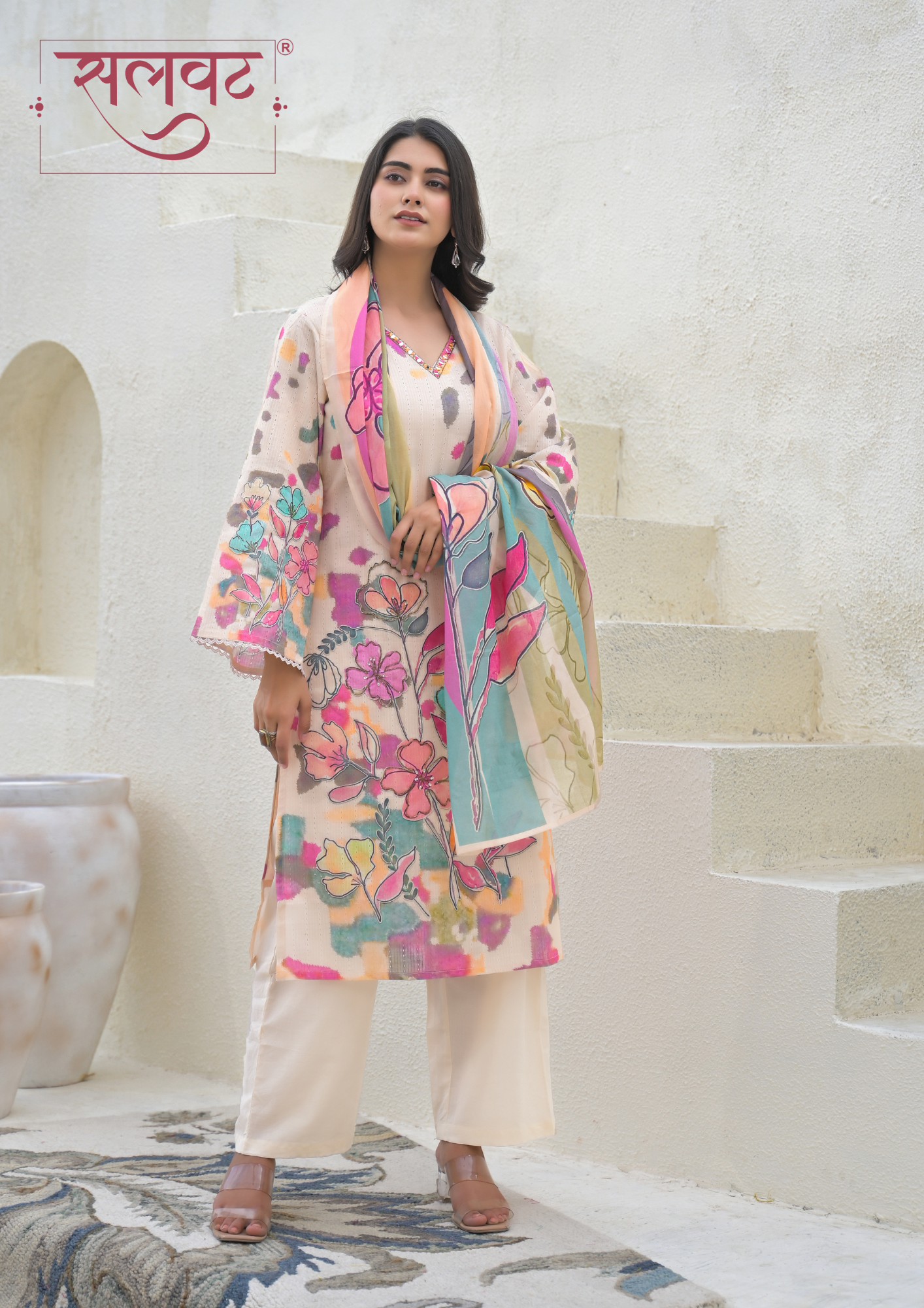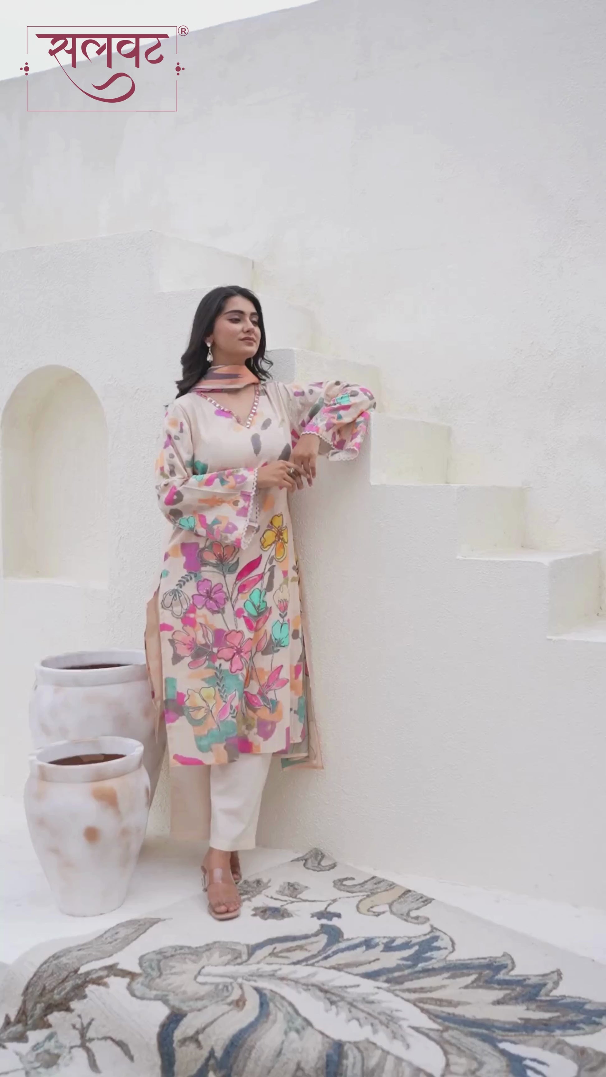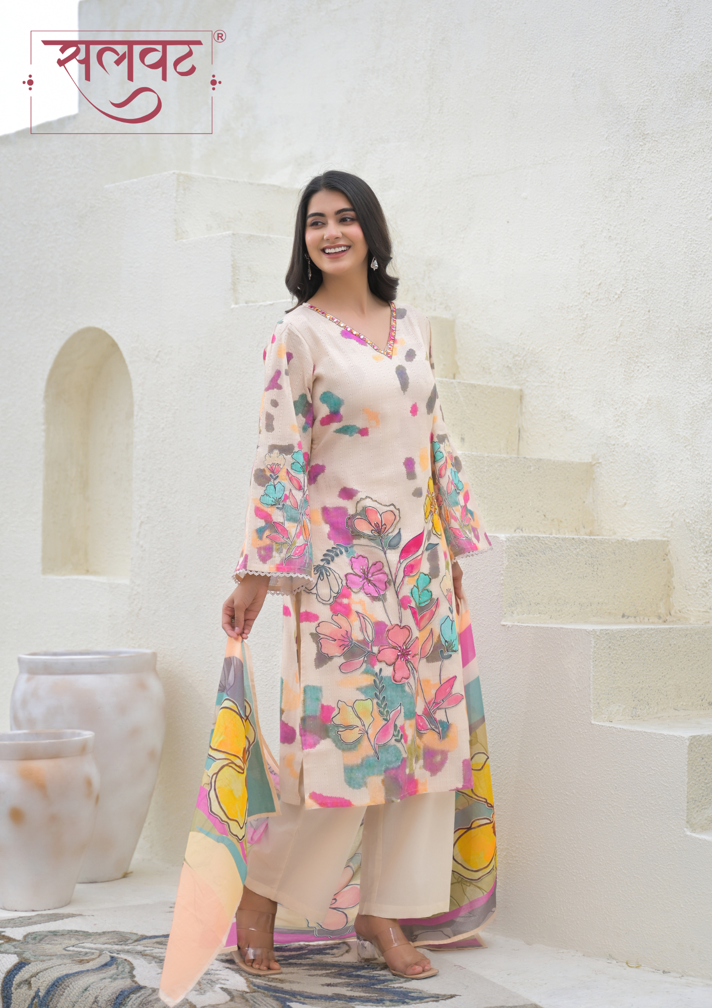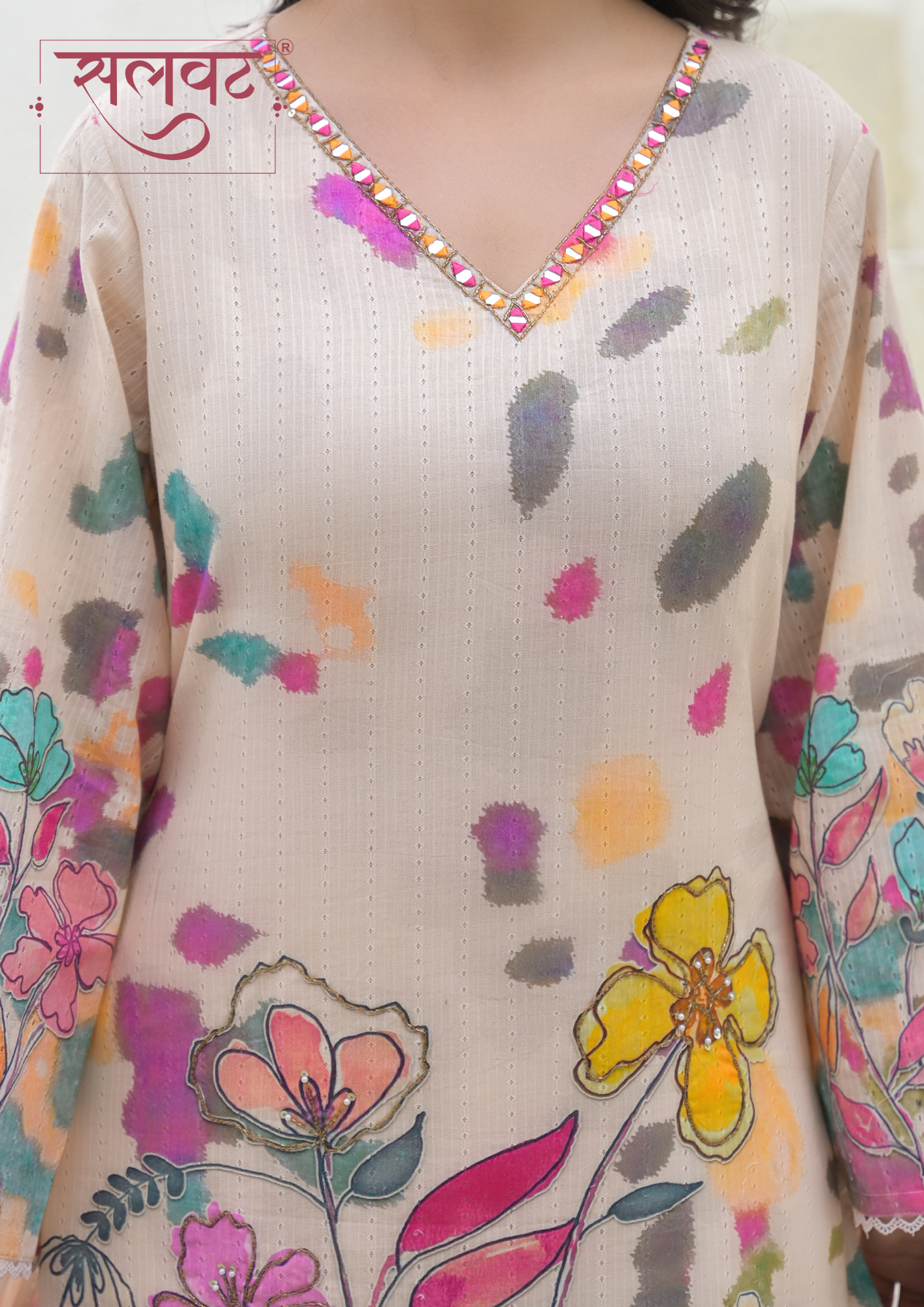 Detailed mirror work on neck & beads-sequins handwork on printed flowers on kurta, lace on sleeves & kurta hemline.