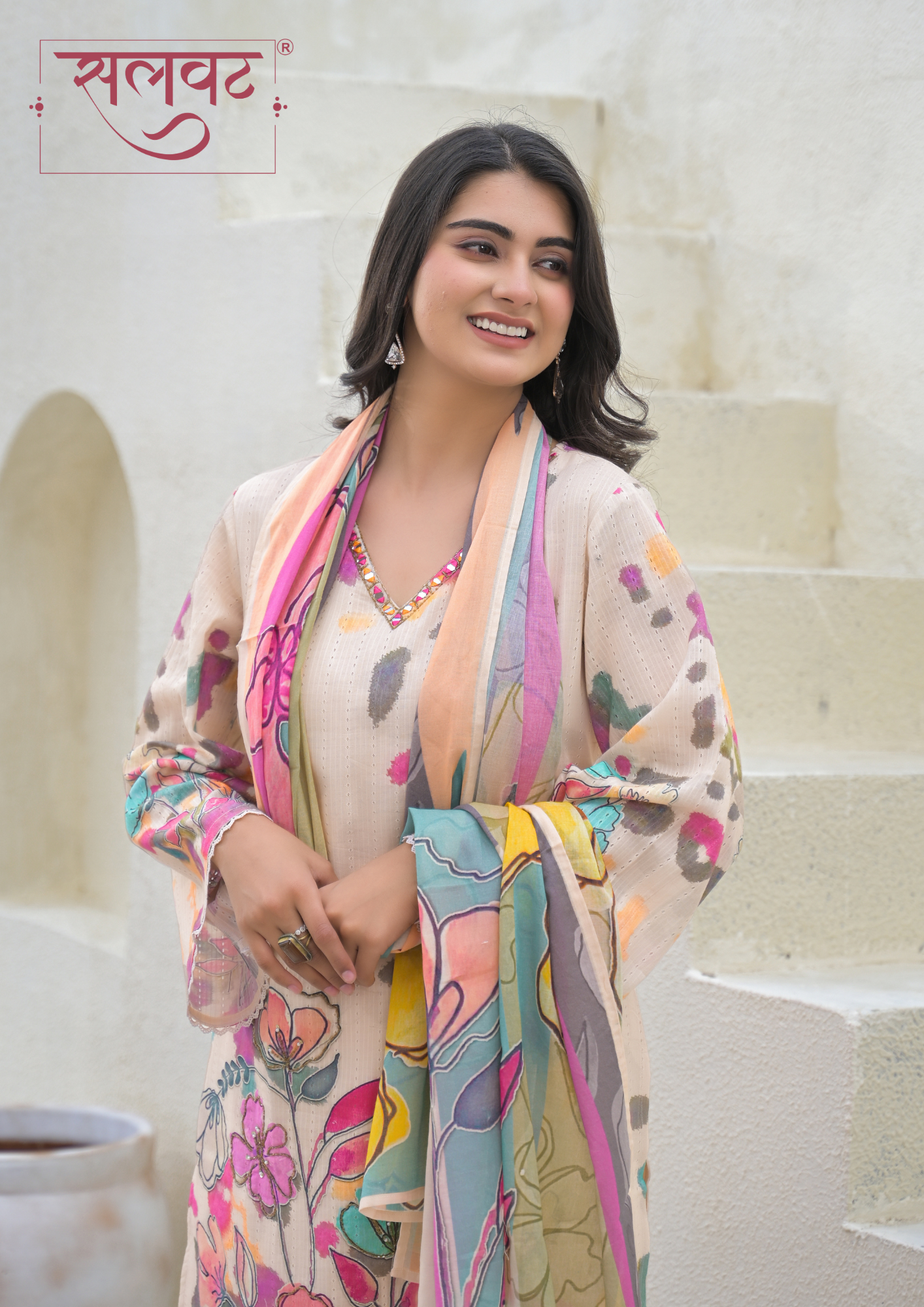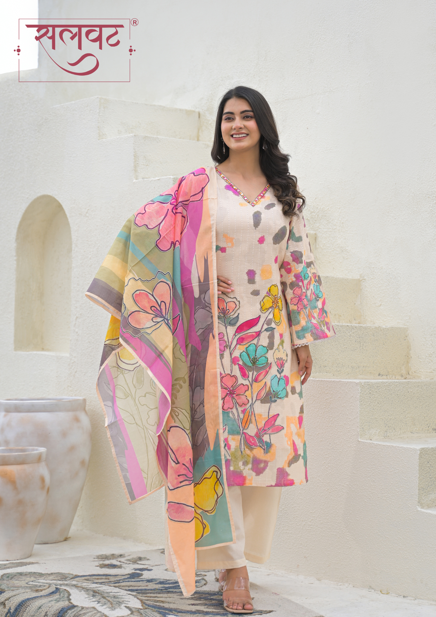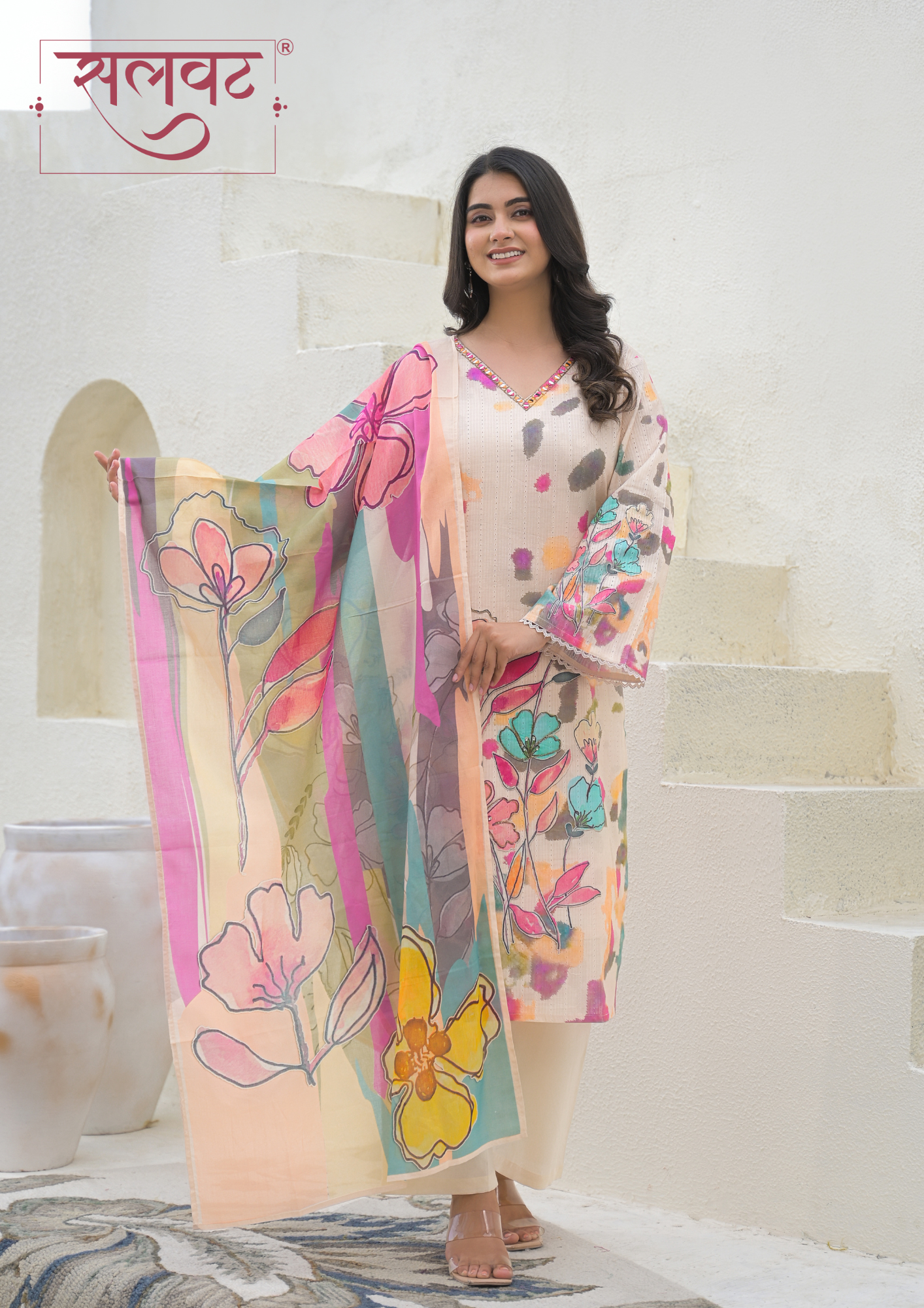 Camel Beige Colorful Floral Printed Kurta Set With Dupatta