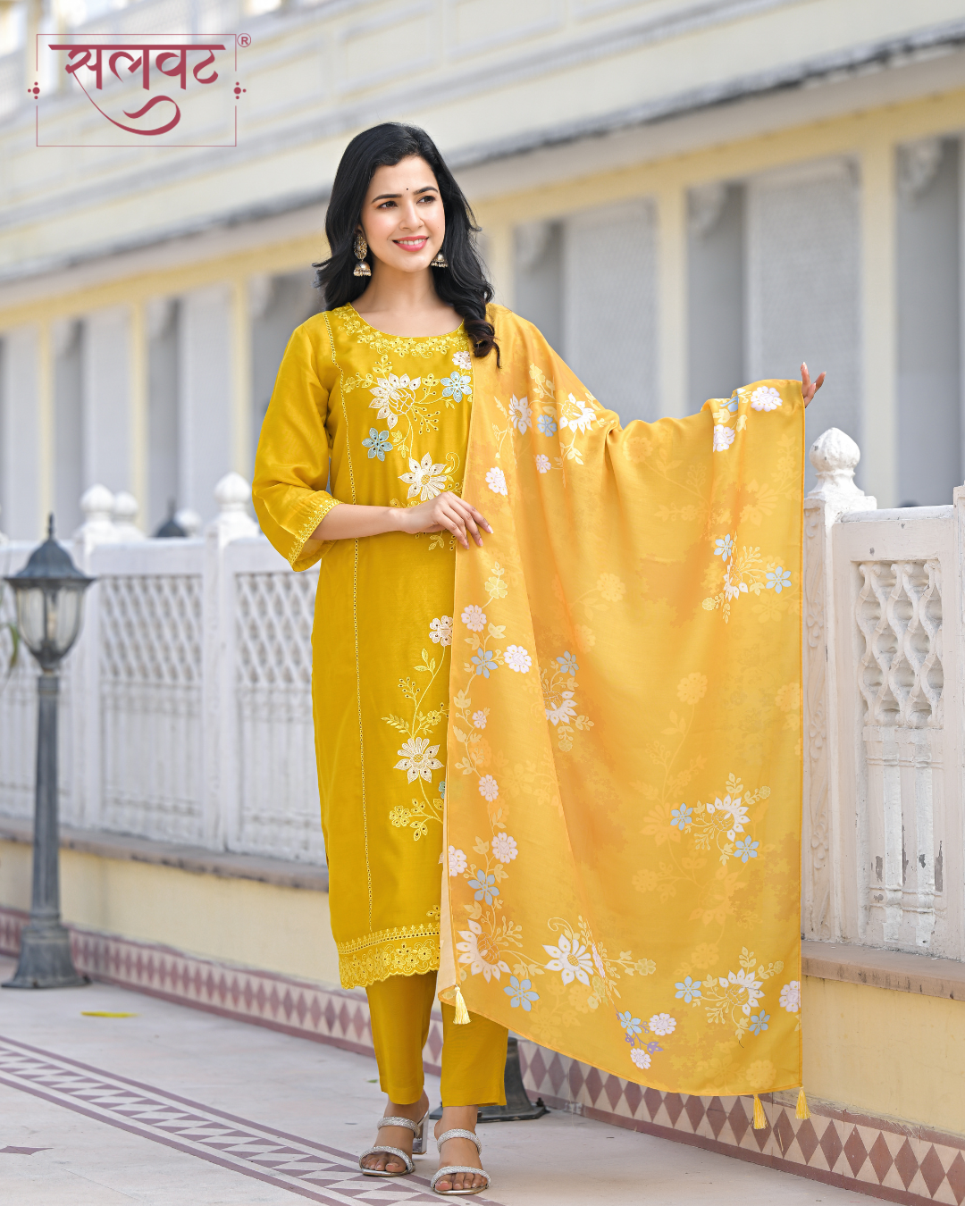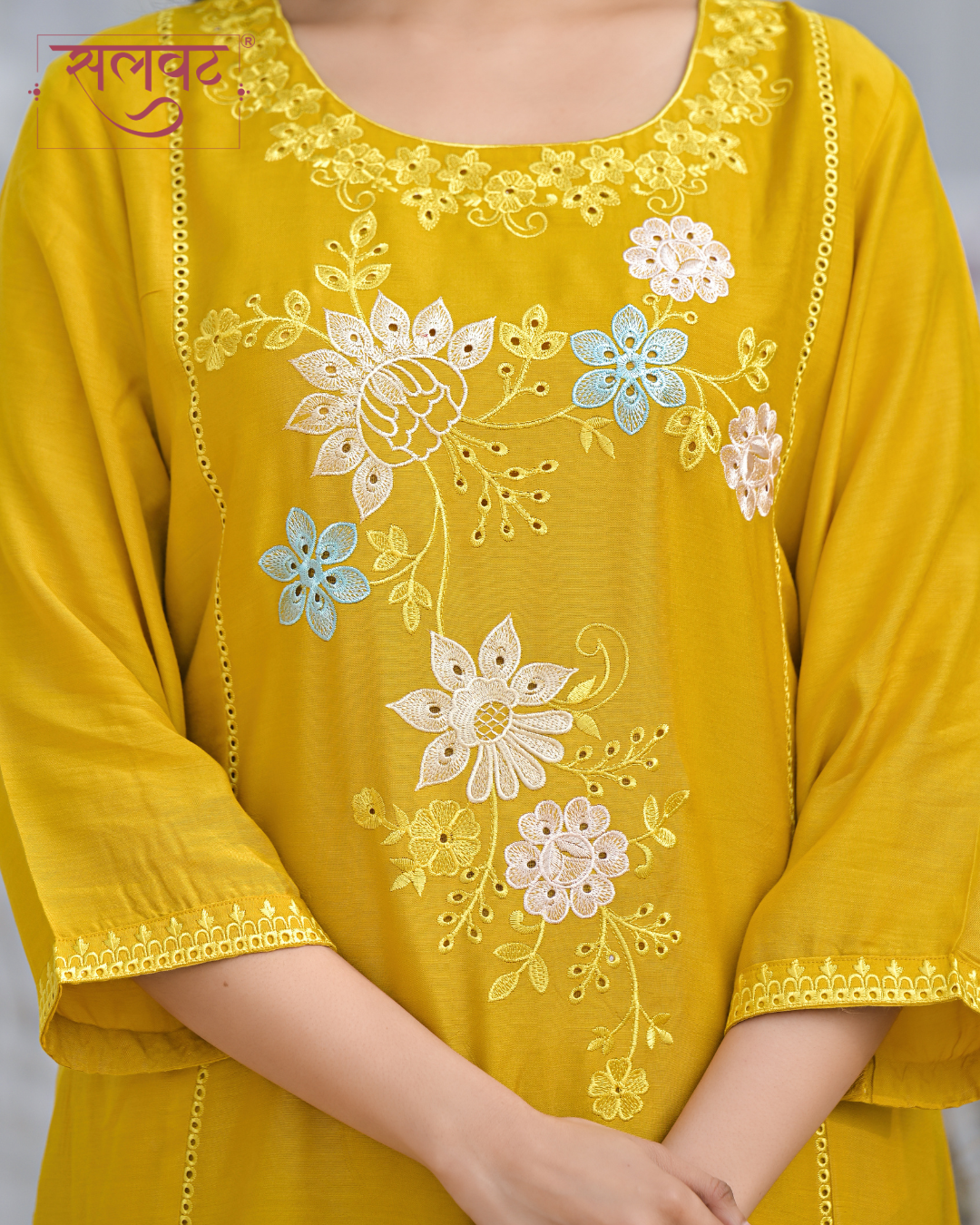 Amber Mustard Embroidered Kurta Set With Printed Dupatta