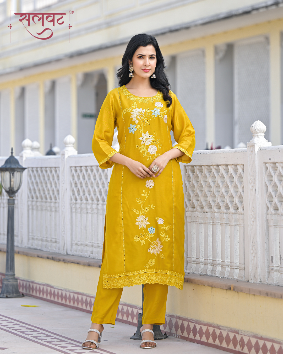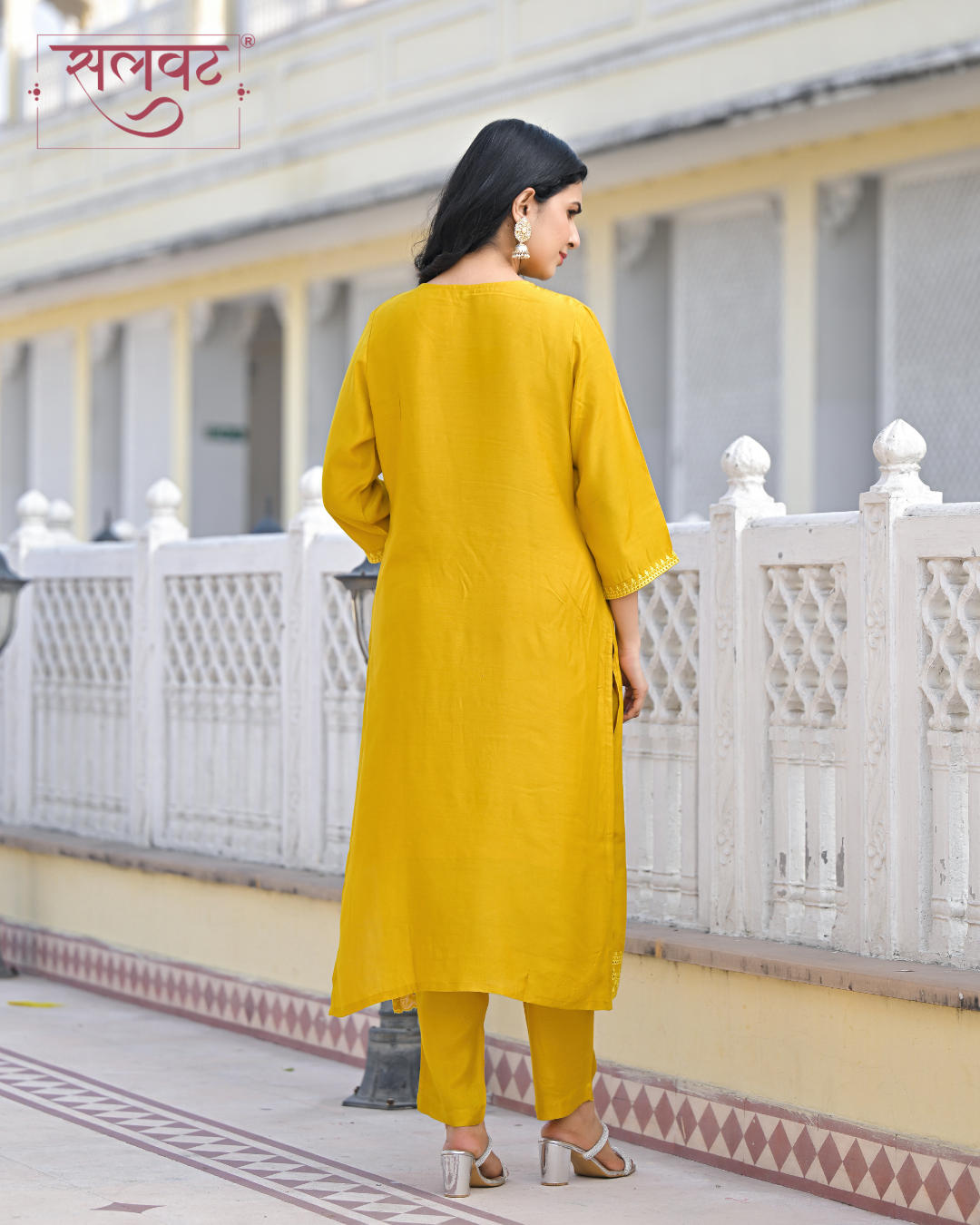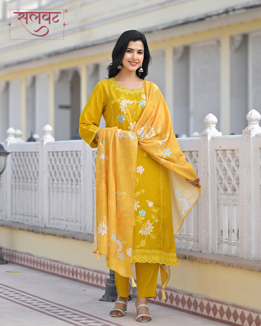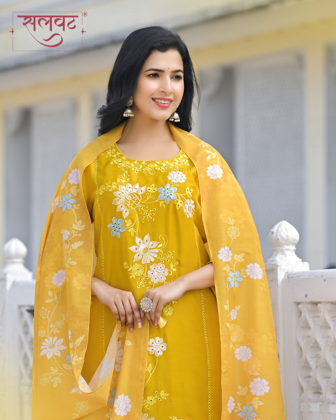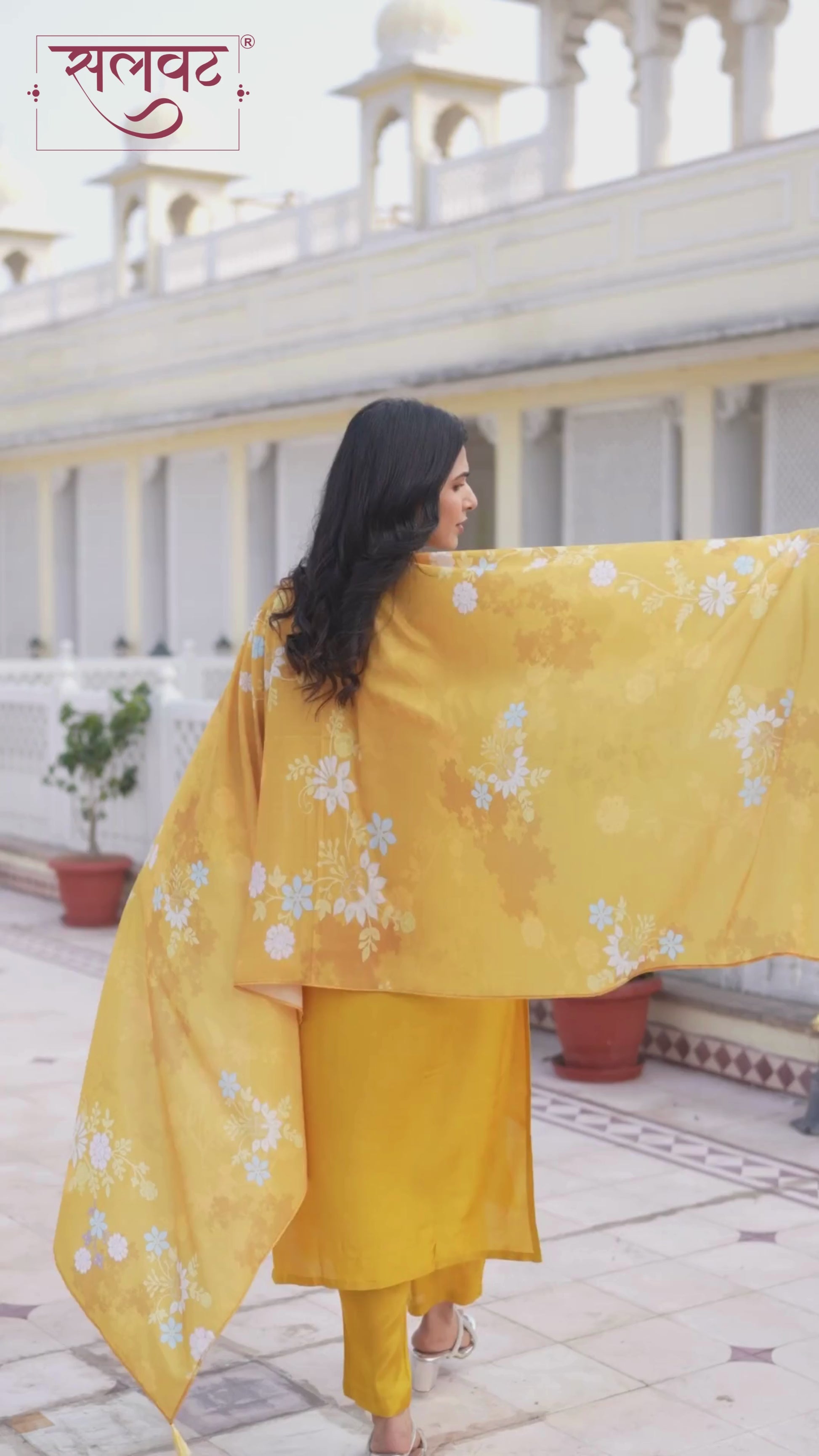 Amber Mustard muslin borar embroidered hand-dyed kurta & pants with elegant digital print dupatta.