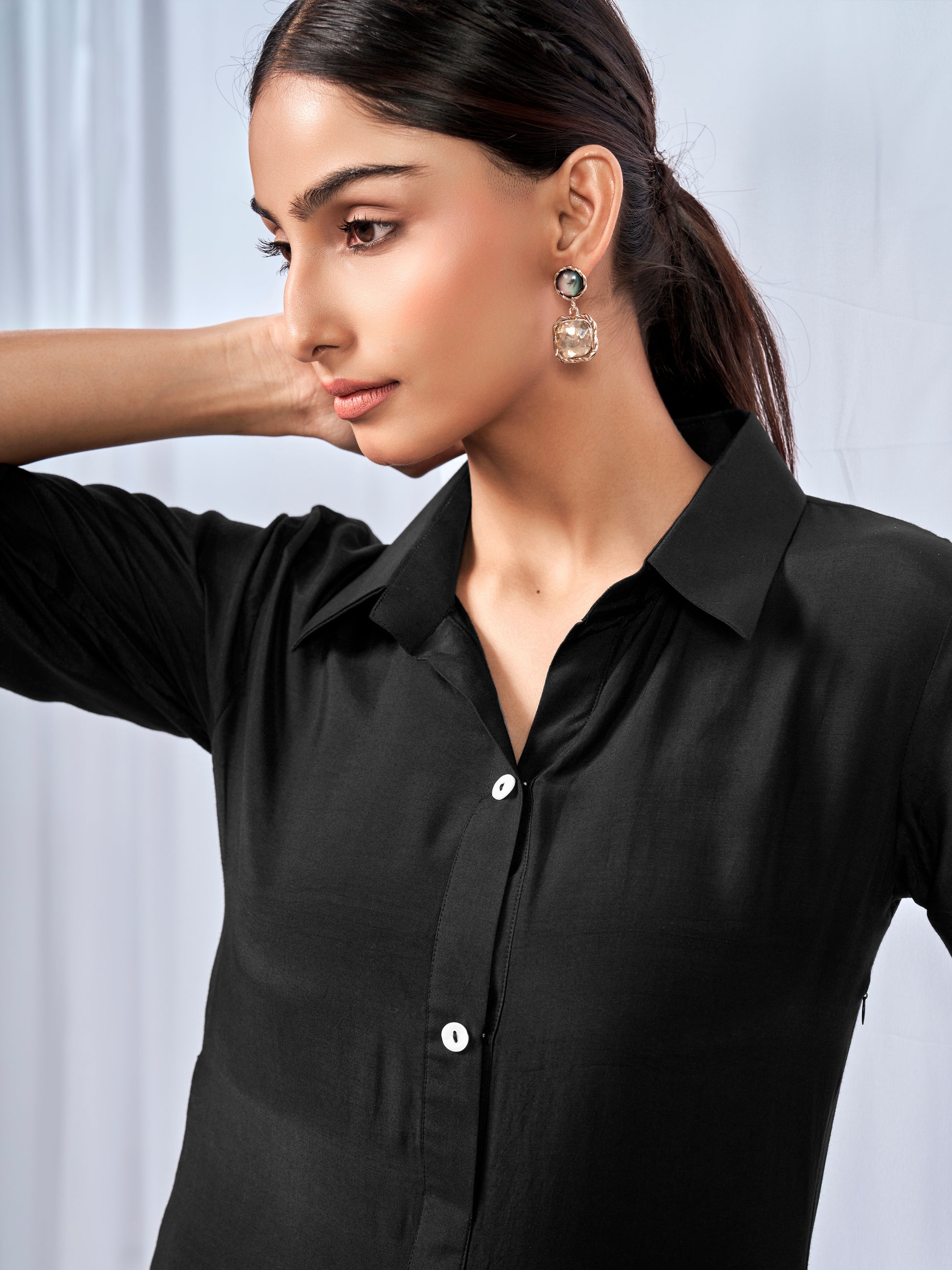 A chic black co-ord set featuring a collared neck with button detail, box pleats, and elbow-length sleeves. Perfect for office wear and everyday elegance.
