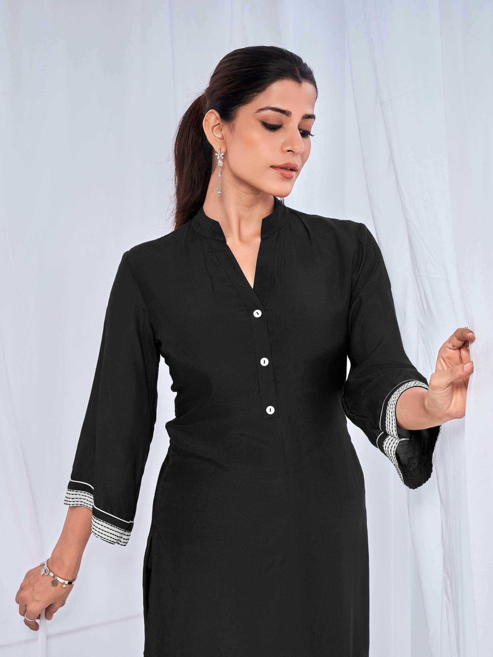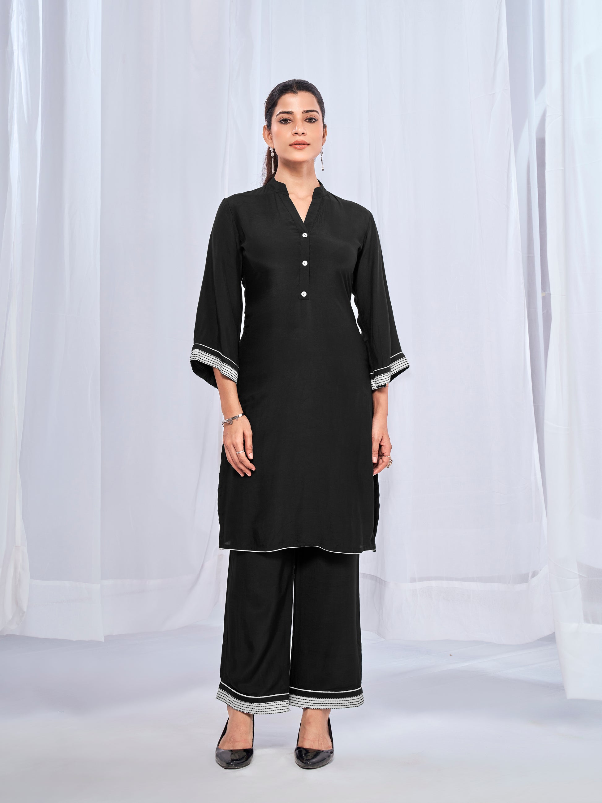 Elegant black coord set with kurta and trousers, featuring white borders on sleeves and hem, detailed with subtle black stitching. Perfect for casual, office, or festive wear.