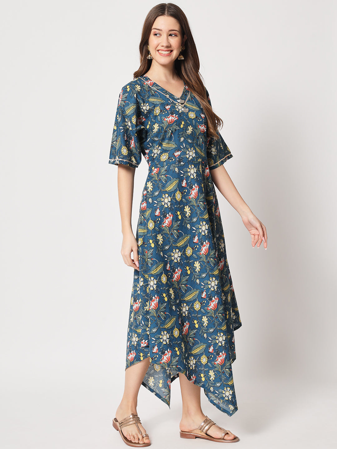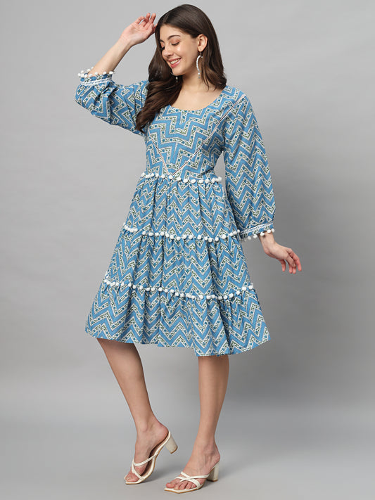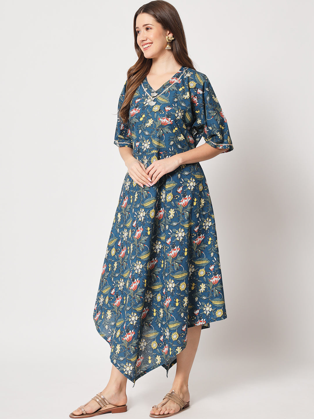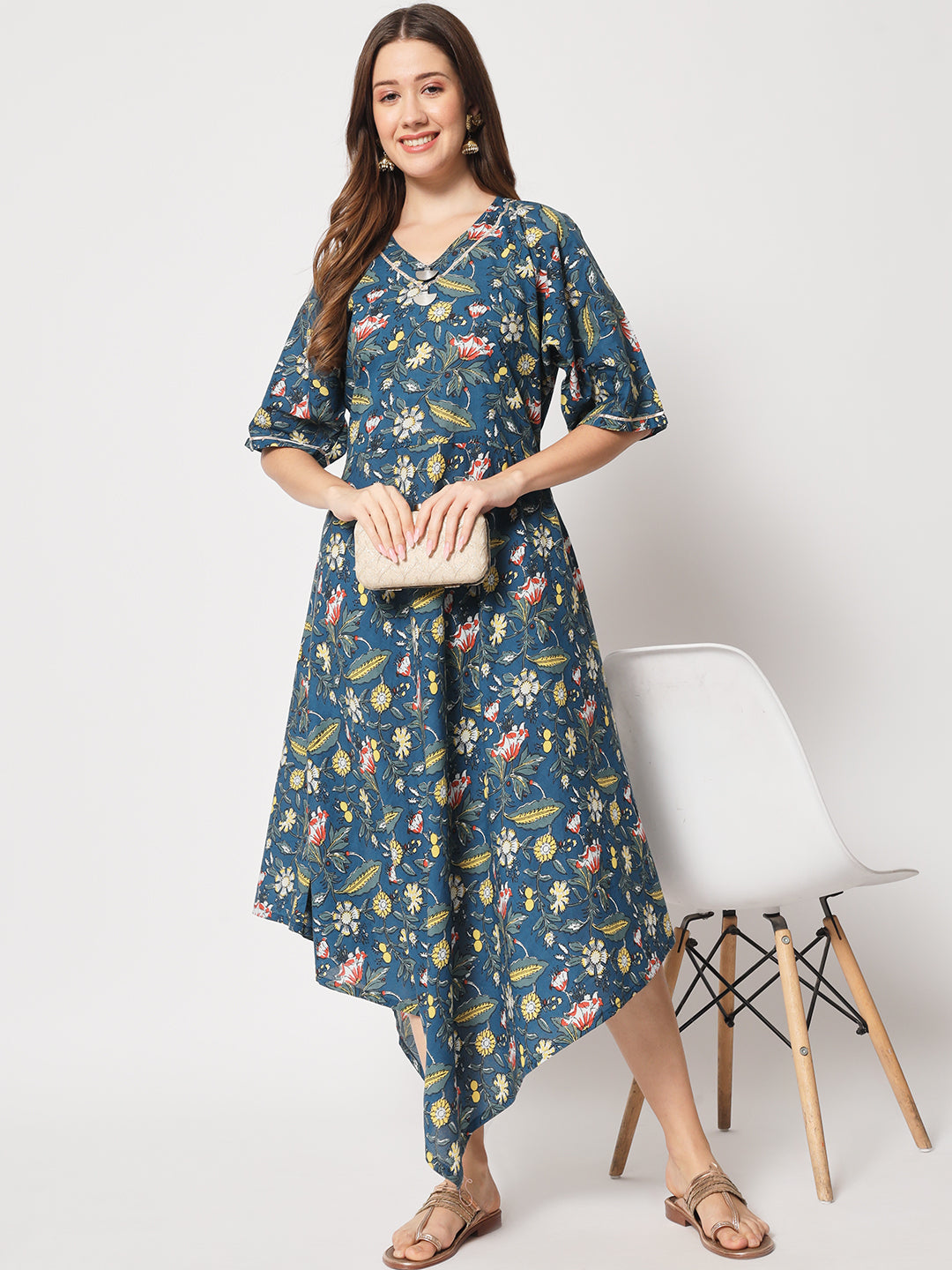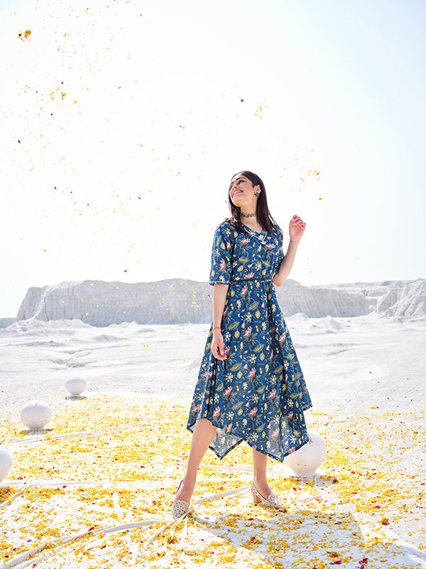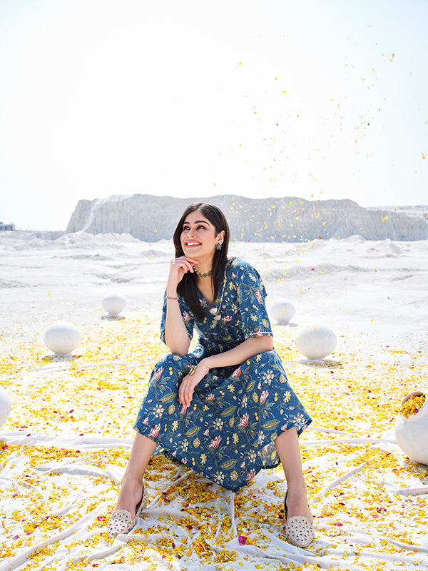 Stay cool and stylish this season with a breezy blue printed midi dress that’s perfect for sunny days and casual outings.