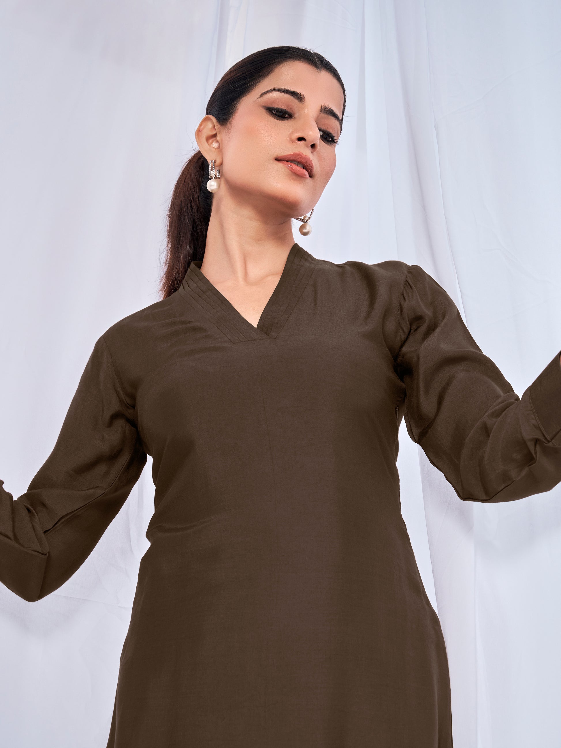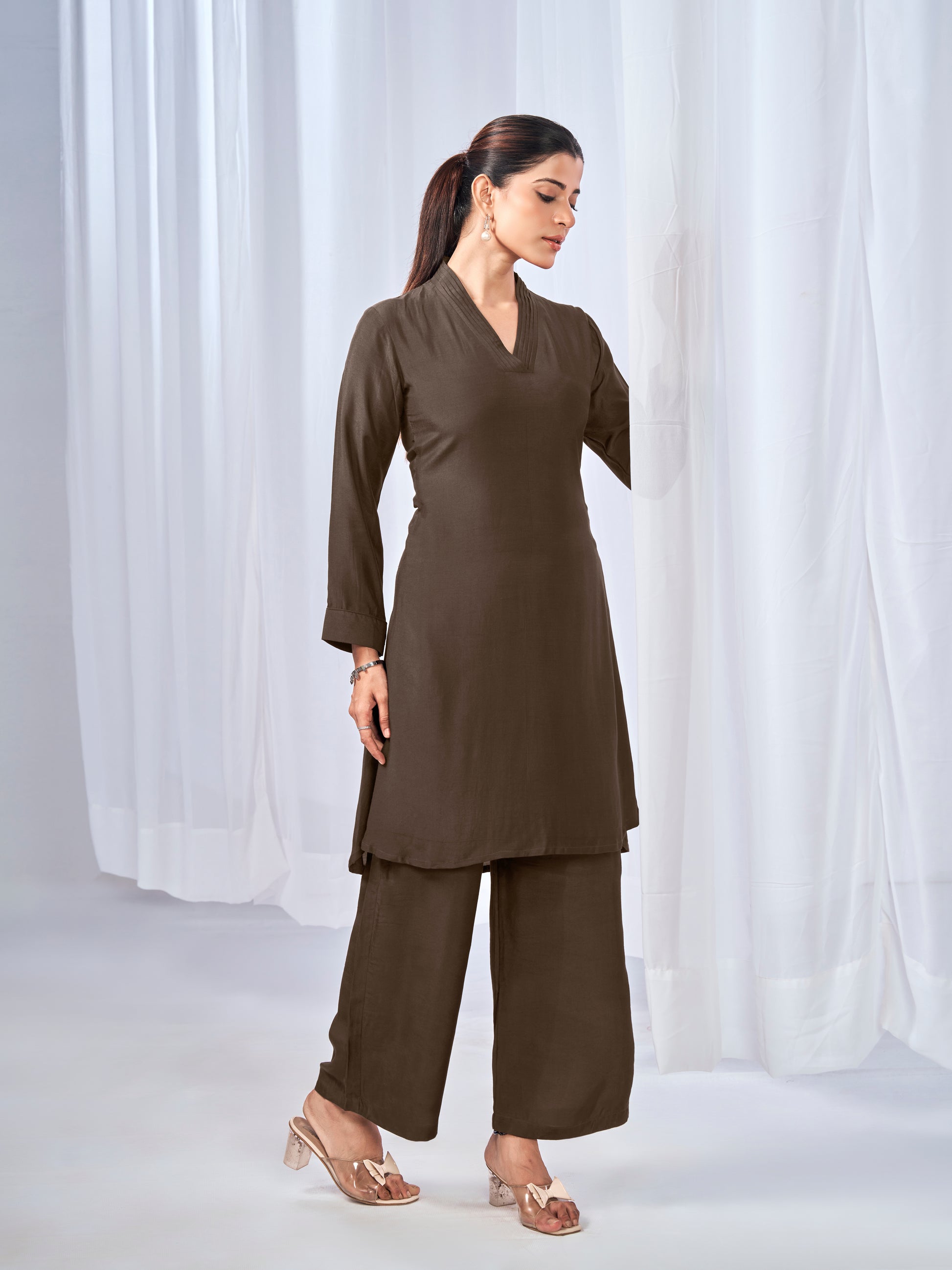 Stylish brown coord set featuring subtle stitch detailing on the neckline for a sophisticated, elegant look. Perfect for casual, office, or semi-formal occasions.