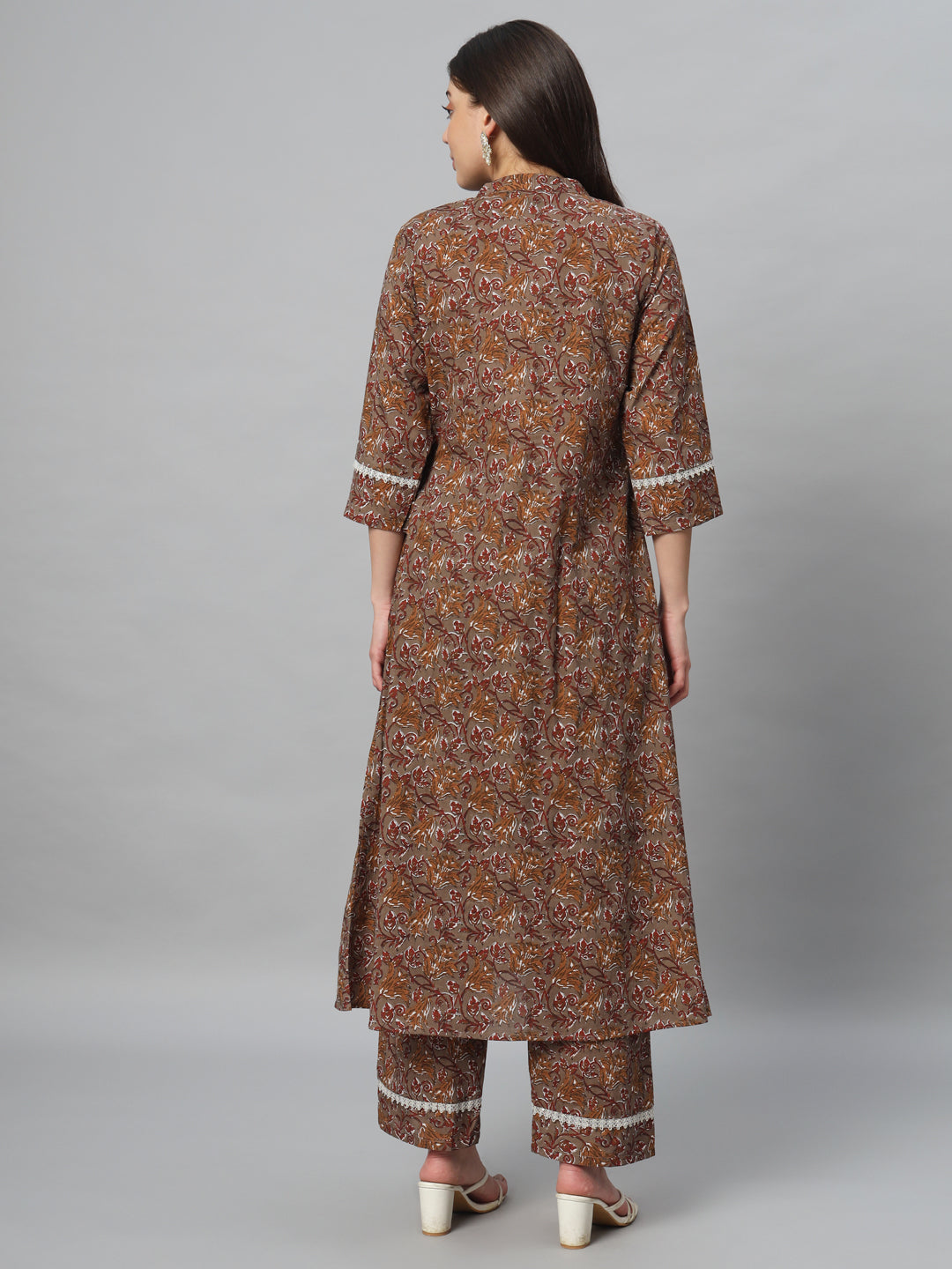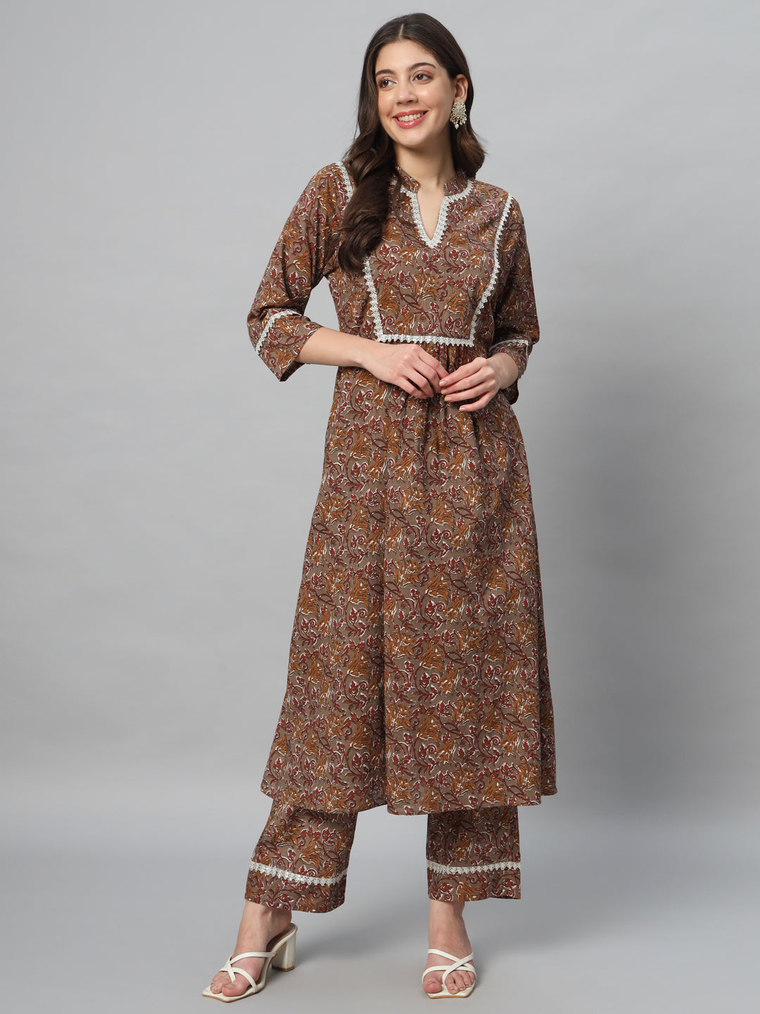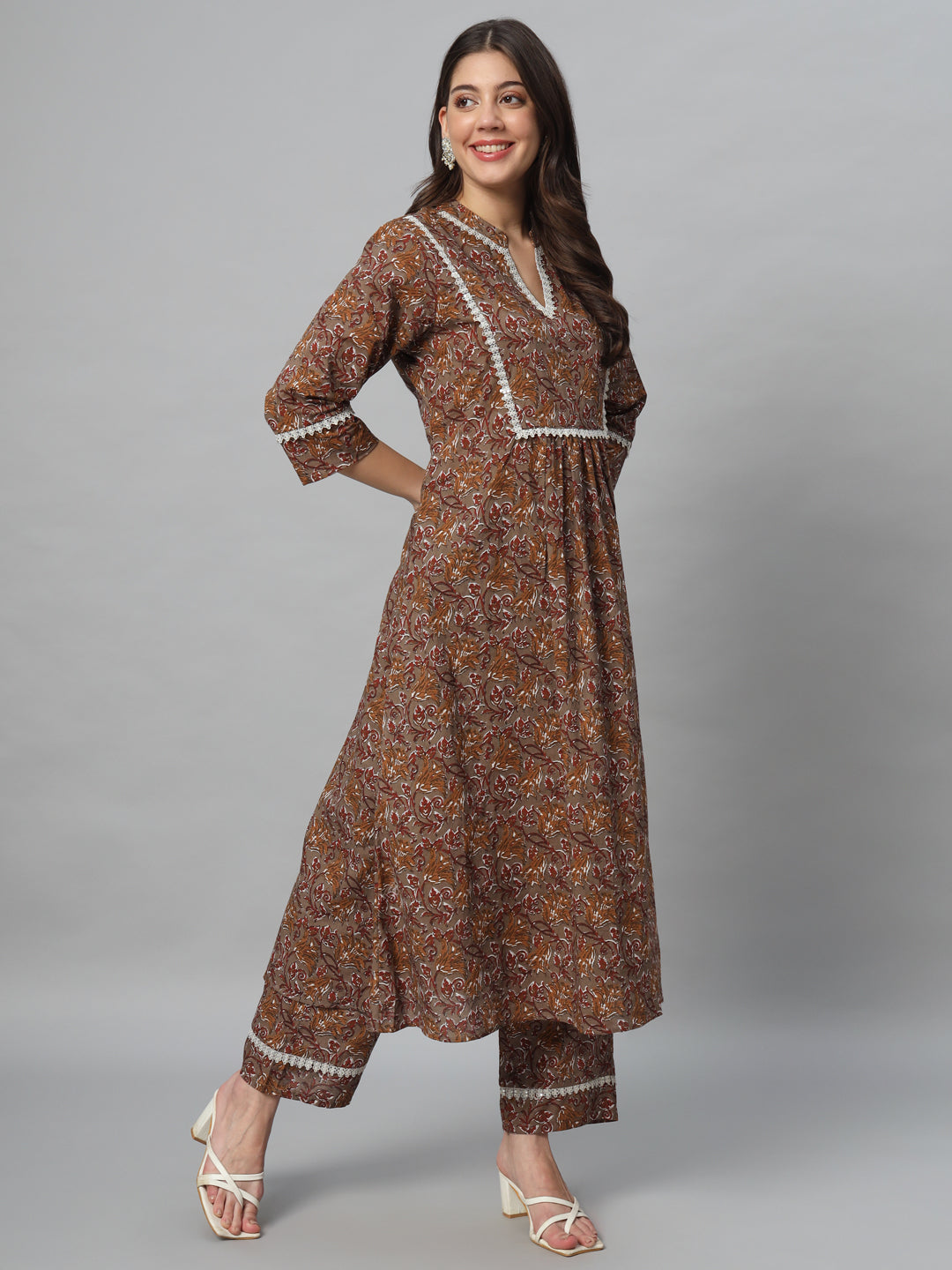 This comfortable brown kurta set is perfect for everyday wear. It features a printed design with delicate lace accents on the yoke, sleeves, and pants, combining style with ease. Ideal for casual outings and daily wear.
