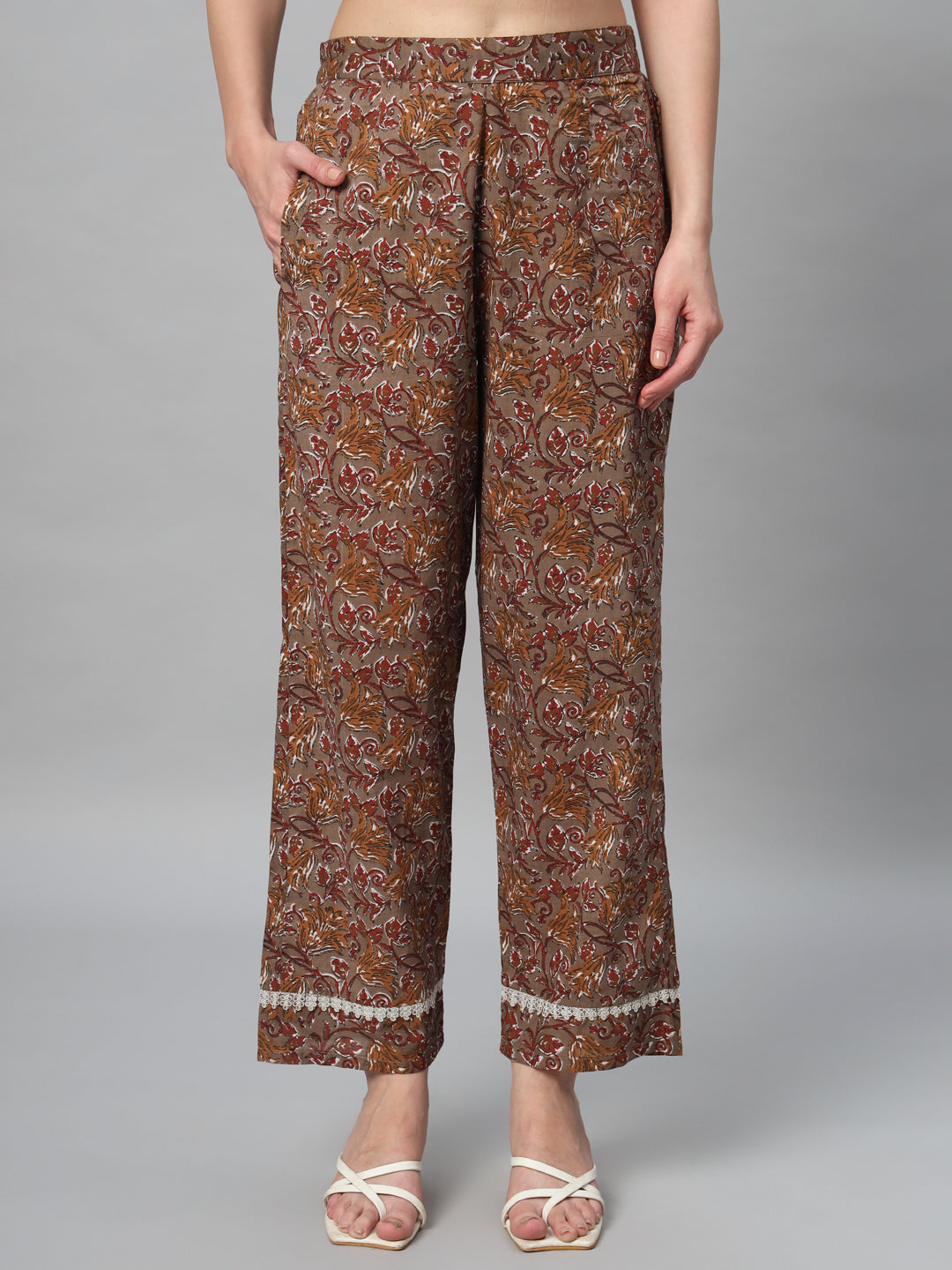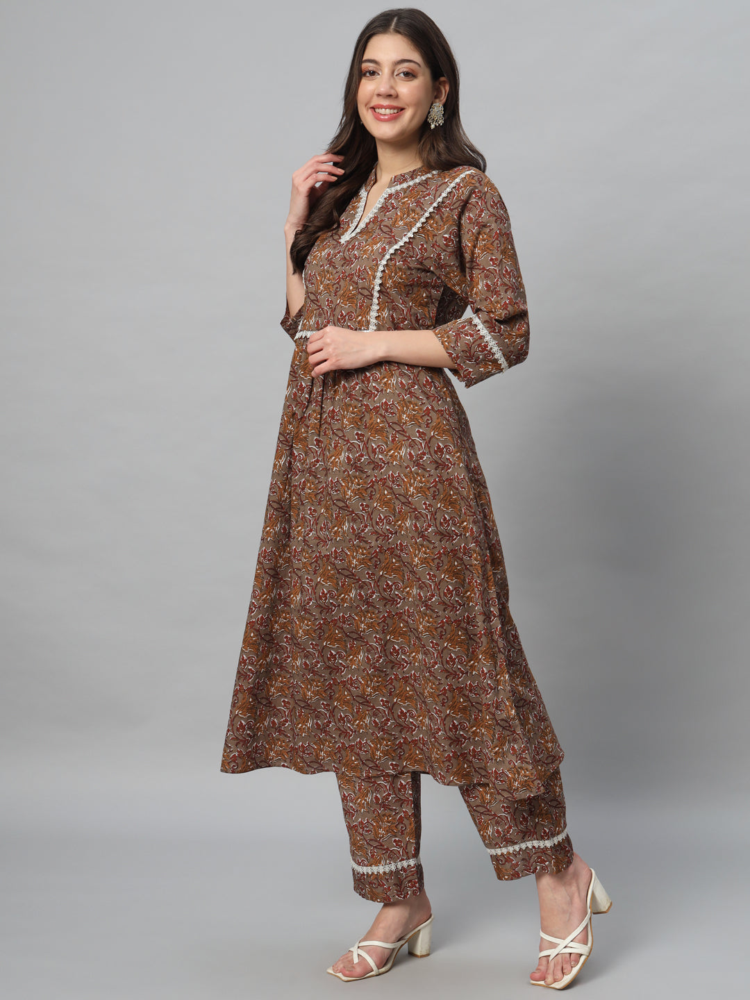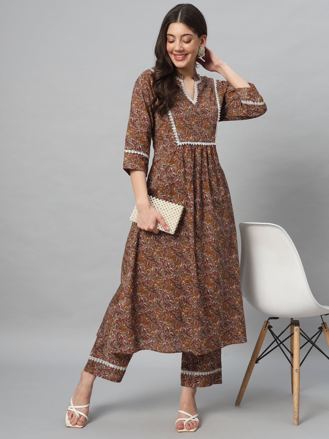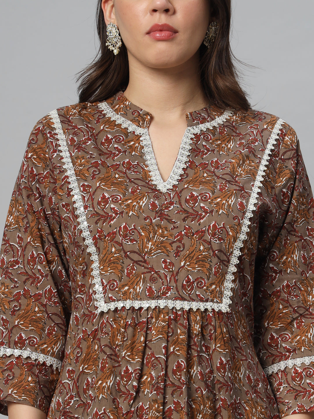 This comfortable brown kurta set is perfect for everyday wear. It features a printed design with delicate lace accents on the yoke, sleeves, and pants, combining style with ease. Ideal for casual outings and daily wear.
