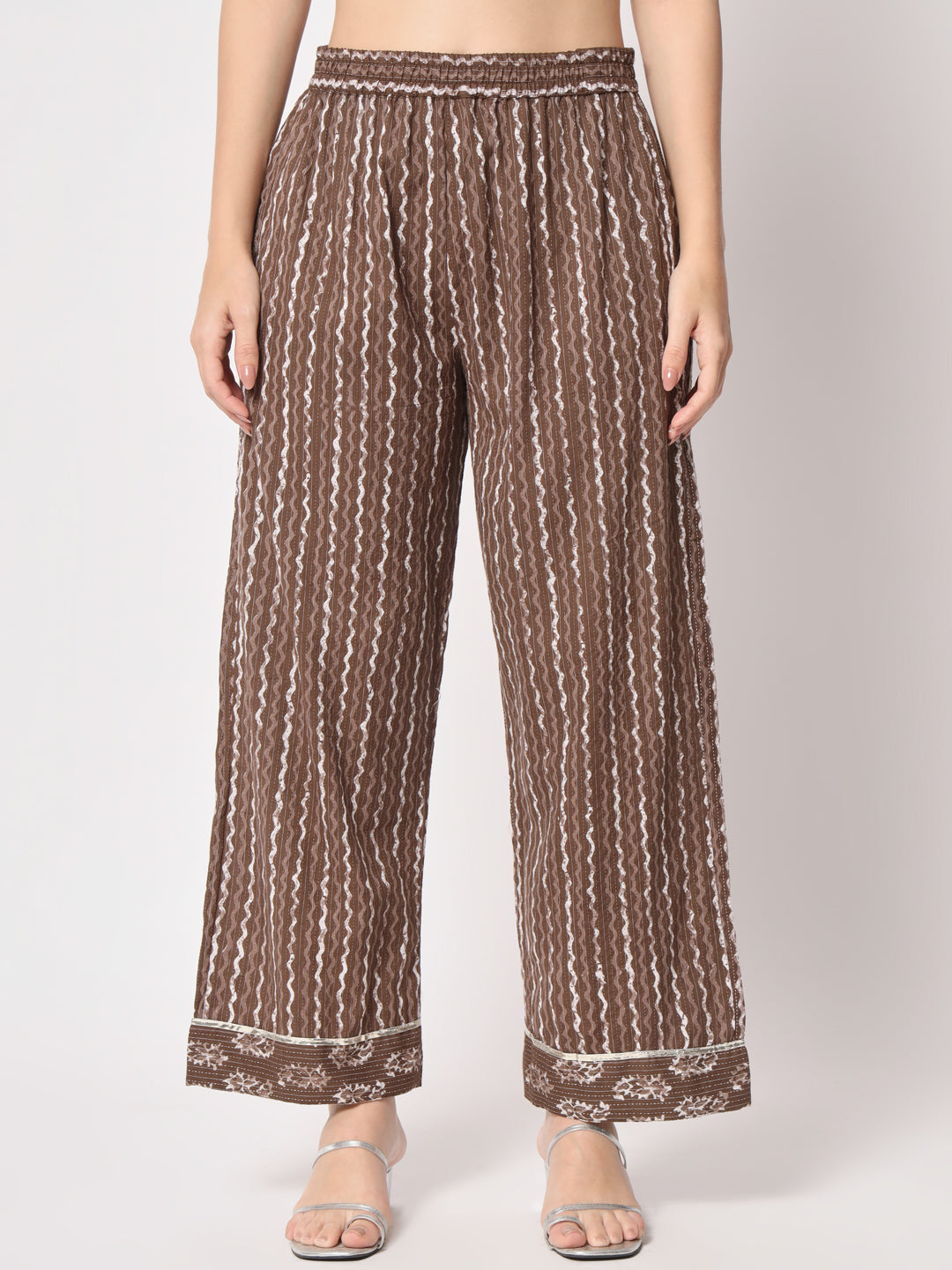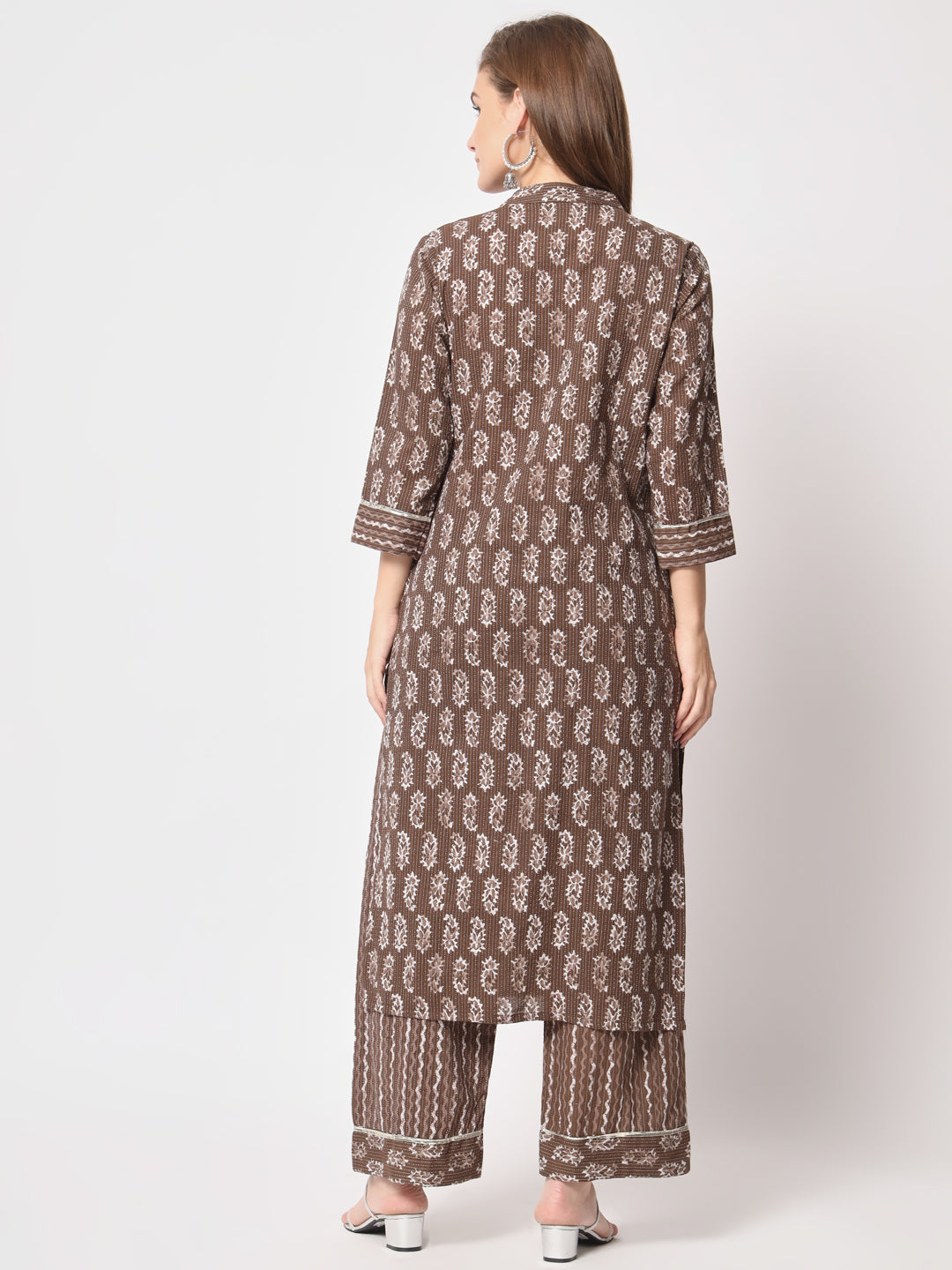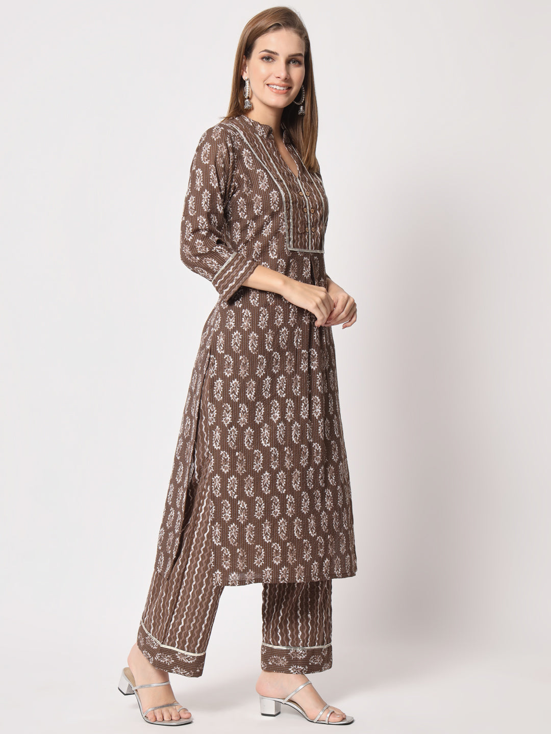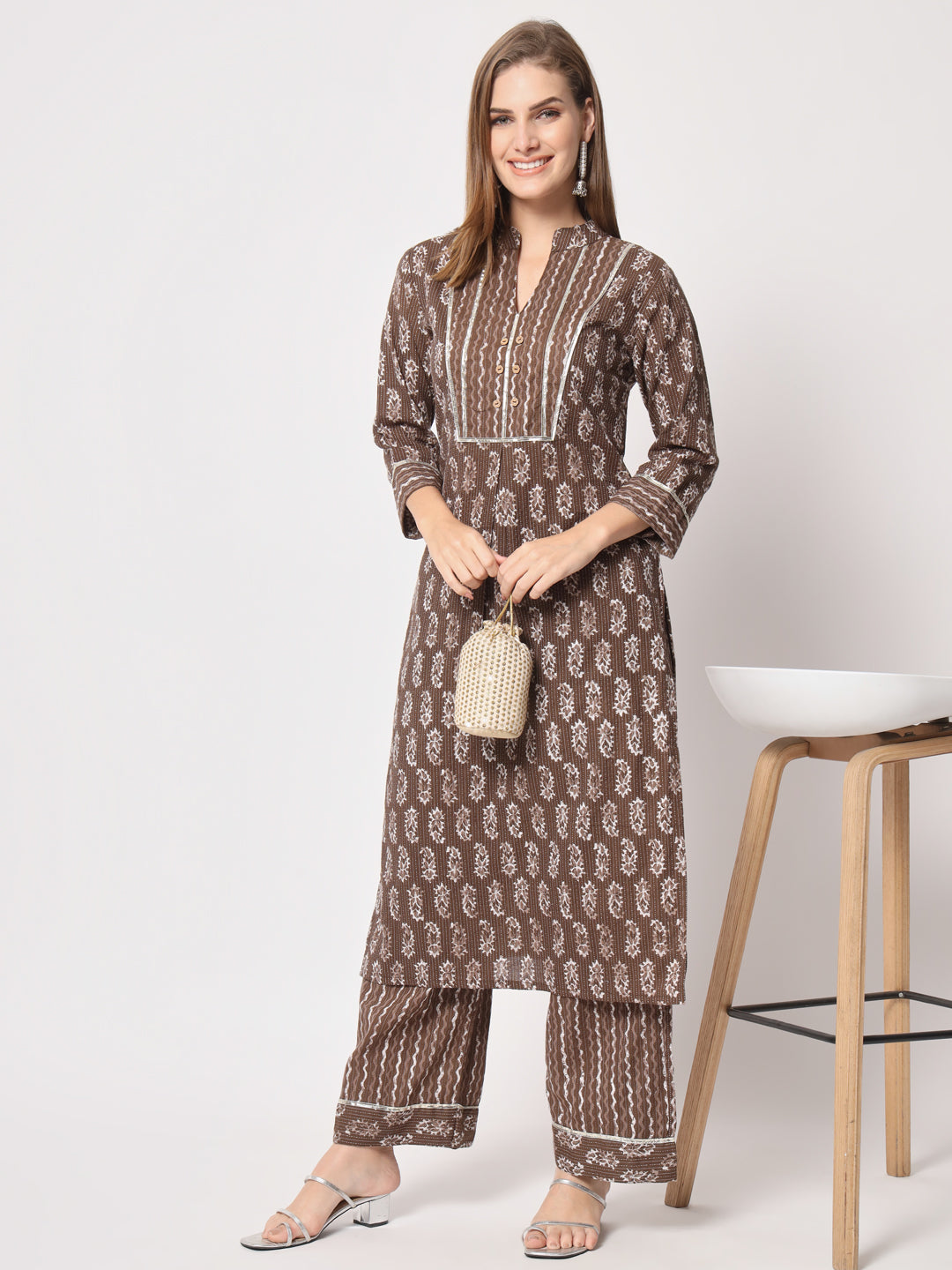 This stylish brown cotton kurti set features a printed kurta with gota detailing on the yoke, center buttons, and delicate accents on the sleeves and hem. It’s paired with matching zig-zag printed trousers finished with subtle gota work, offering a perfect blend of tradition and trend