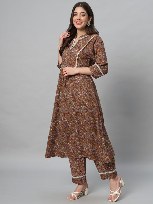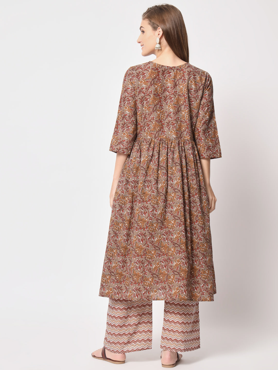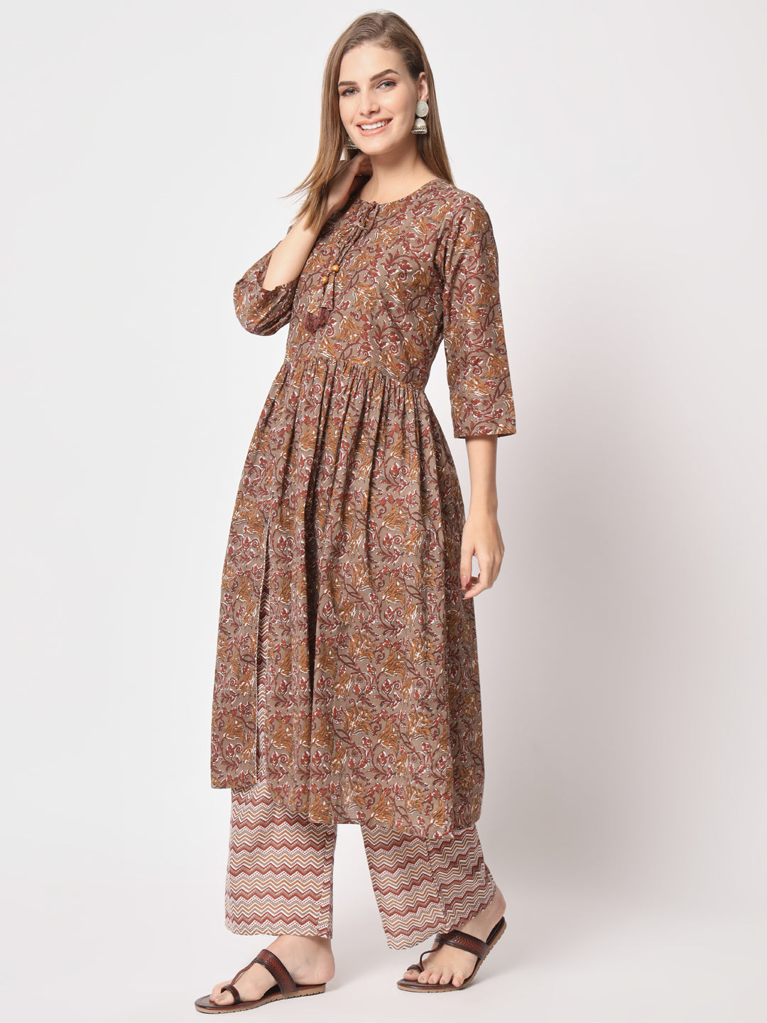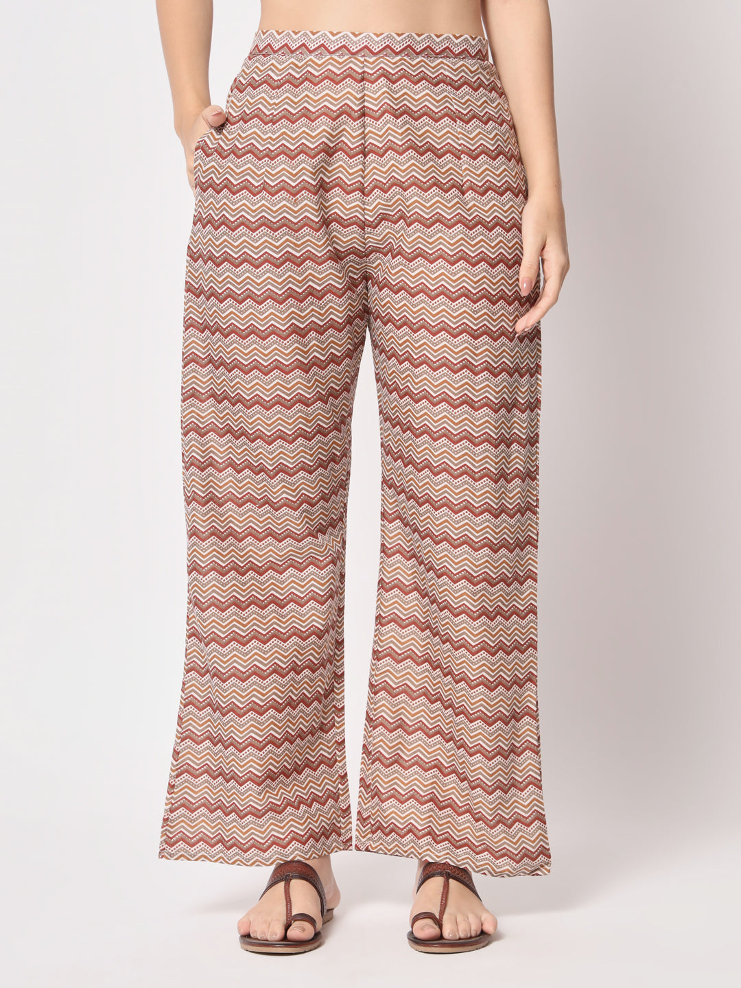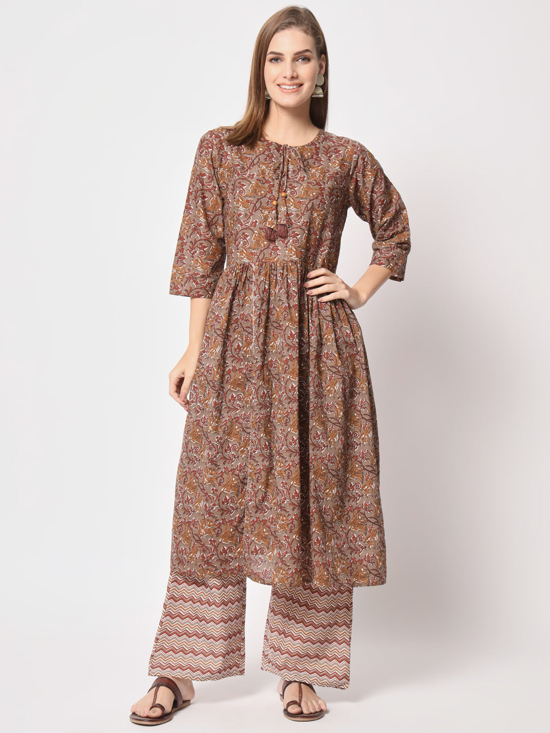 Embrace this everyday pick – brown kurta with a tassel knot neckline paired with zigzag print pants brings comfort and subtle flair together.
