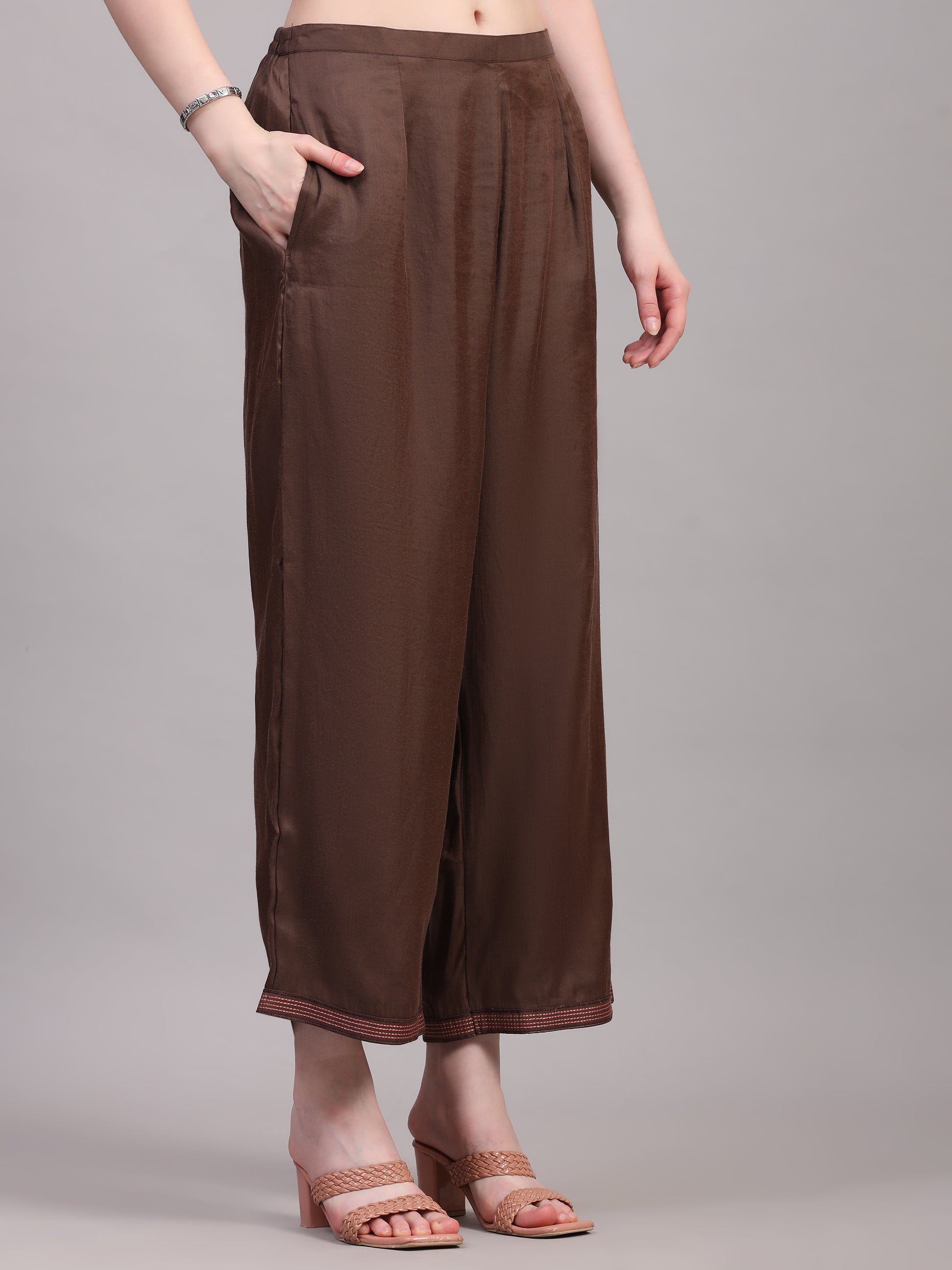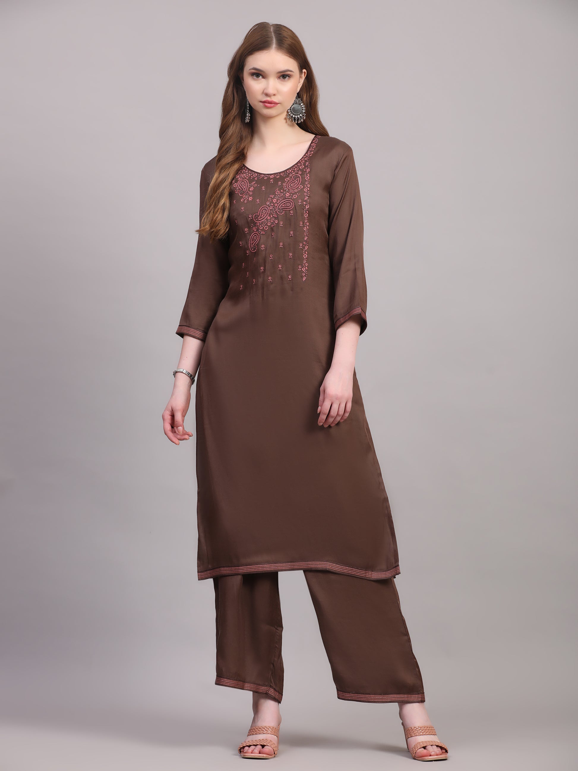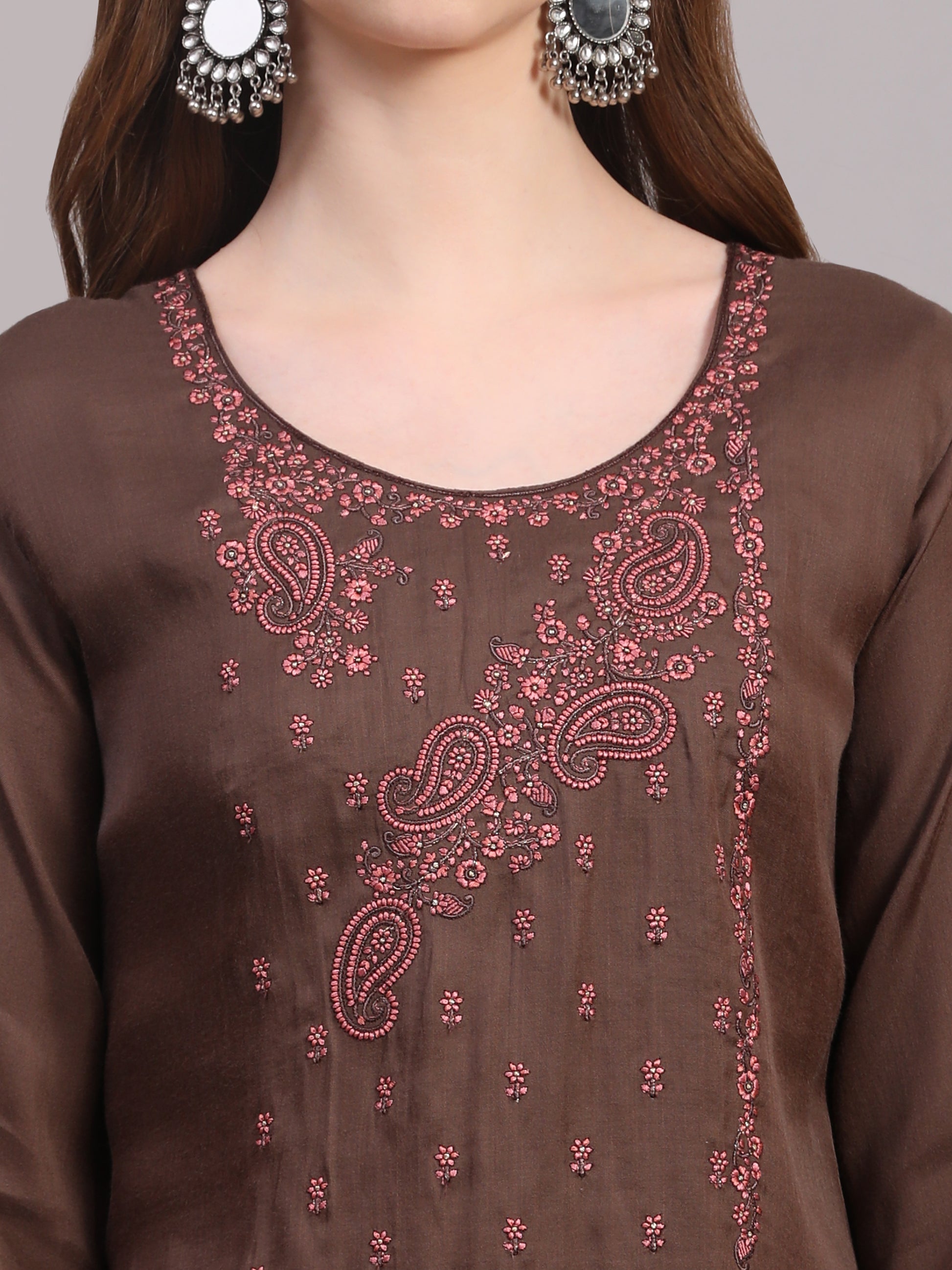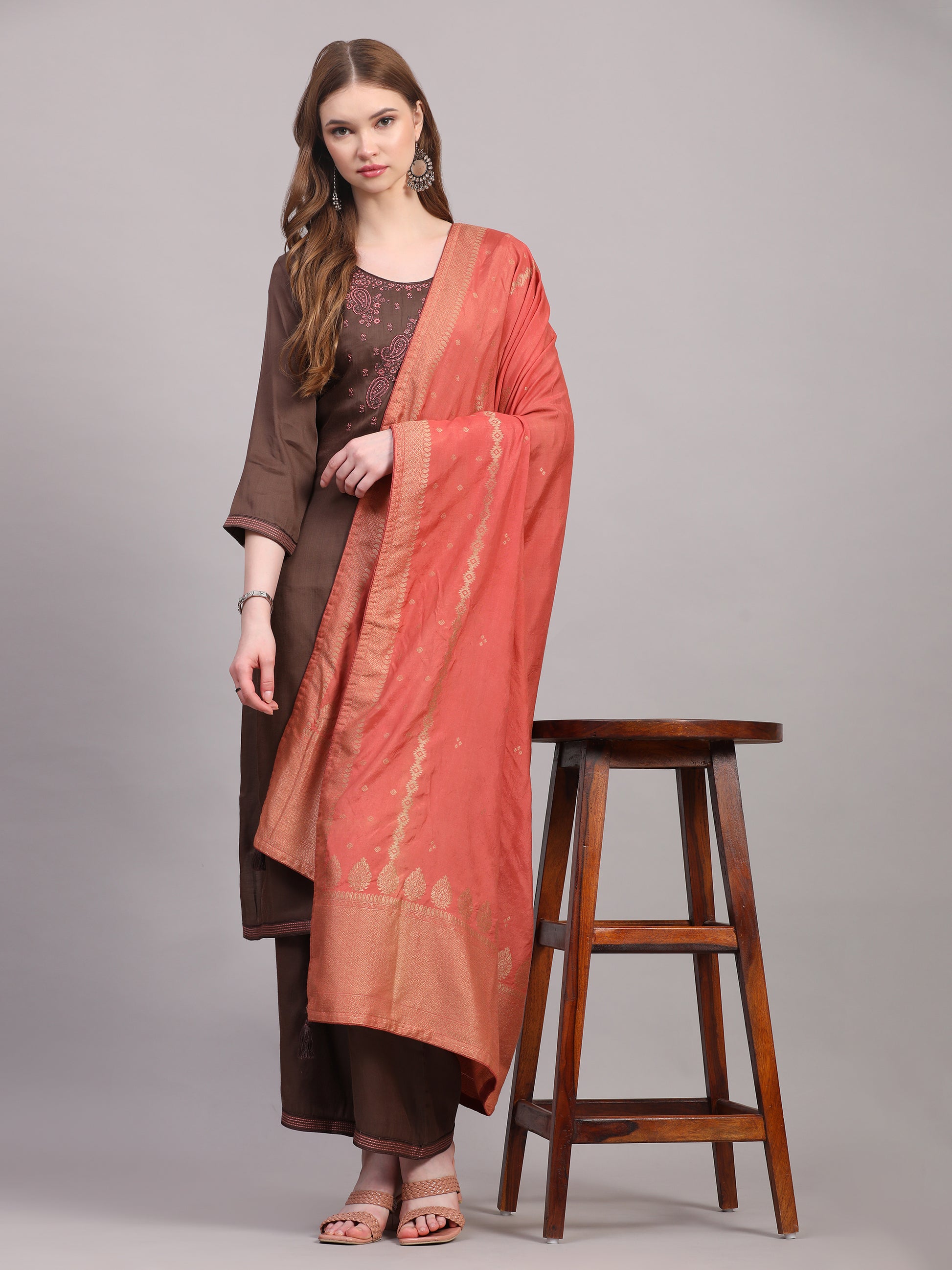 A timeless blend of elegance and tradition, this brown three-piece suit set is crafted in a rich viscose silk blend that drapes beautifully. The kurta features heavy embroidery on the front, adding depth and festive charm, while the zari detailing on the sleeves and trouser hems lends a delicate handcrafted finish. The look is completed with a soft, flowy Dola silk dupatta, bringing in subtle sheen and graceful movement — perfect for festive gatherings or evening occasions.