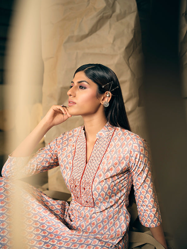 Blue and pink side cut straight kurti with mandarin collar and handprinted pegged pants.