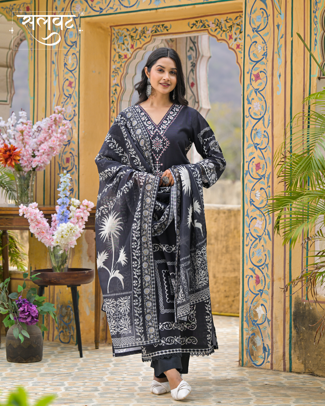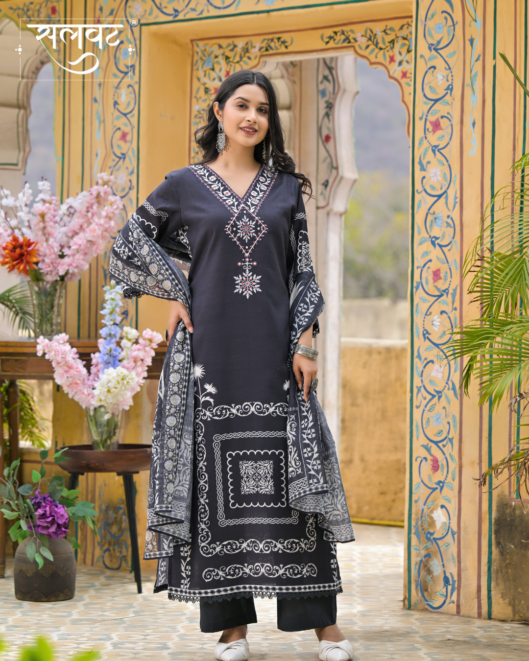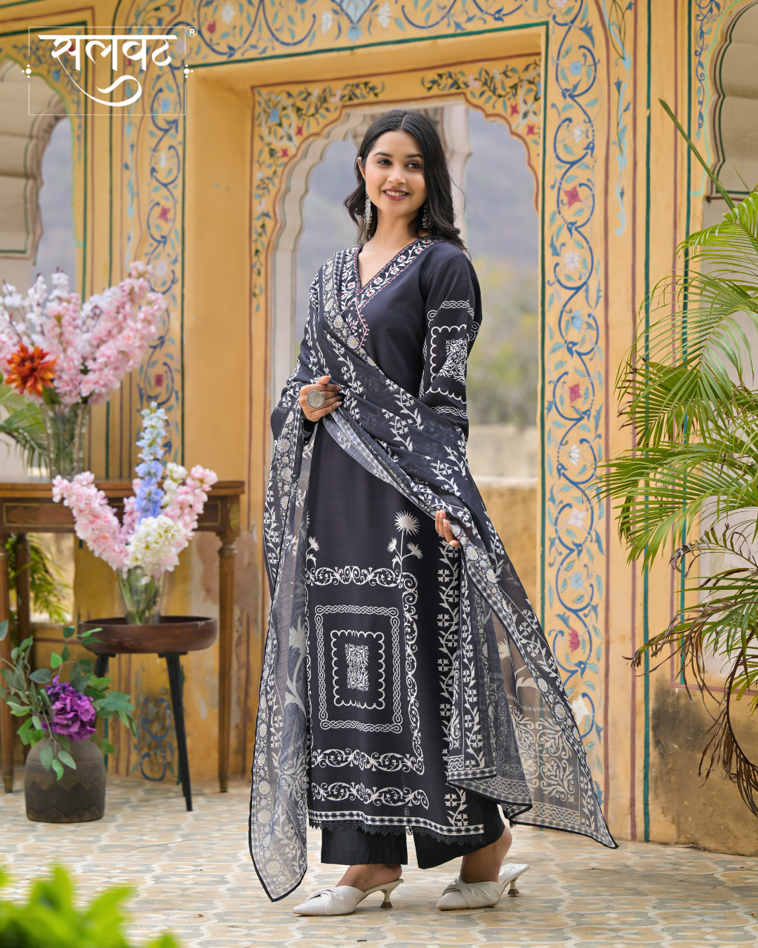 Charcoal Black & Cream Heavy Handwork Kurta Set With Printed Dupatta