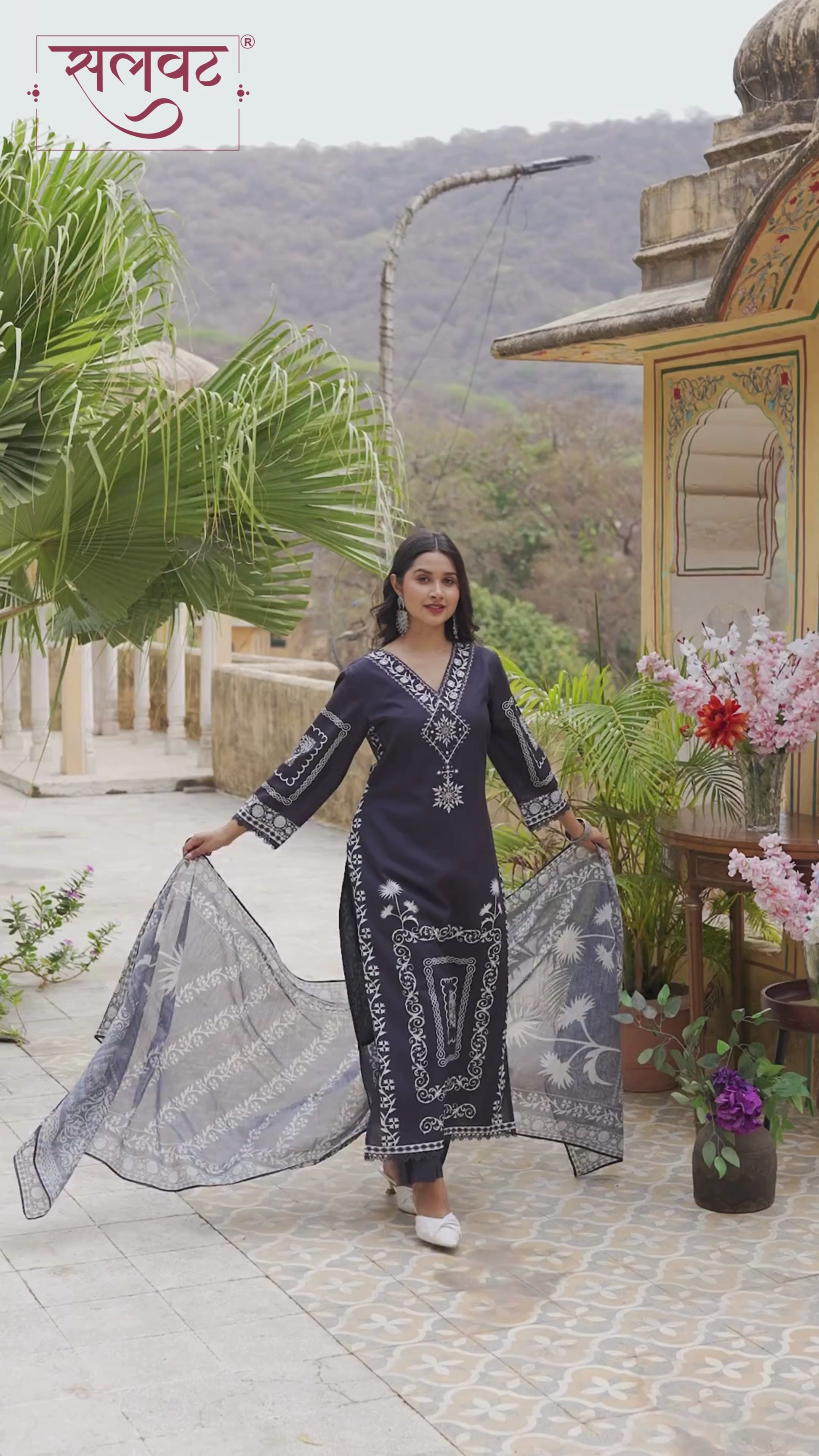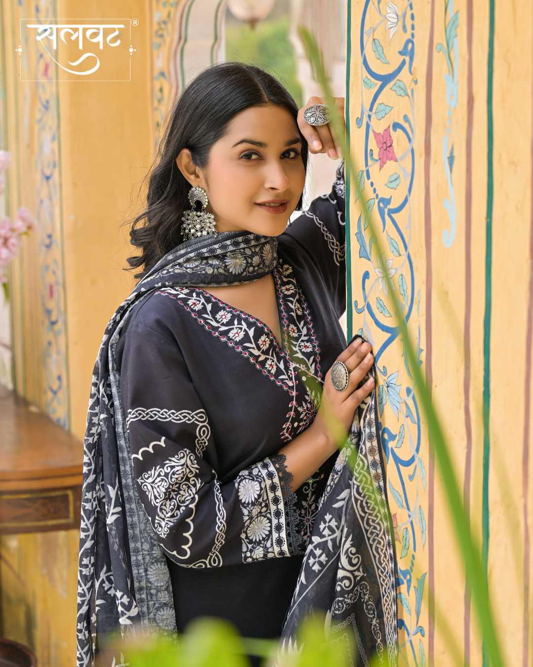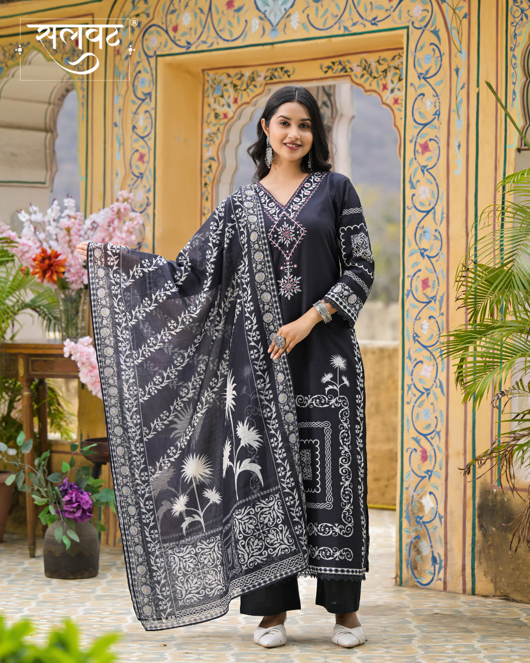 Charcoal Black & Cream Heavy Handwork Kurta Set With Printed Dupatta