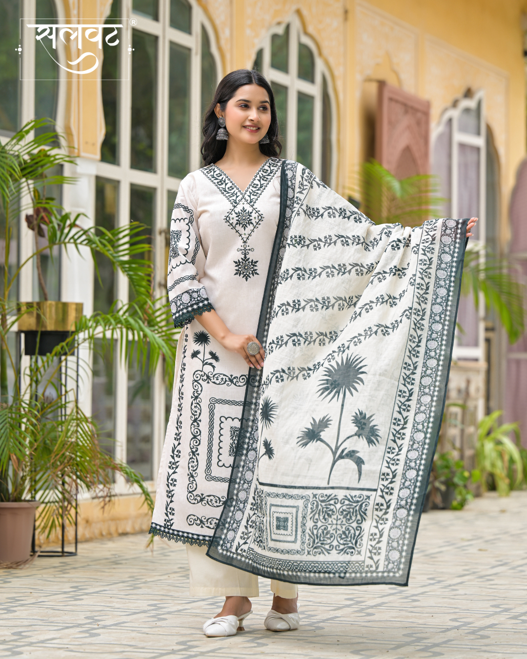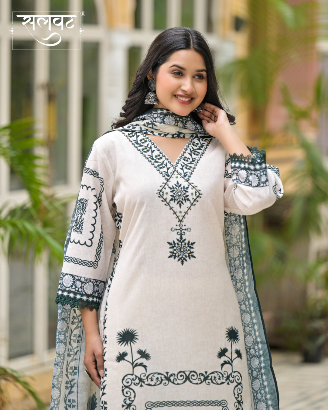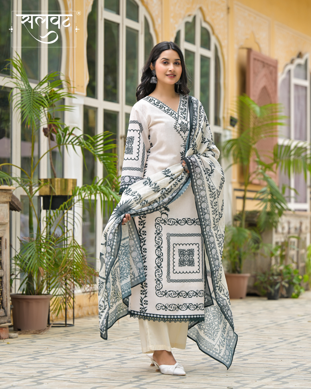 Cream & Green Heavy Handwork Kurta Set With Printed Dupatta