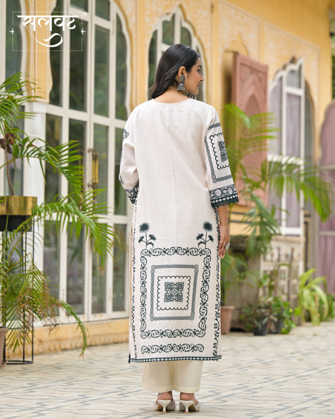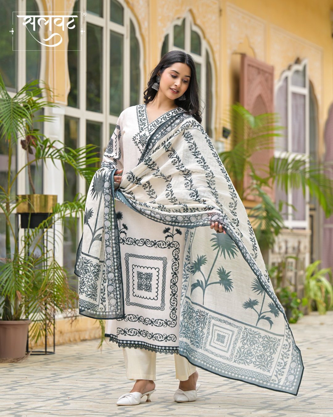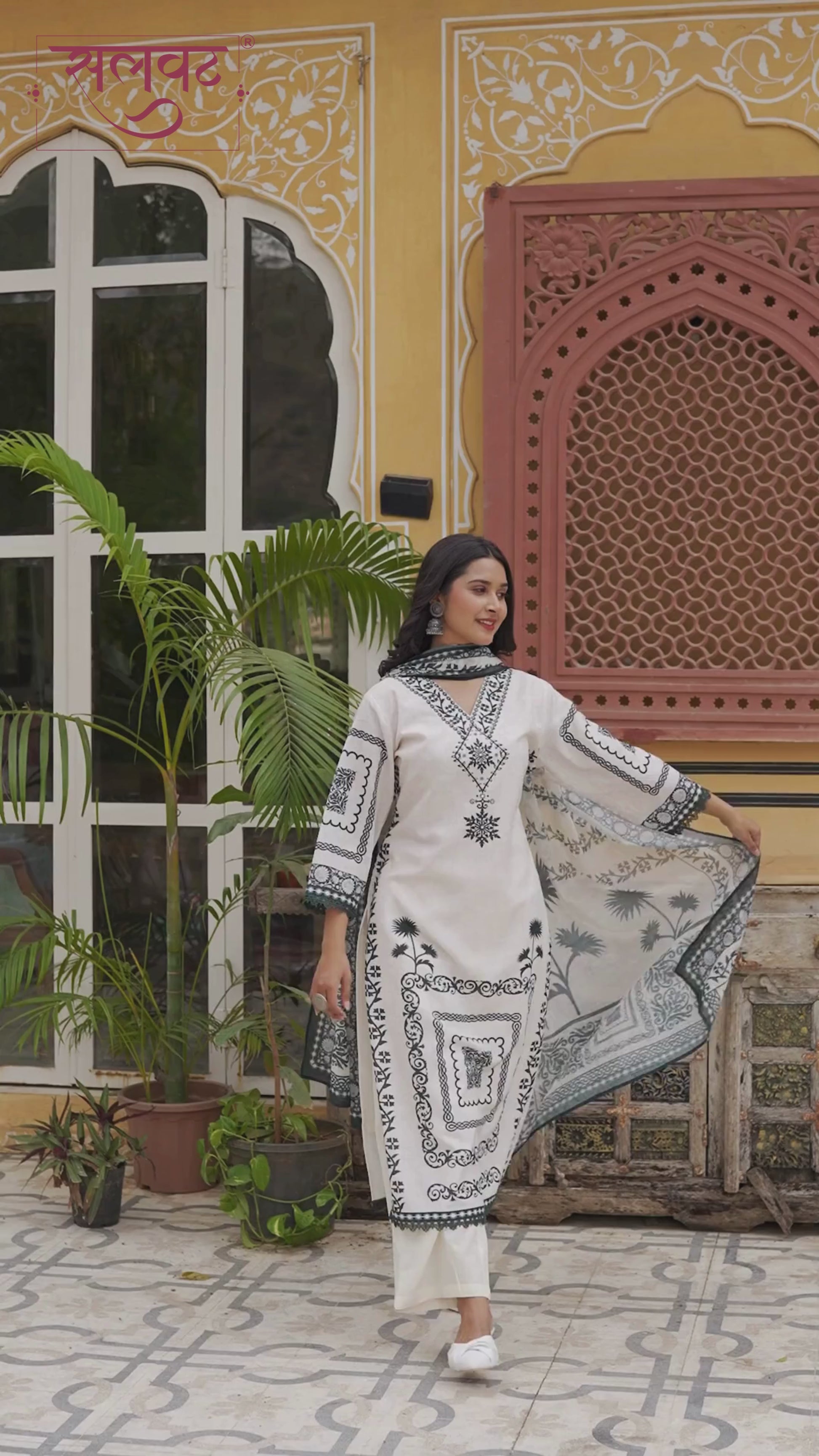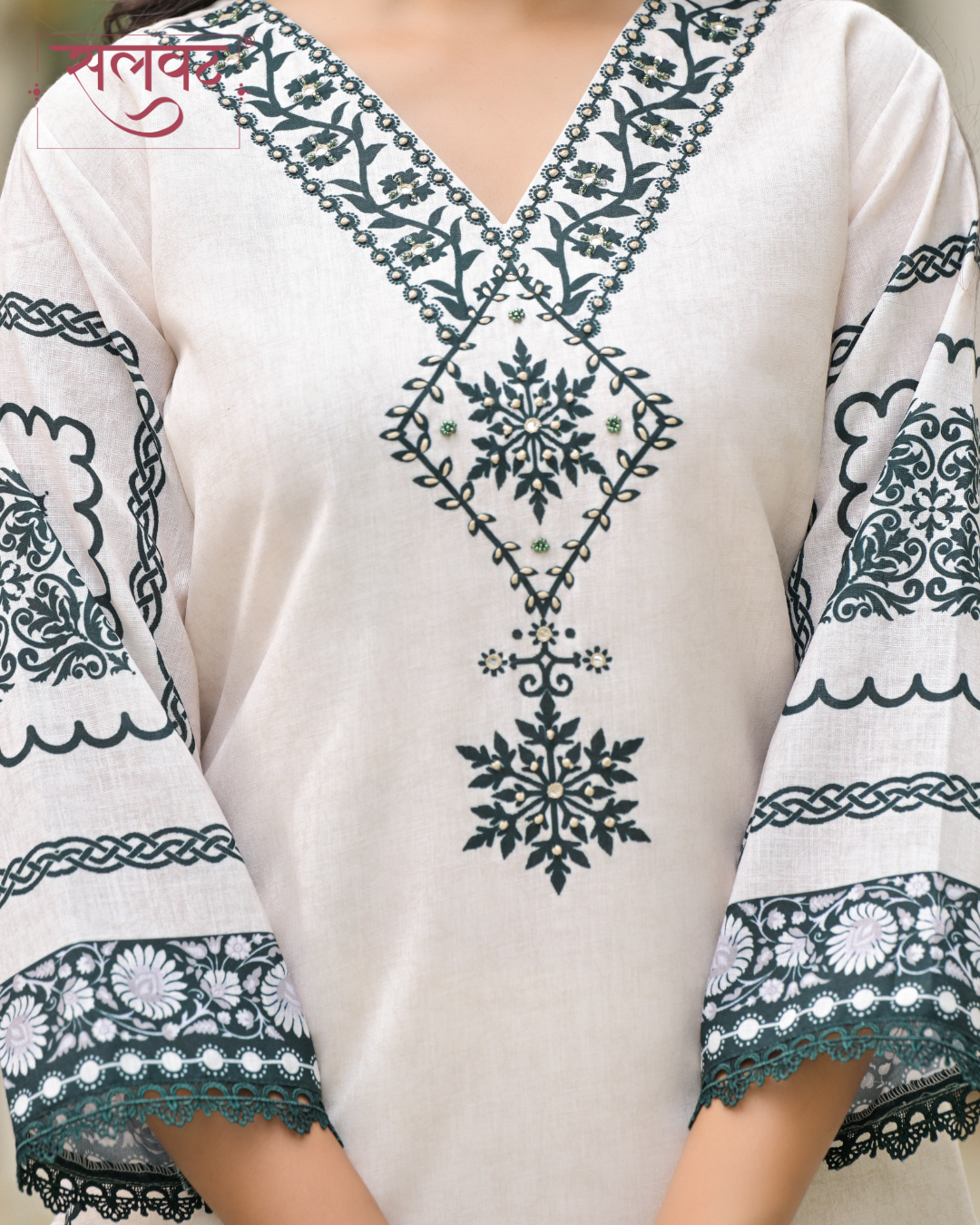 Cream & Green printed kurta set with heavy handwork french knots sequins, beads in neck with digital printed dupatta.