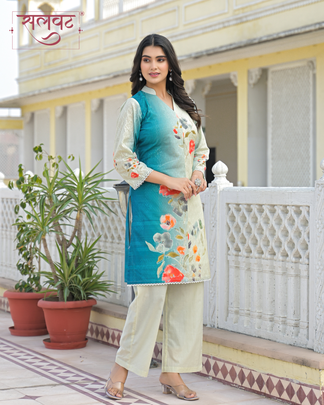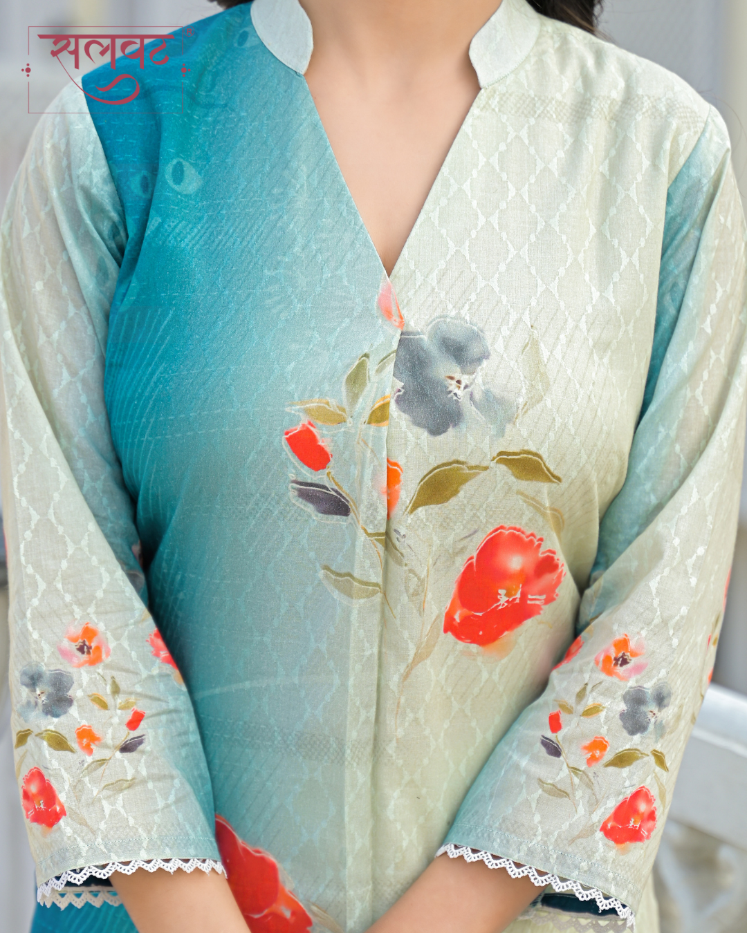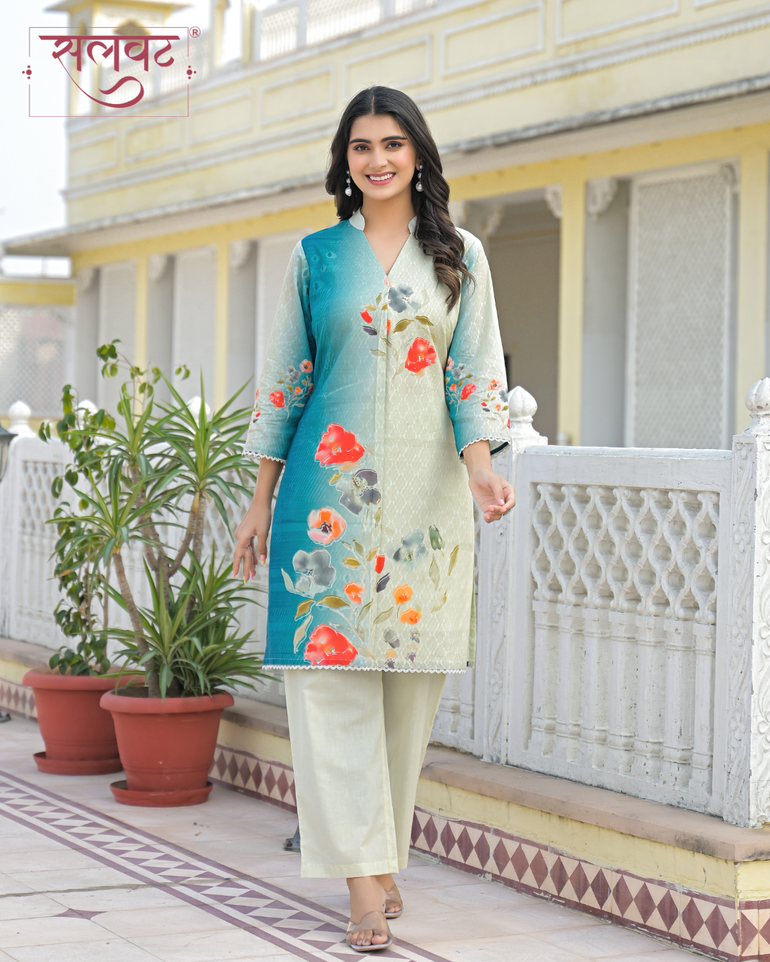 Cream & Turquoise abstract flowers printed kurta set with hand-stitched box pleats.