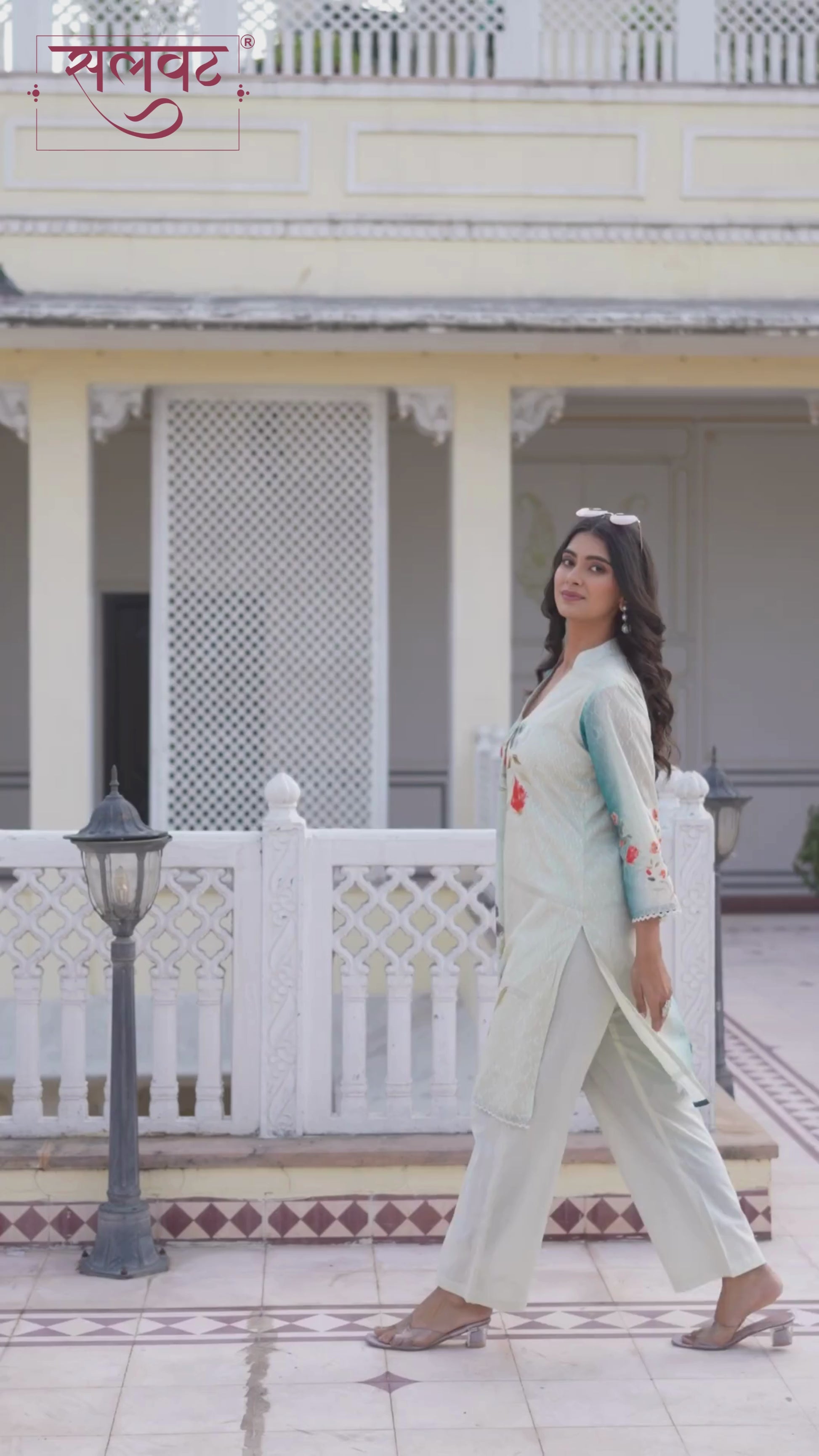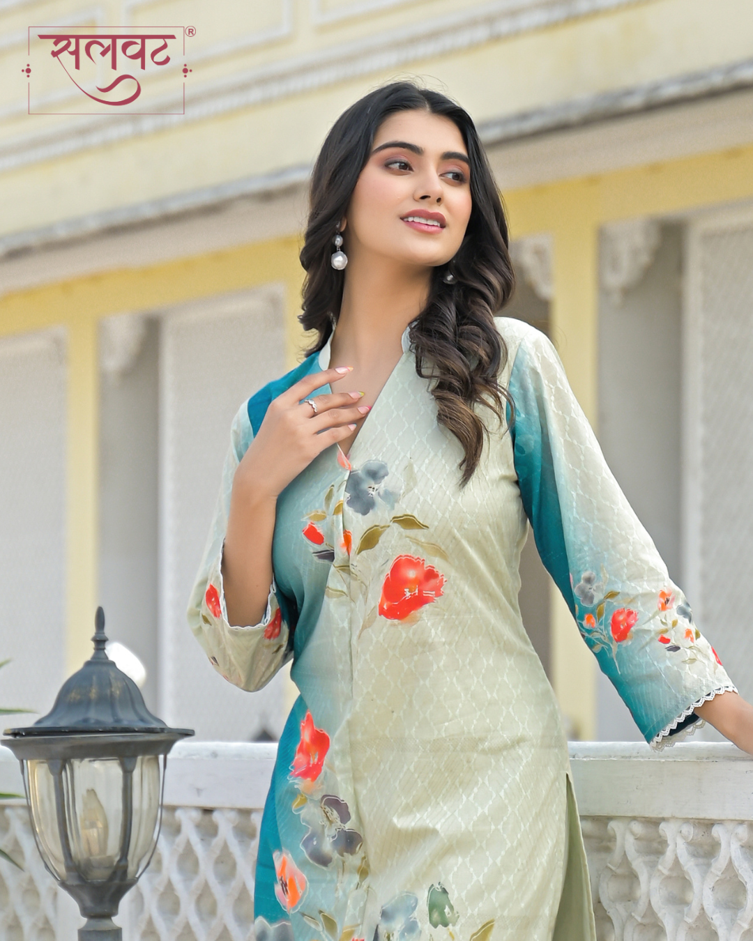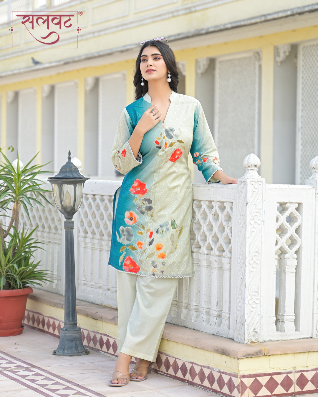 Cream & Turquoise abstract flowers printed kurta set with hand-stitched box pleats.