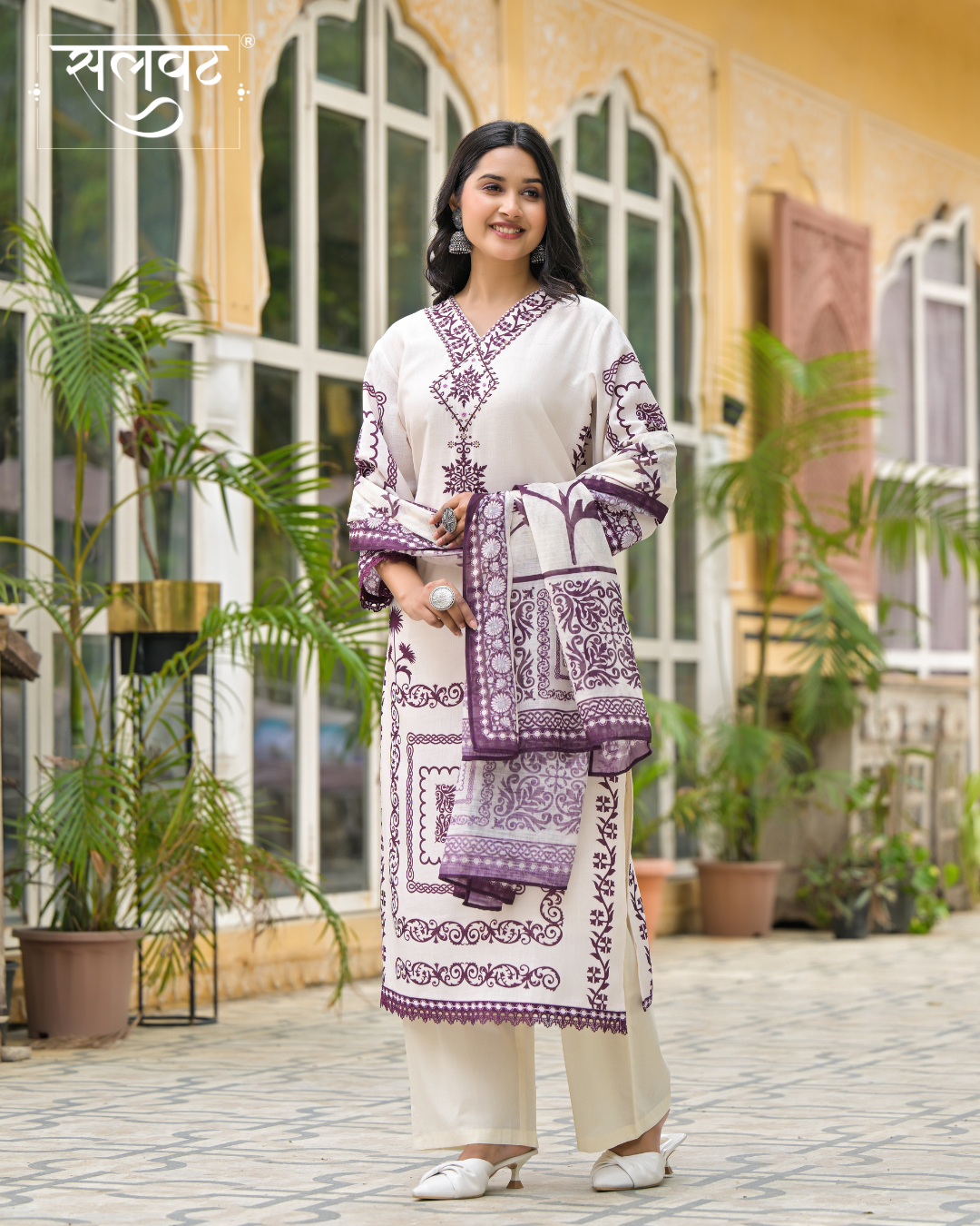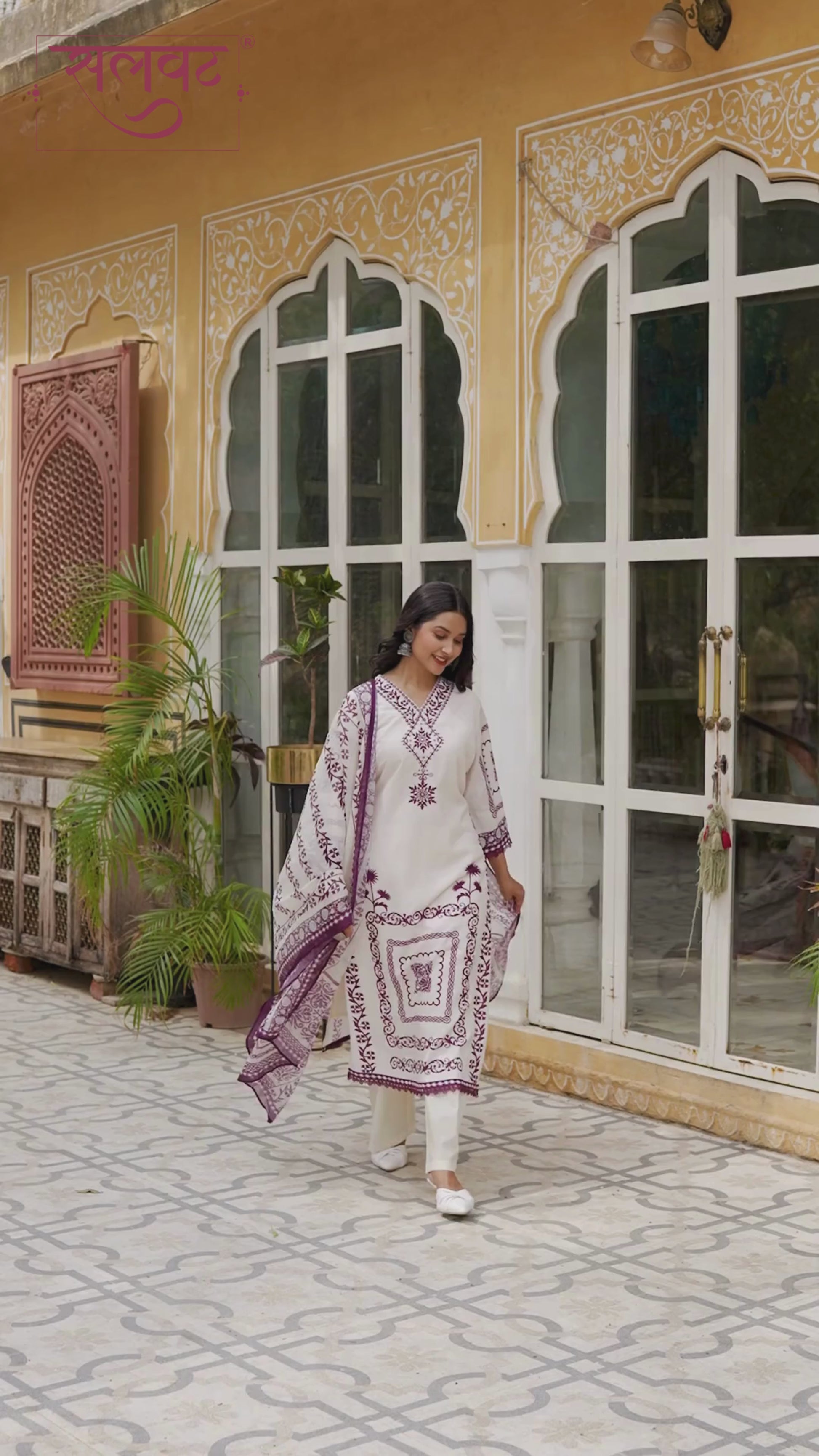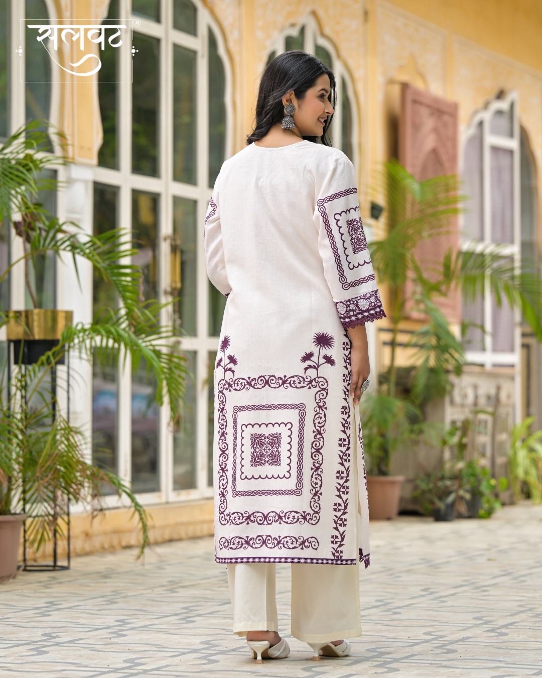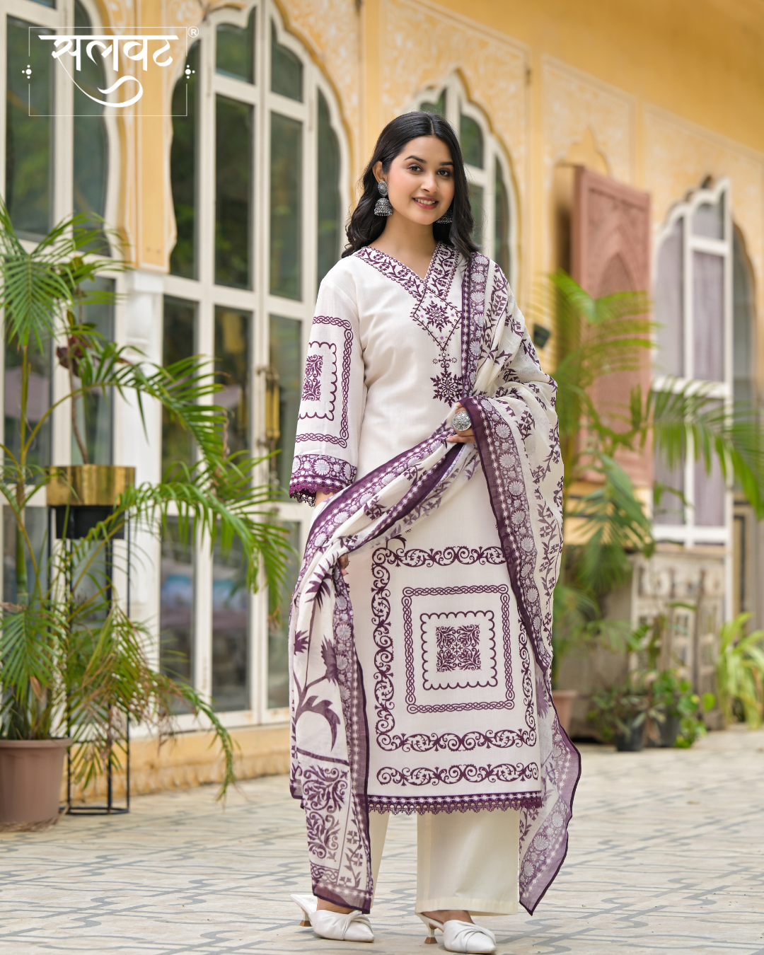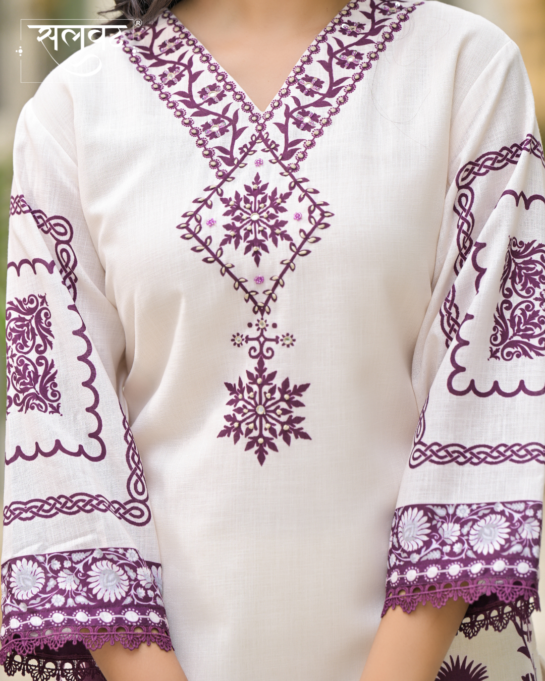 Cream & Wine printed kurta set with heavy handwork french knots sequins, beads in neck with digital printed dupatta.