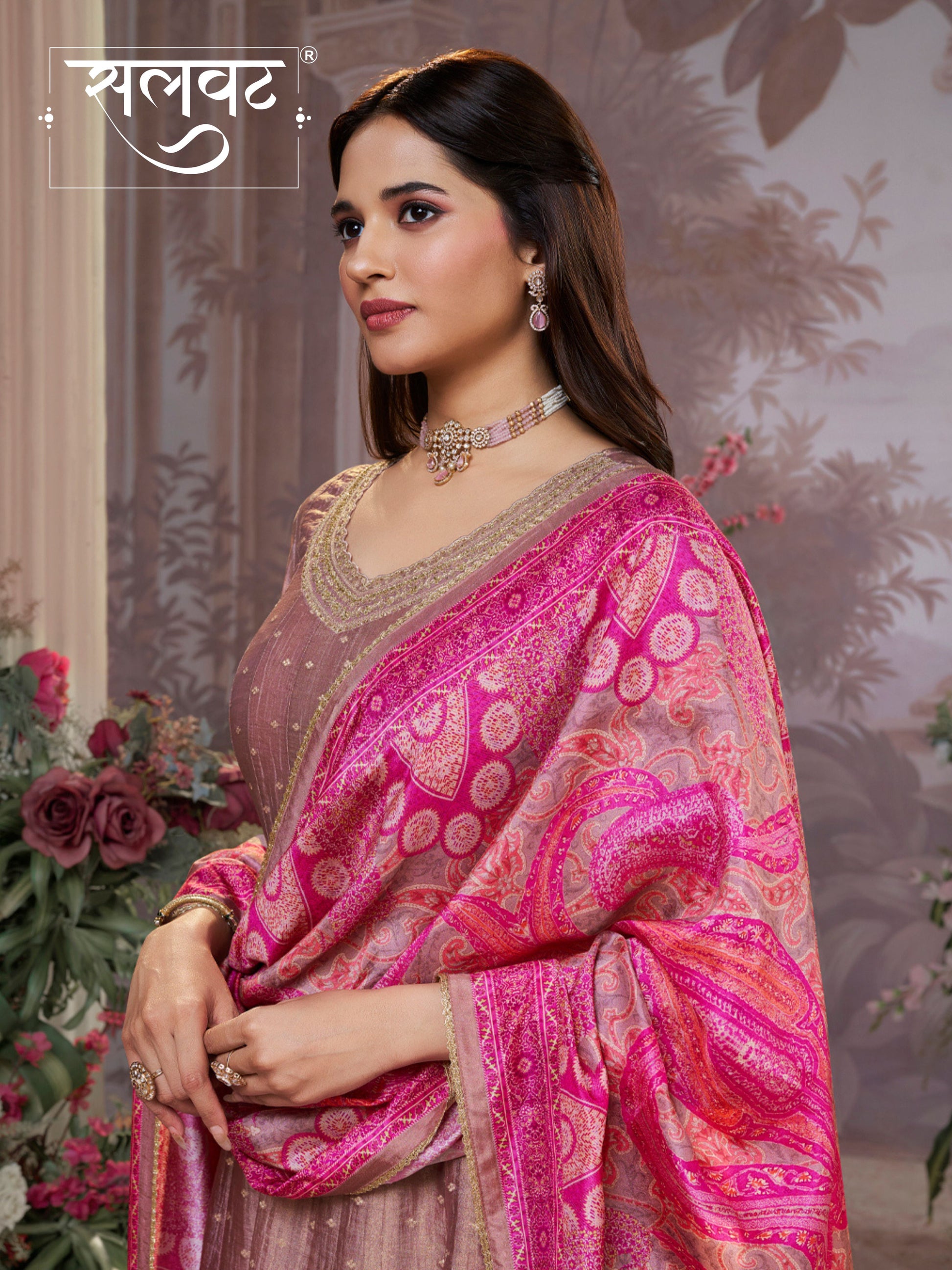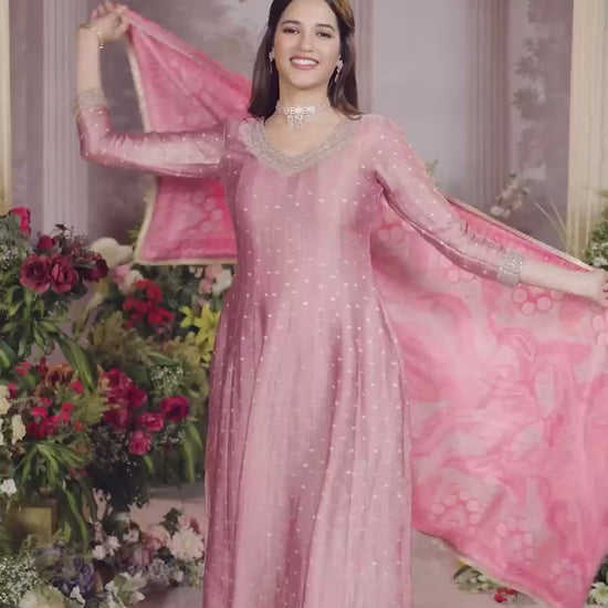 This elegant Dusty Rose Tissue Silk Anarkali features delicate embroidery on the yoke, paired with comfortable Santoon straight pants. A pure Russian Silk dupatta with contrast digital print completes the look, making it perfect for festive and special occasions.