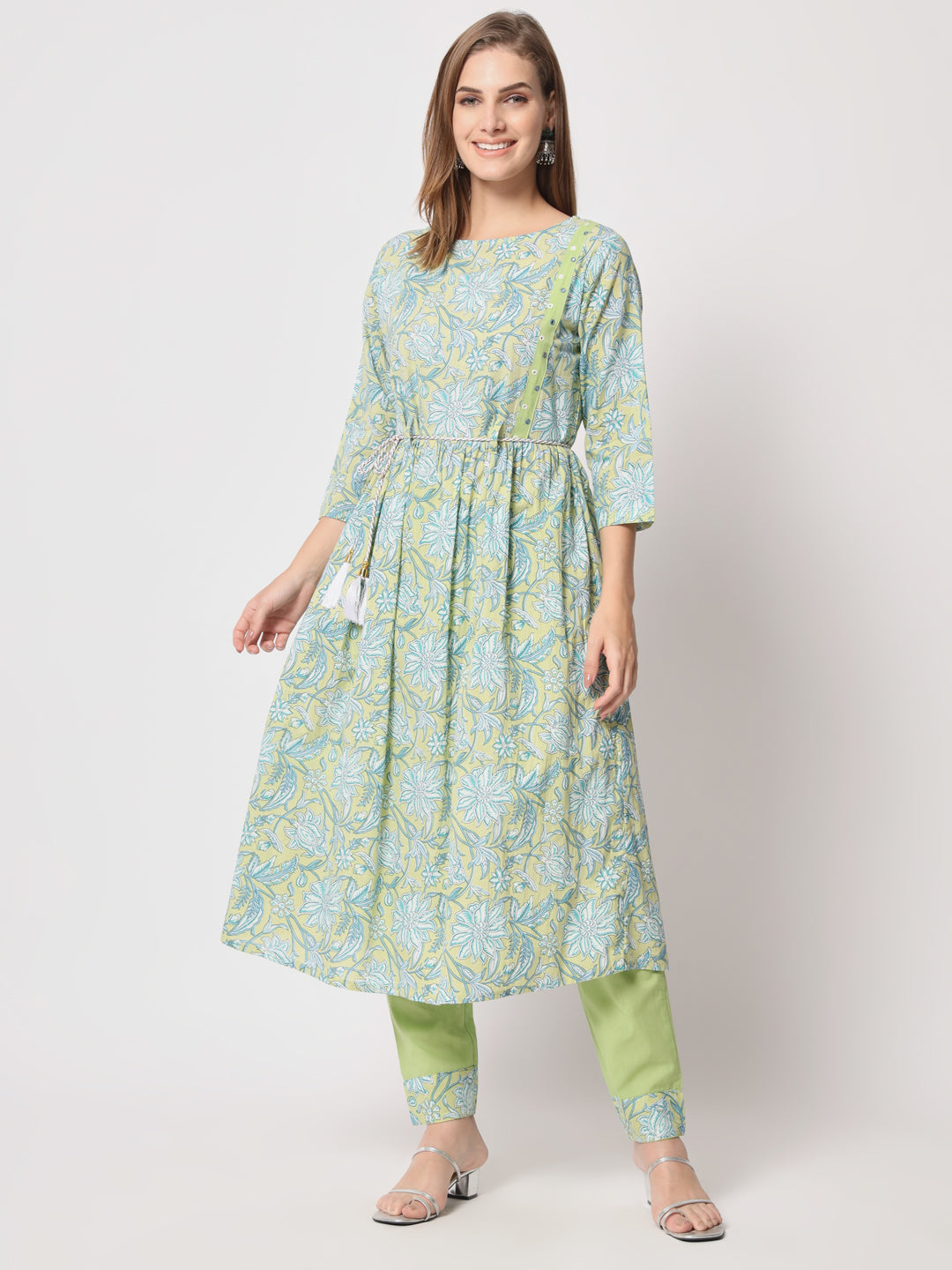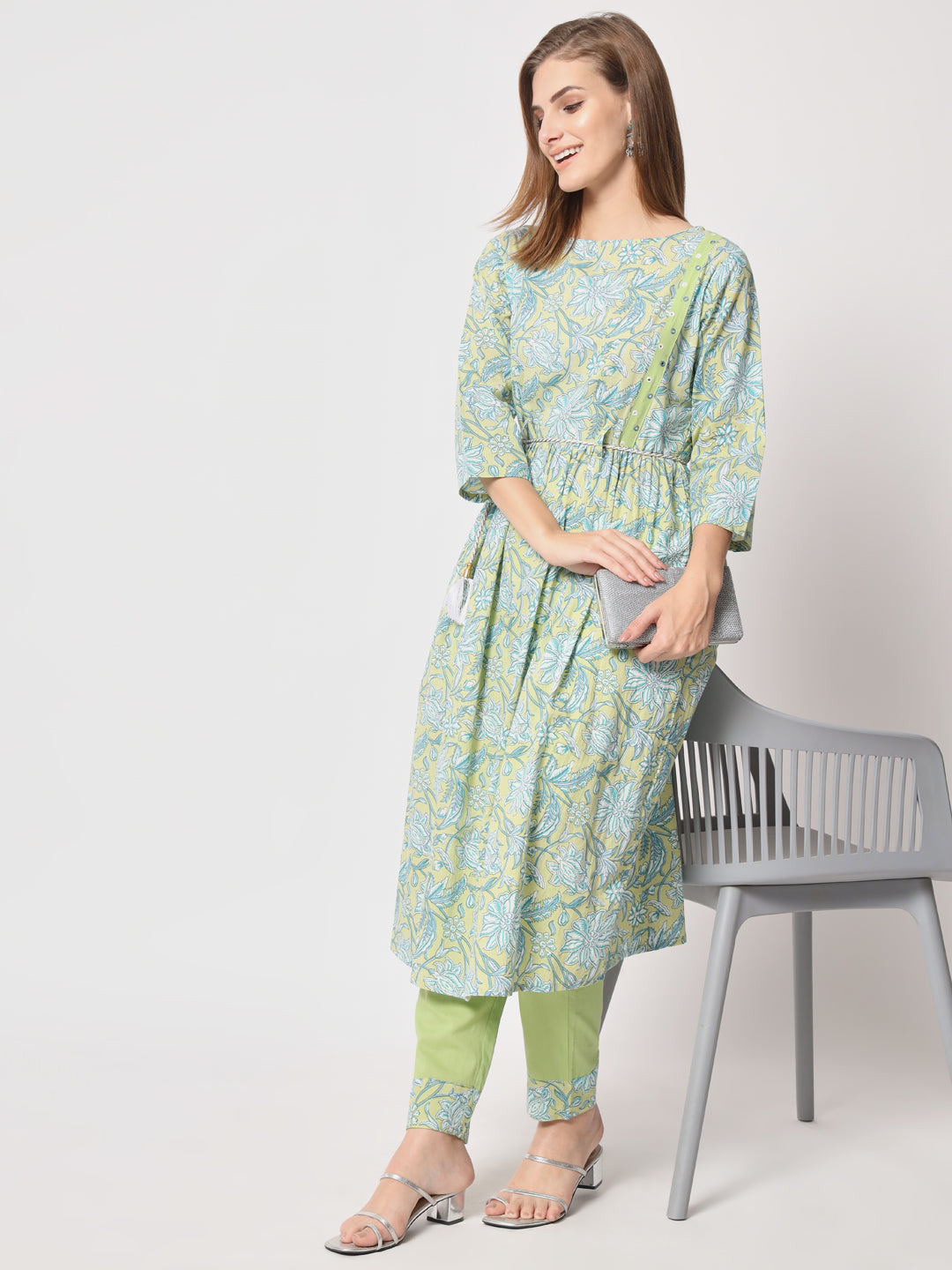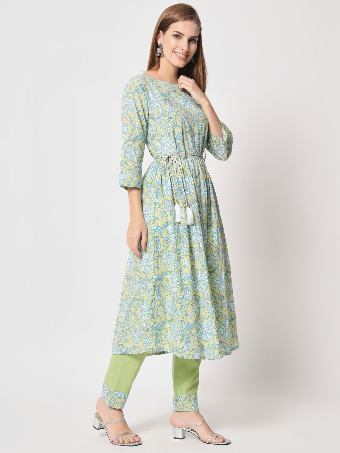 Easy, breezy and beautifully tailored- Green and blue printed kurta set with rope belt for everyday wear.