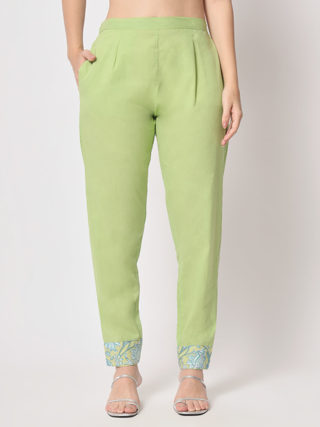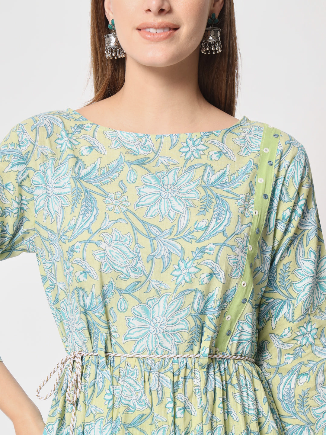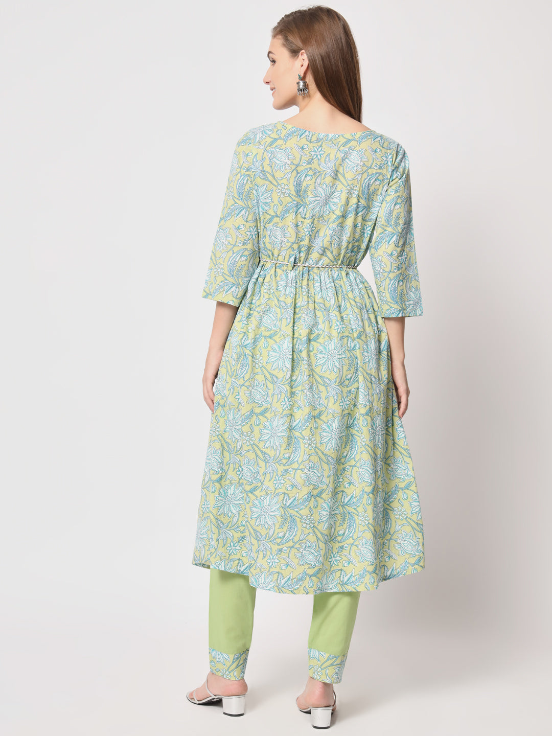 Easy, breezy and beautifully tailored- Green and blue printed kurta set with rope belt for everyday wear.