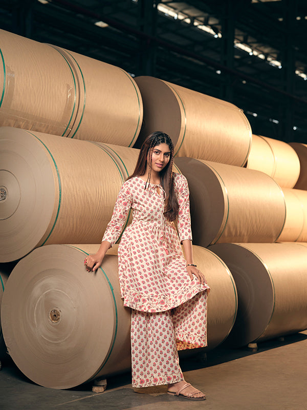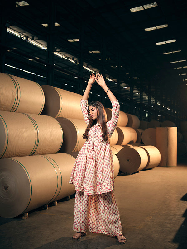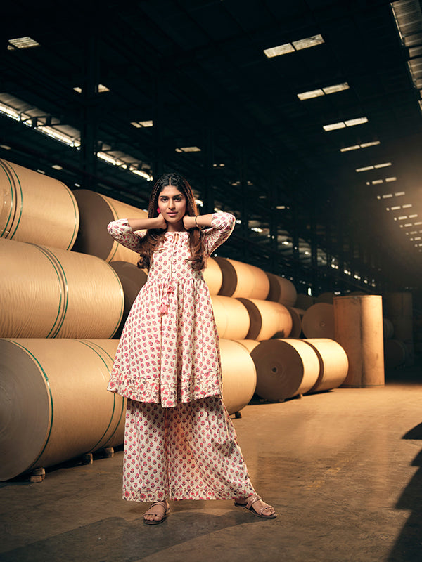 Pink and cream block printed Indo western kurti with keyhole neckline and a wide legged sharara pant.