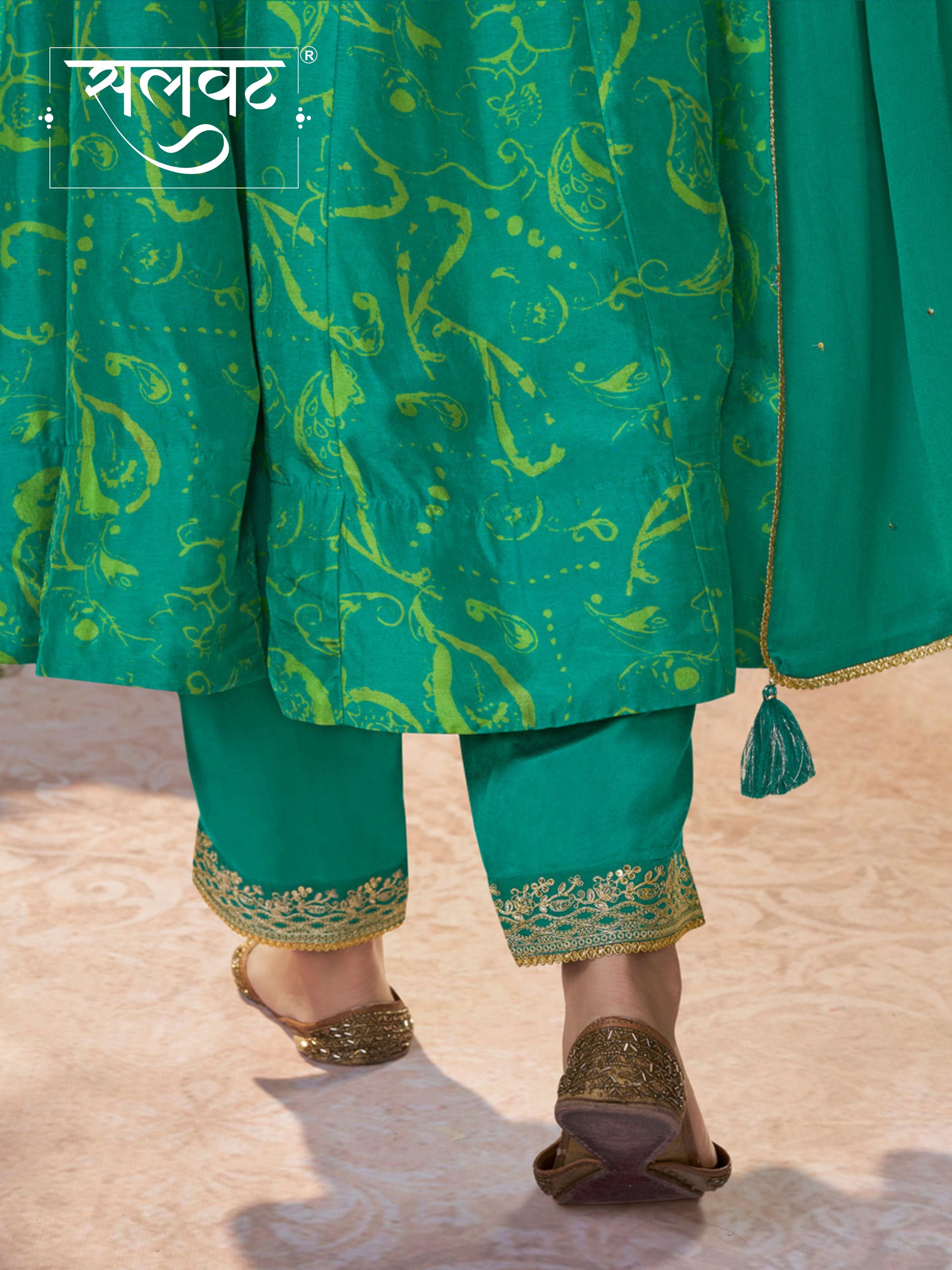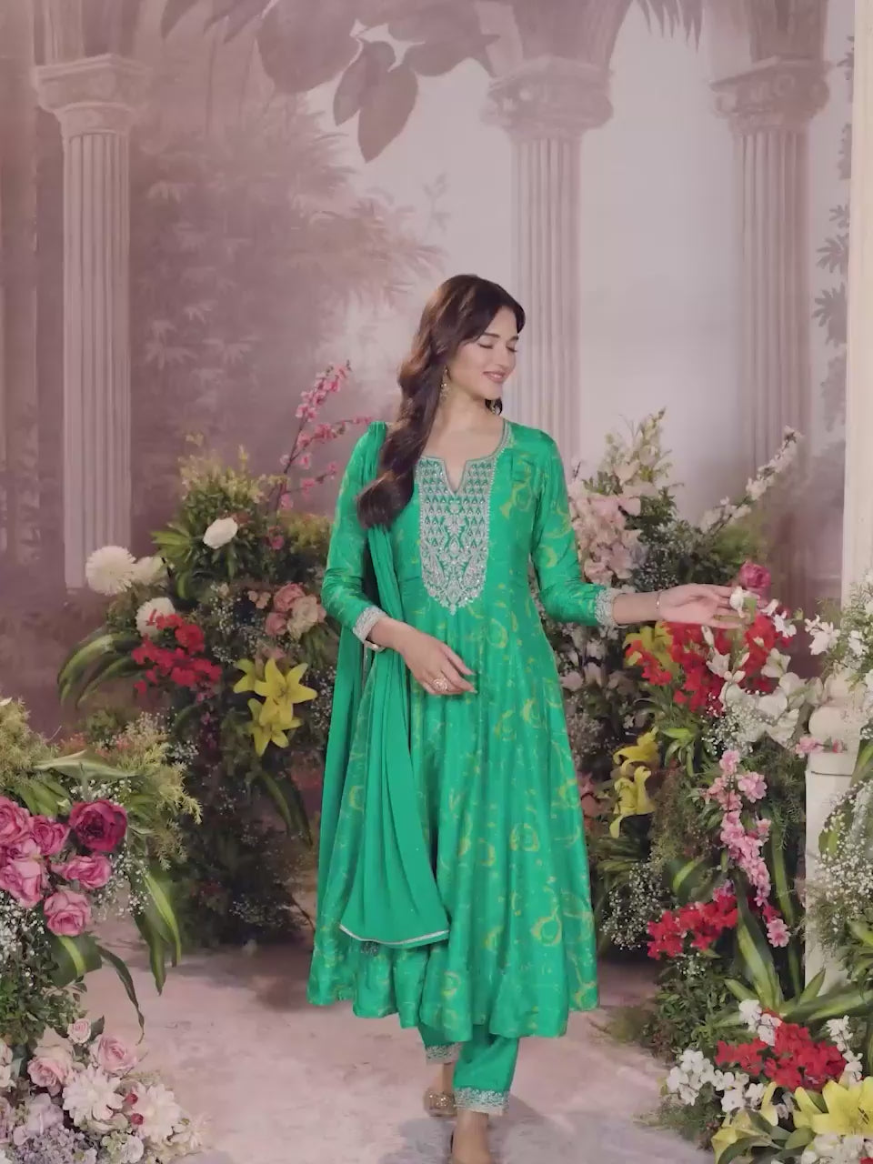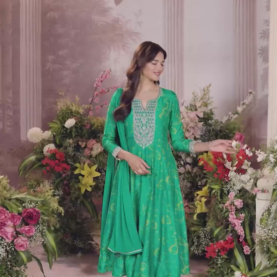 Green Viscose Silk Fabric Anarkali Top with Digital Print and Mirror Embroidery Work. Paired with Santton fabric Straight Pant and a Chinon Dupatta with Four Sided Border