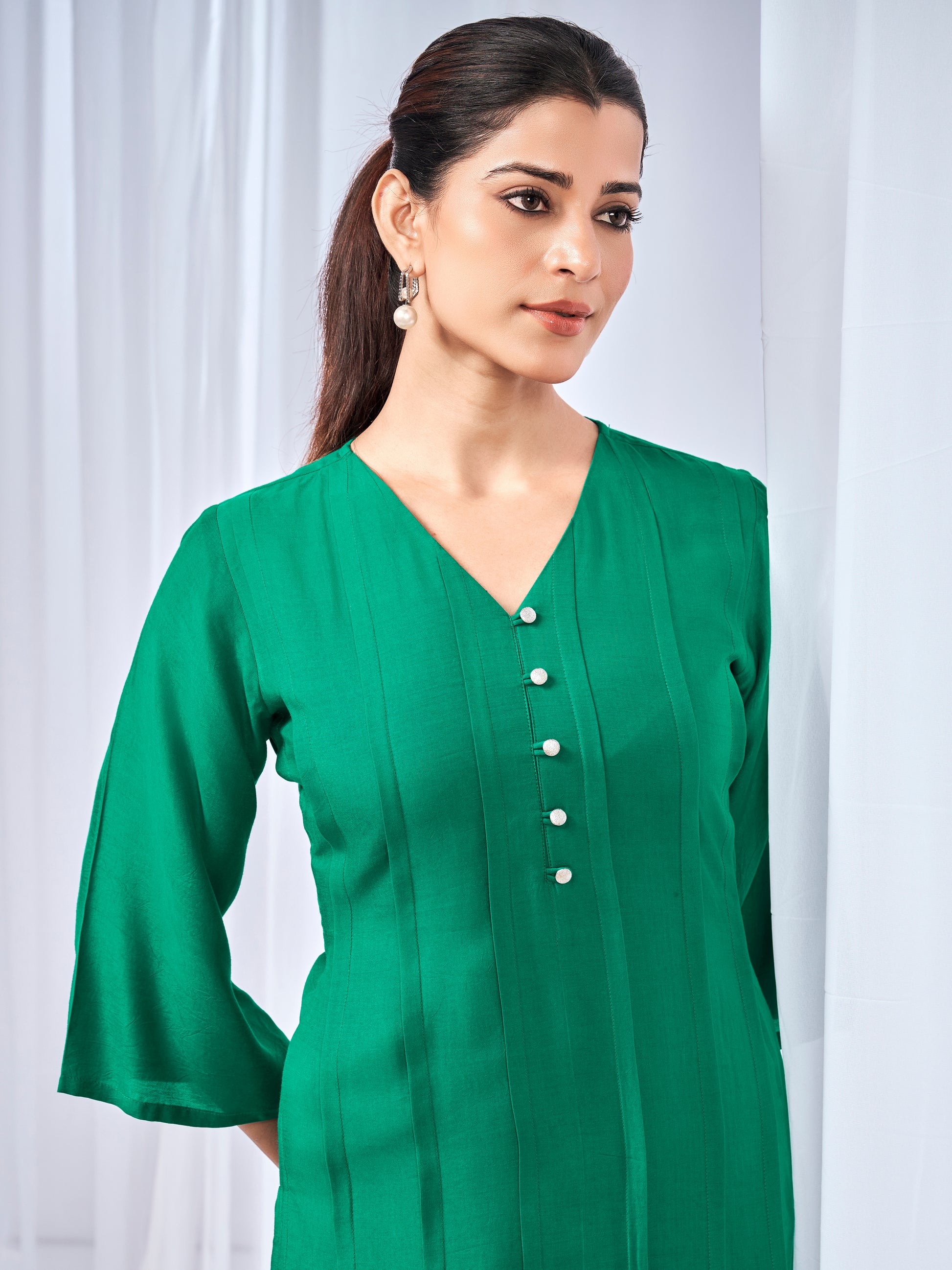 This soft Green muslin kurta-style co-ord set with neat stitched detailing and buttoned neck, offering effortless comfort and style for any occasion.