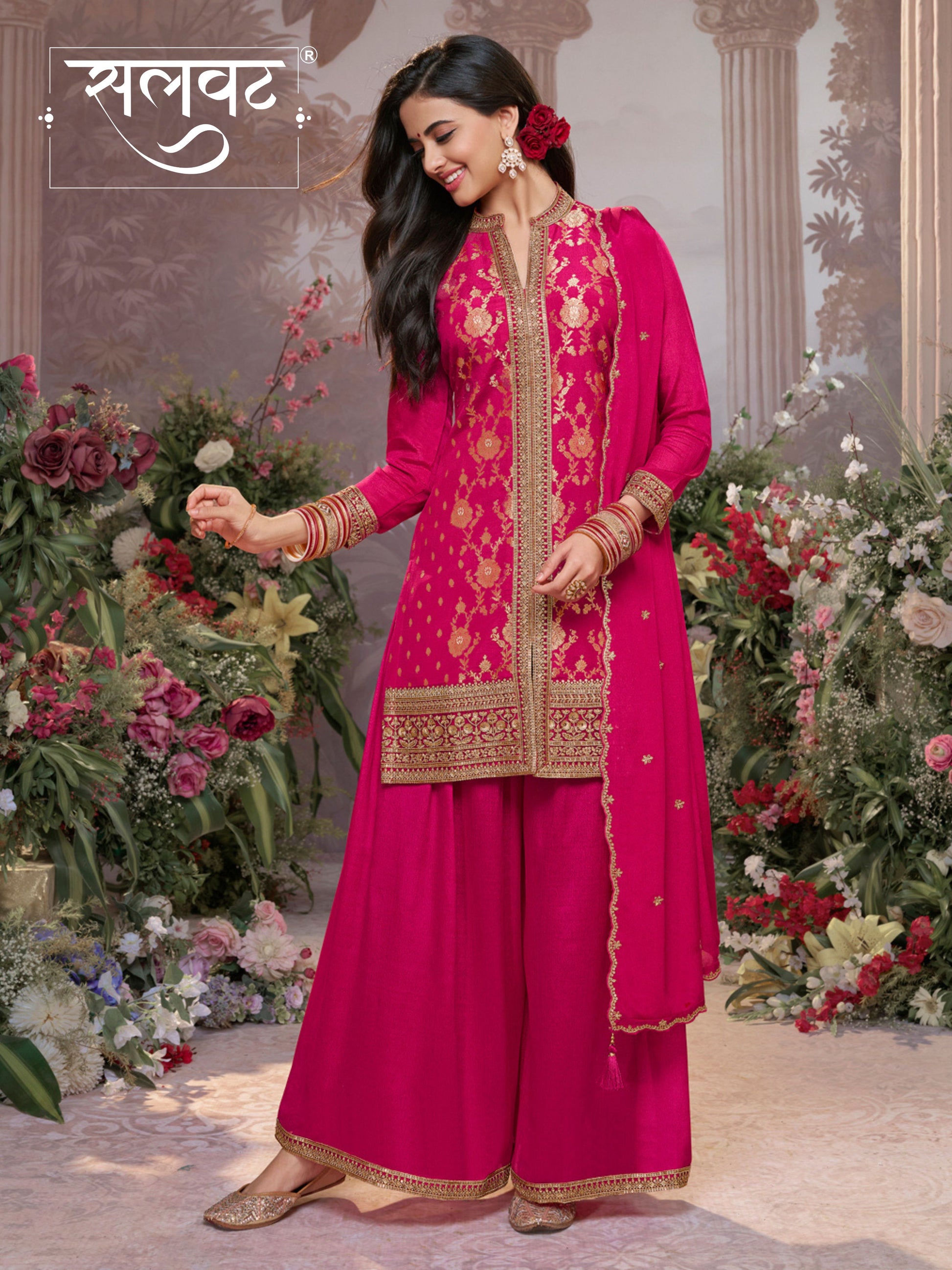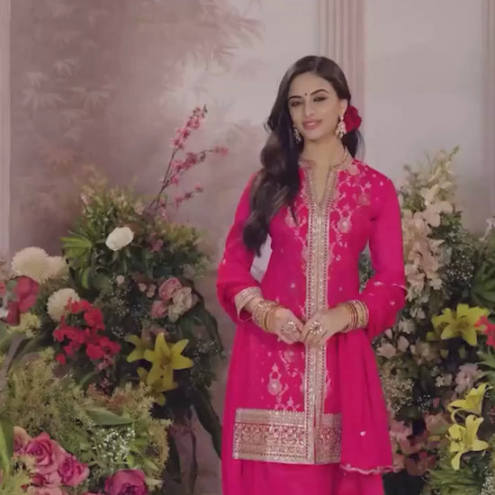 Hot Pink Chinon Kurta Set with Heavy Jacquard Work Paired with Chinon Dupatta with Embroidered Work.