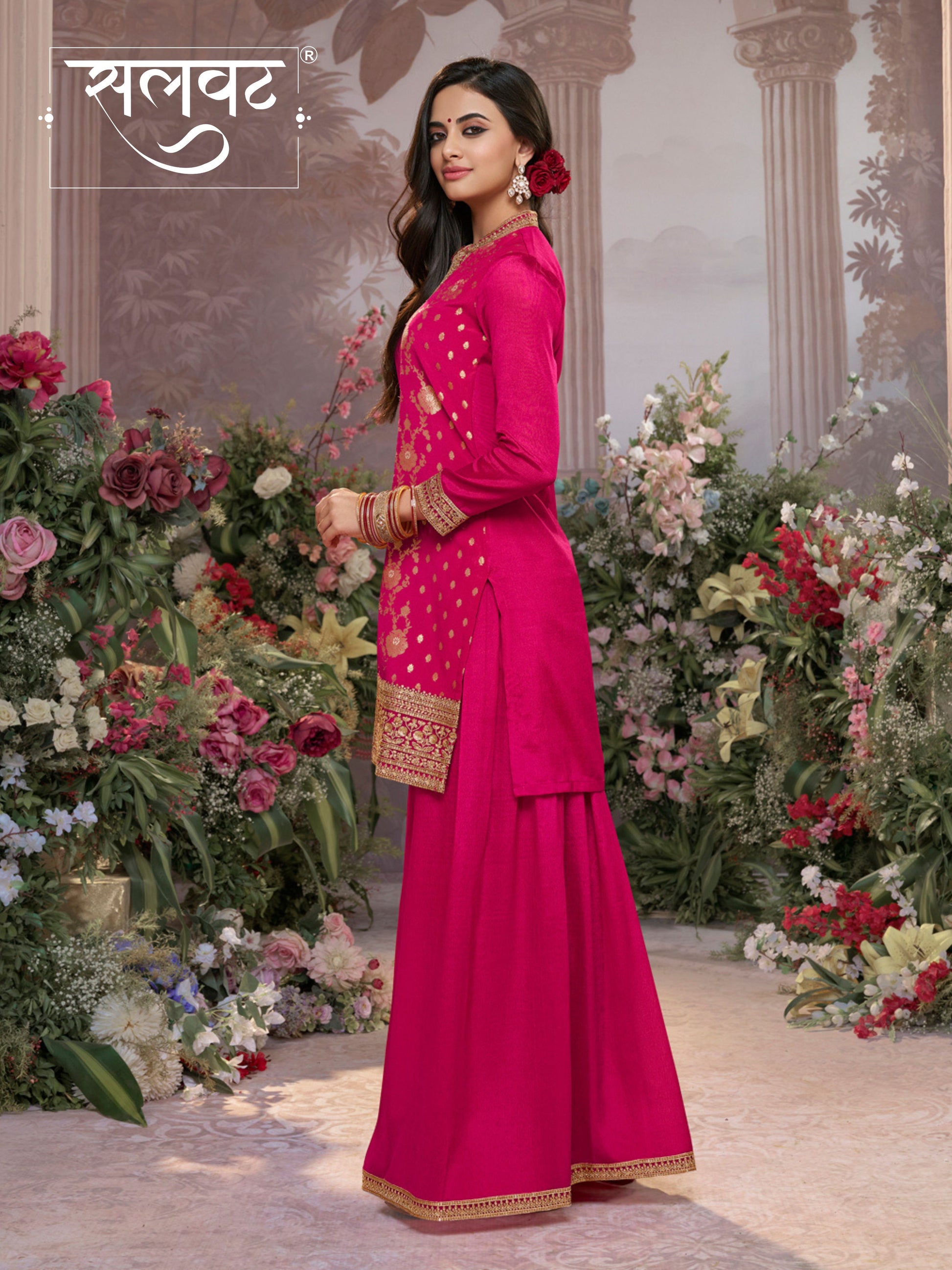 A graceful ensemble featuring a chinon kurta with embroidered yoke and rich jacquard weave, paired with an embroidered chinon sharara. The look is completed with a chinon dupatta adorned with embroidery and a scalloped border—perfect for festive occasions.