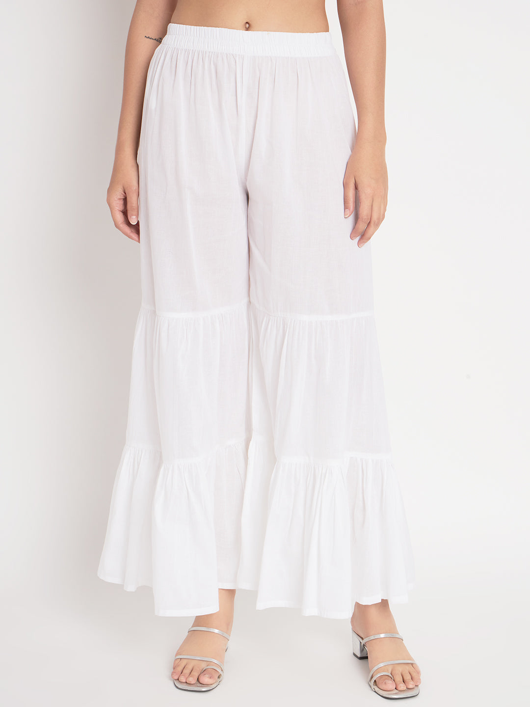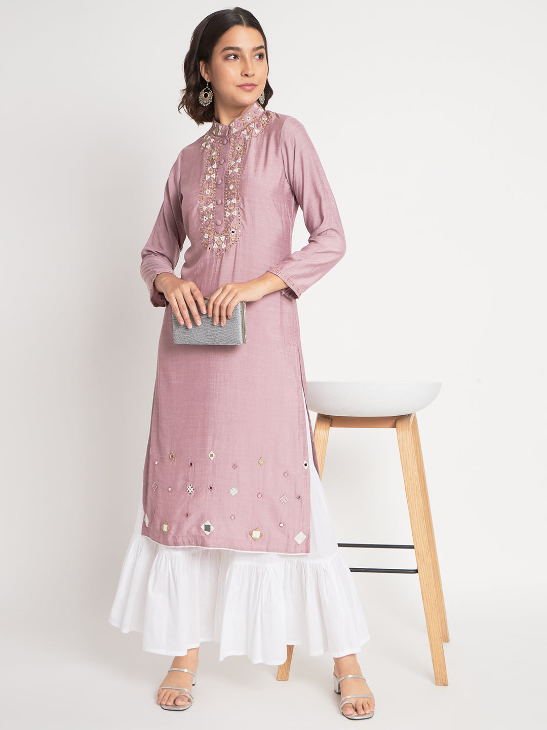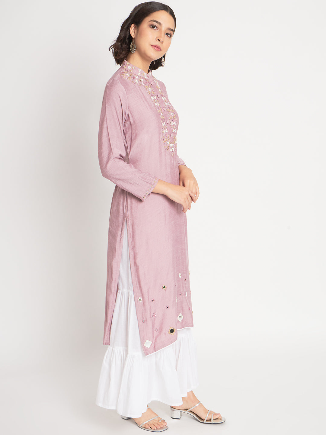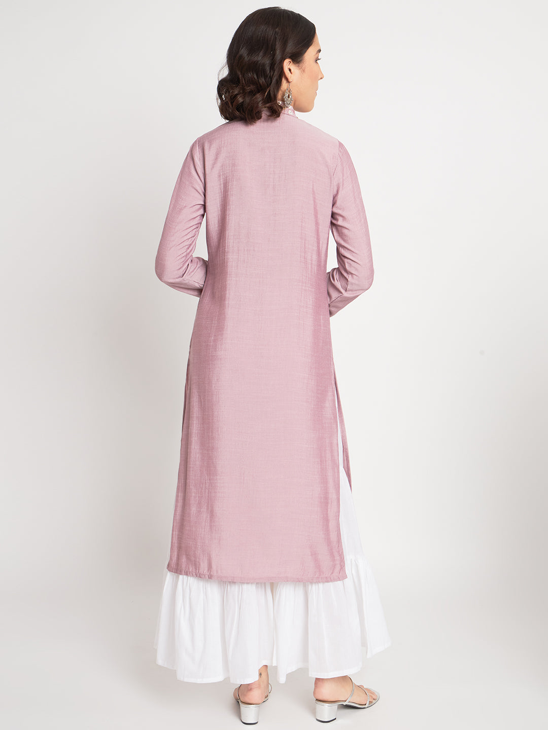 Violet silk based dyed kurti with a confident mandarin collar and off white sharara pants