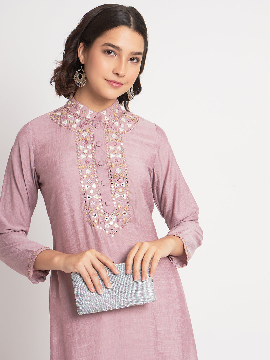 Lavish hand embroidered mirror work on neckline, sleeves and hem.