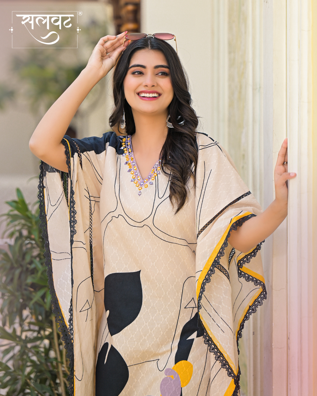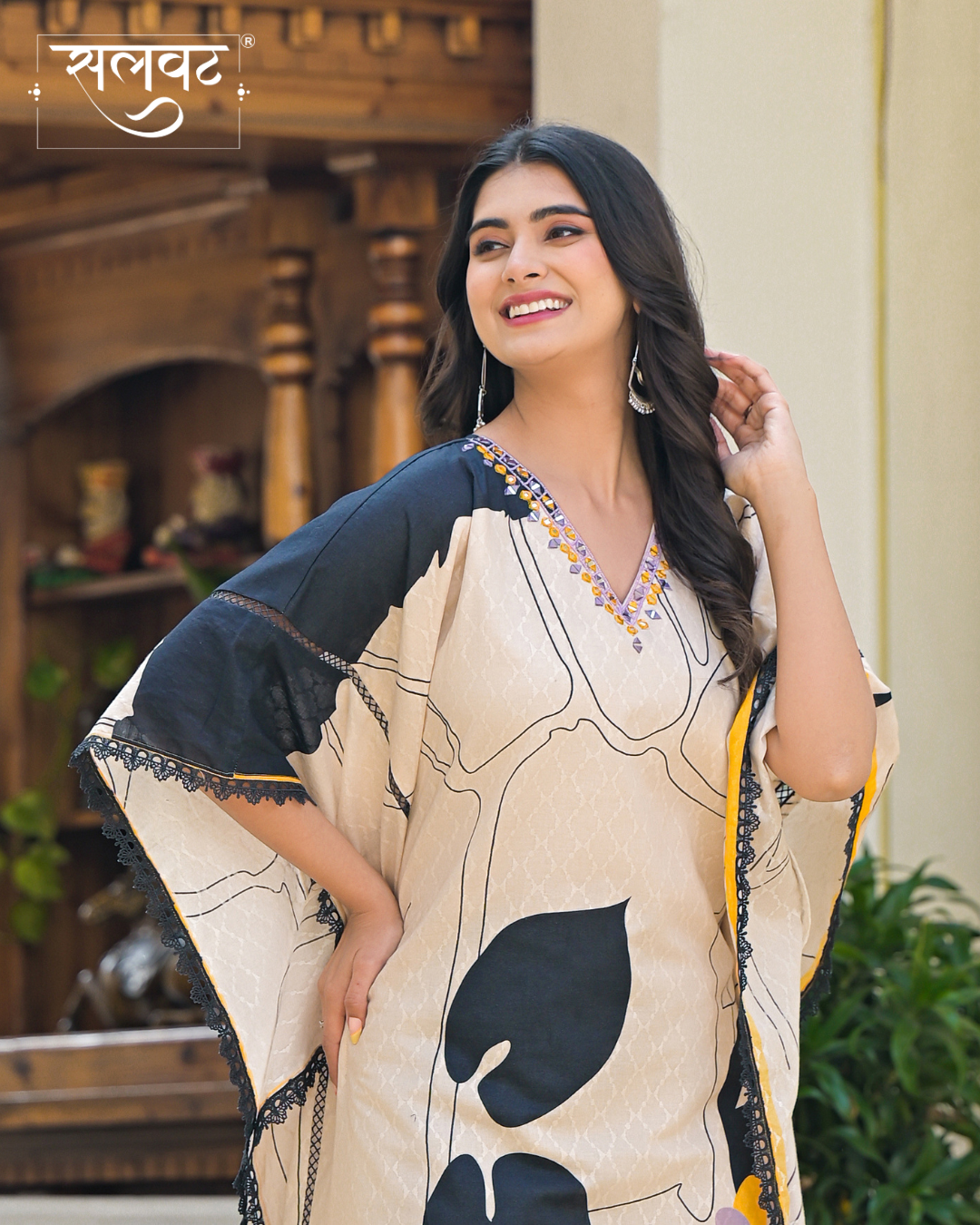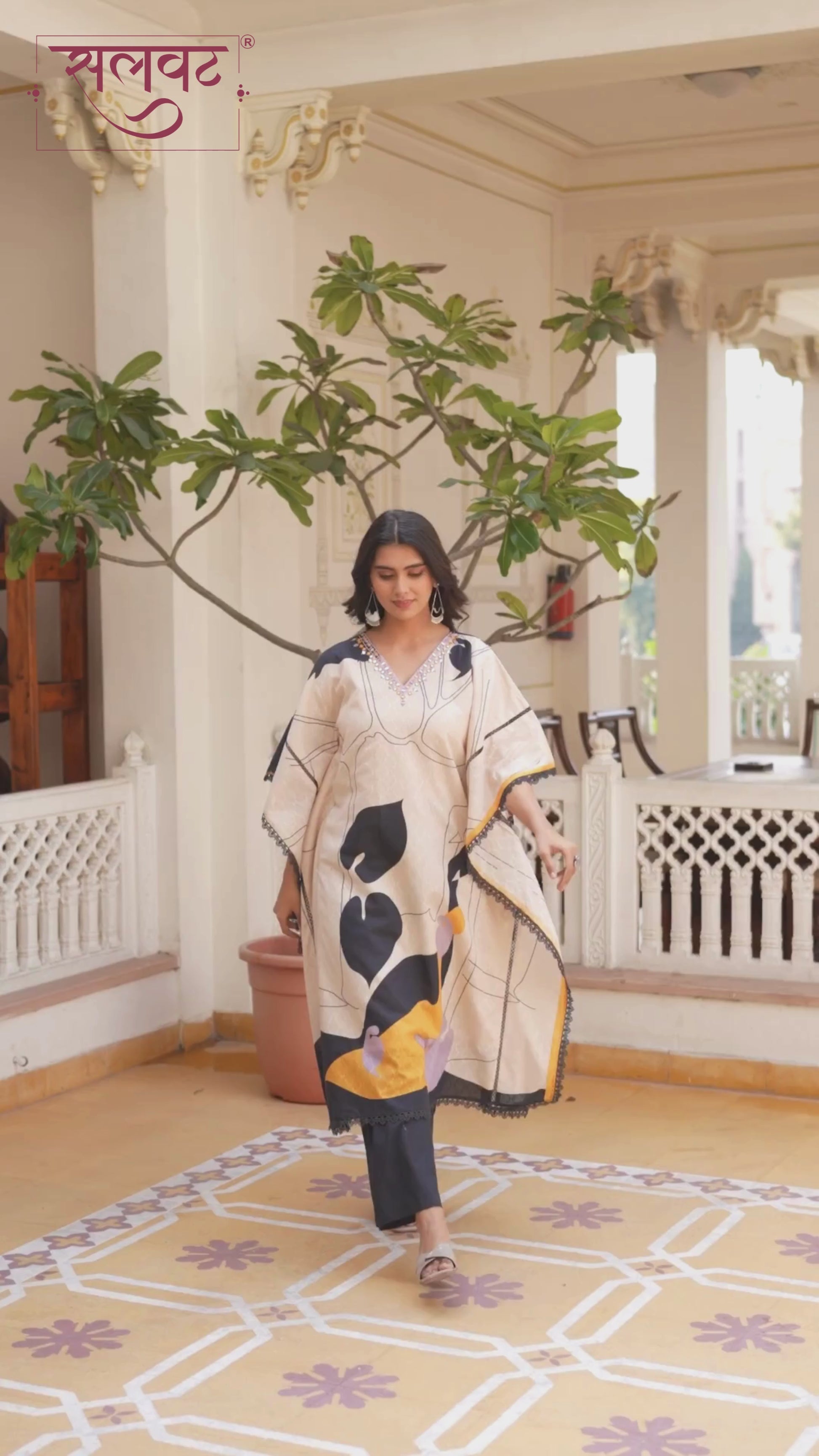 Light beige abstract flowers digital printed kurta set with sequins-mirror-beads handwork kaftan set with hand-stitched & hand-dyed lace.