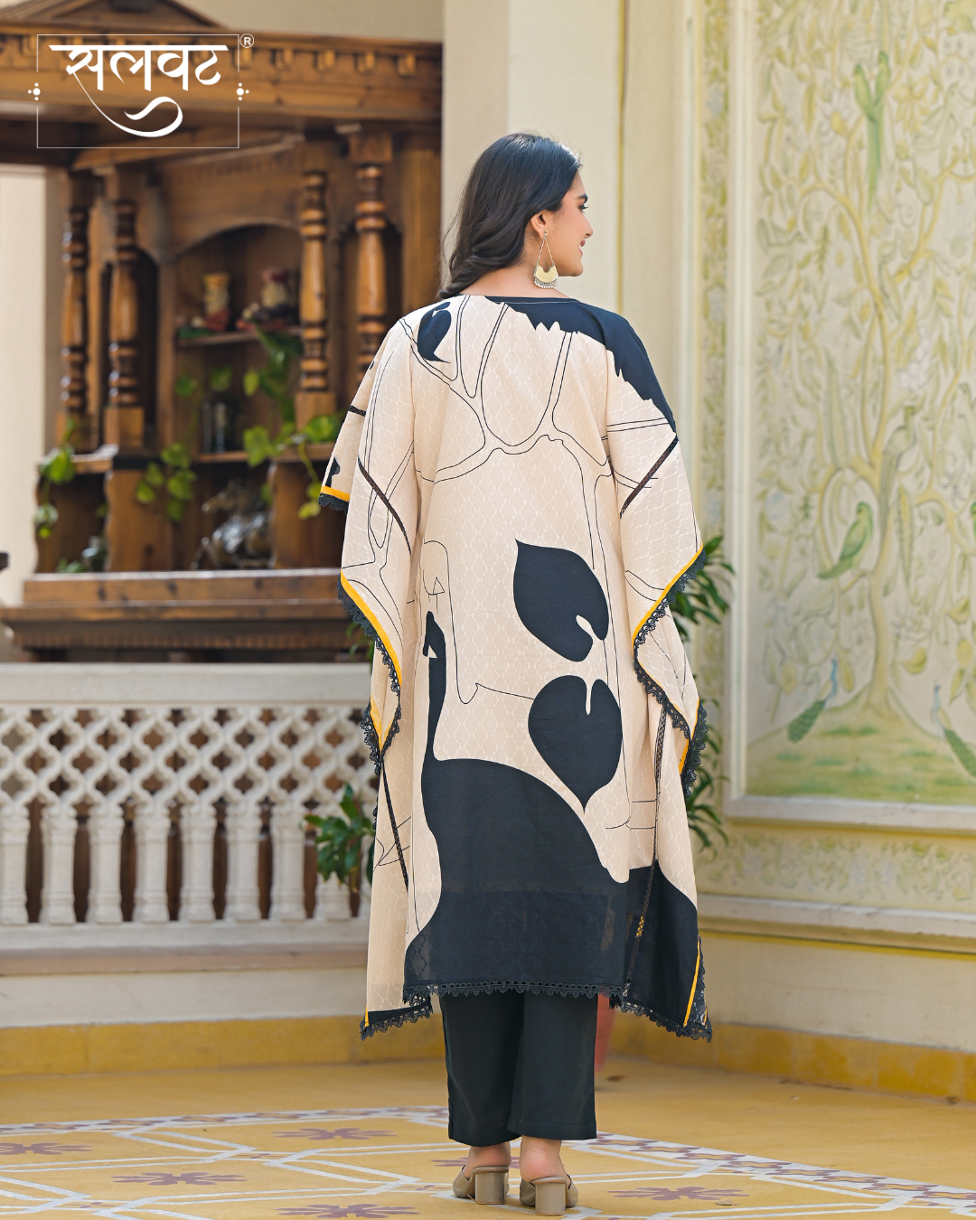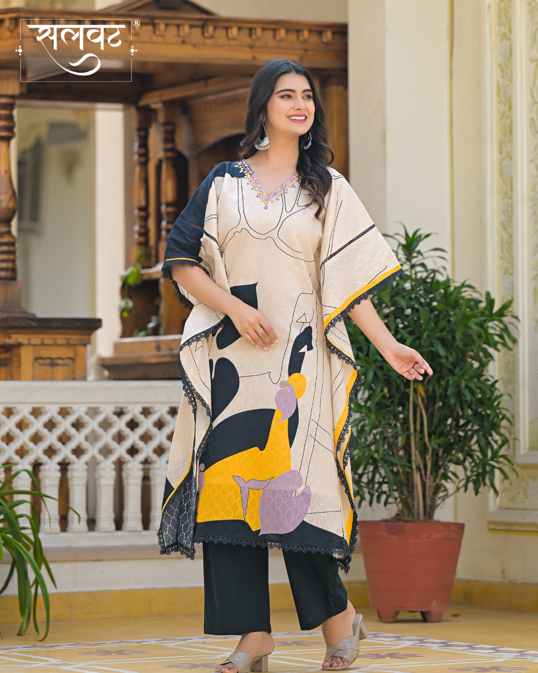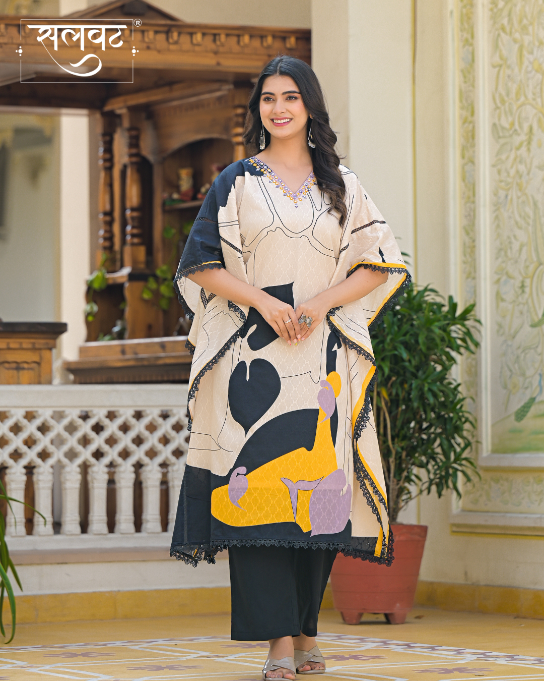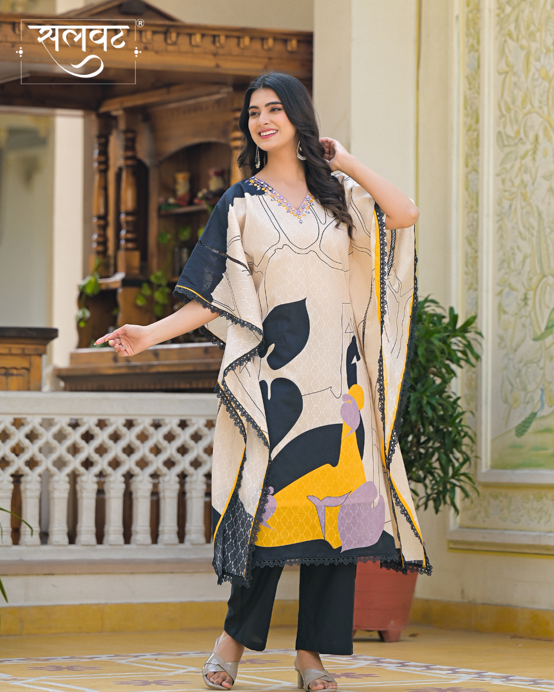 Light beige abstract flowers digital printed kurta set with sequins-mirror-beads handwork kaftan set with hand-stitched & hand-dyed lace.