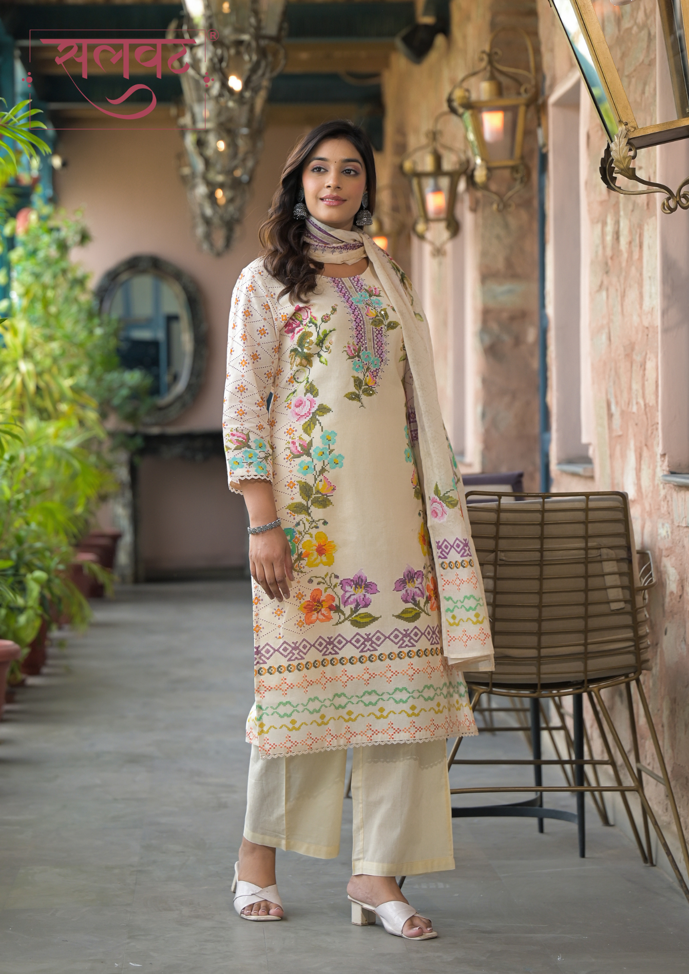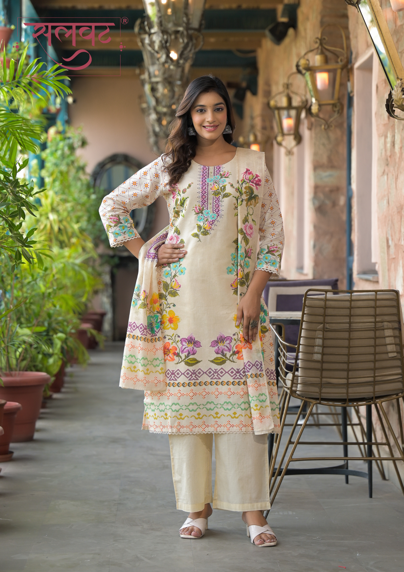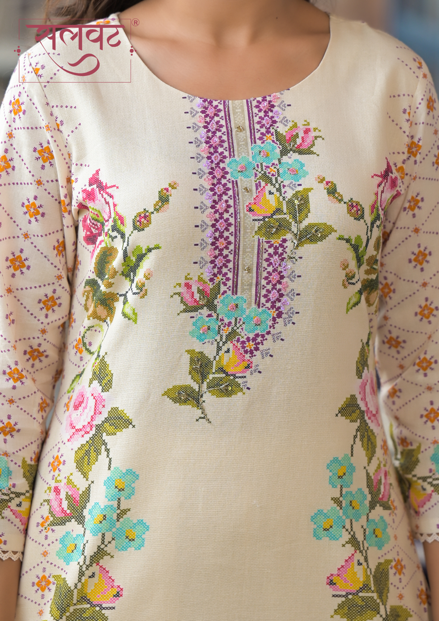Light Beige-Pink flowers chain stitch style digital printed kurta set with beads-sequins handwork on neck, lace on sleeves & kurta hemline with digital print dupatta.