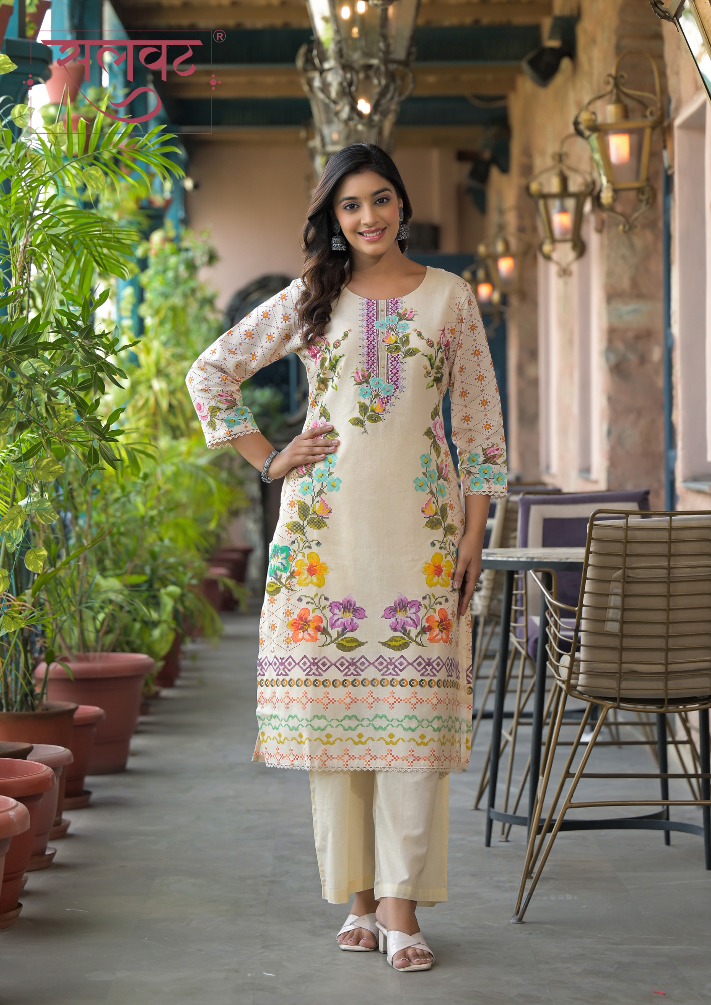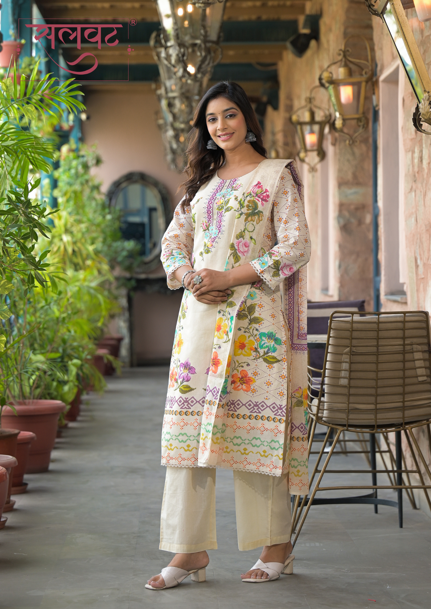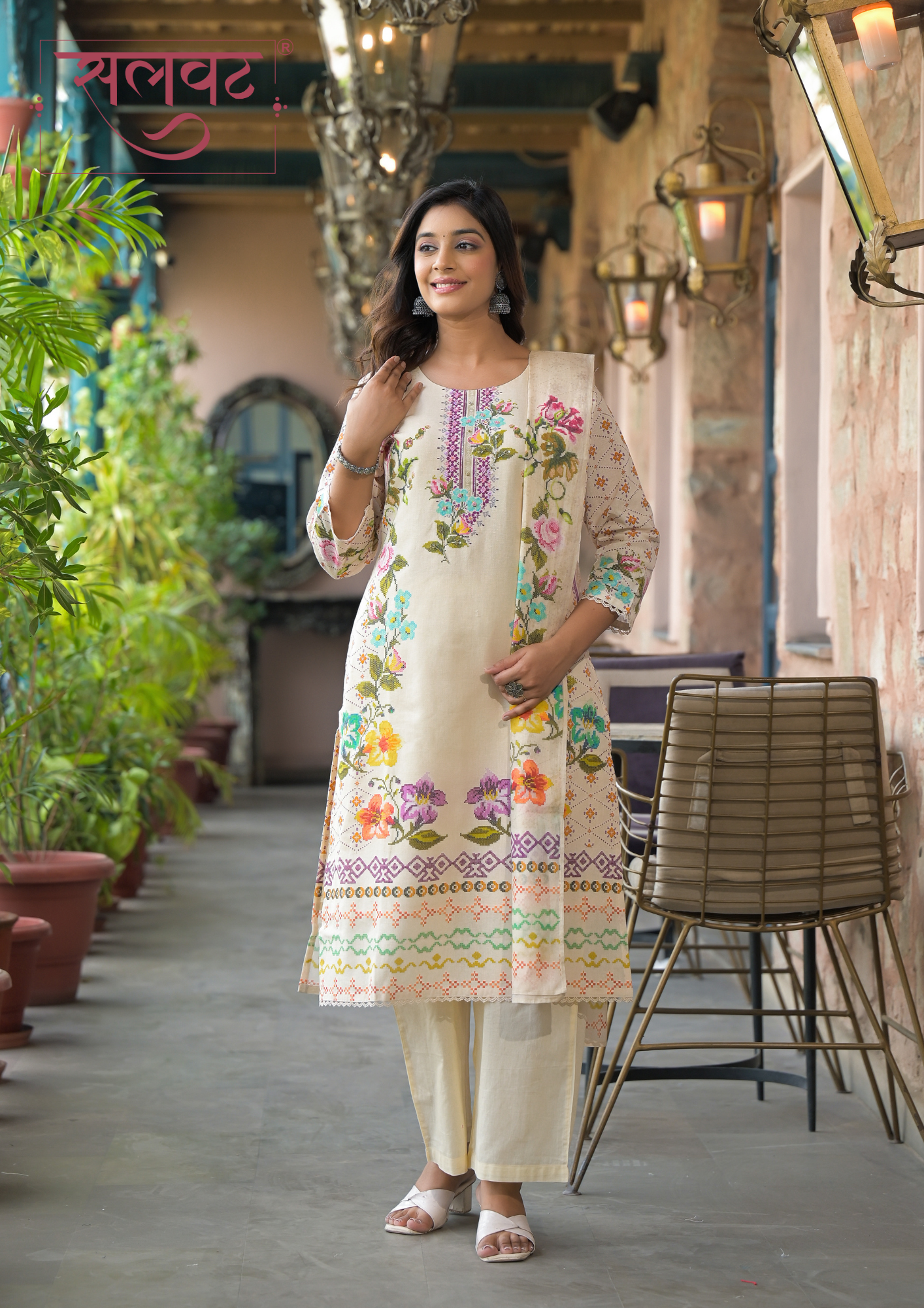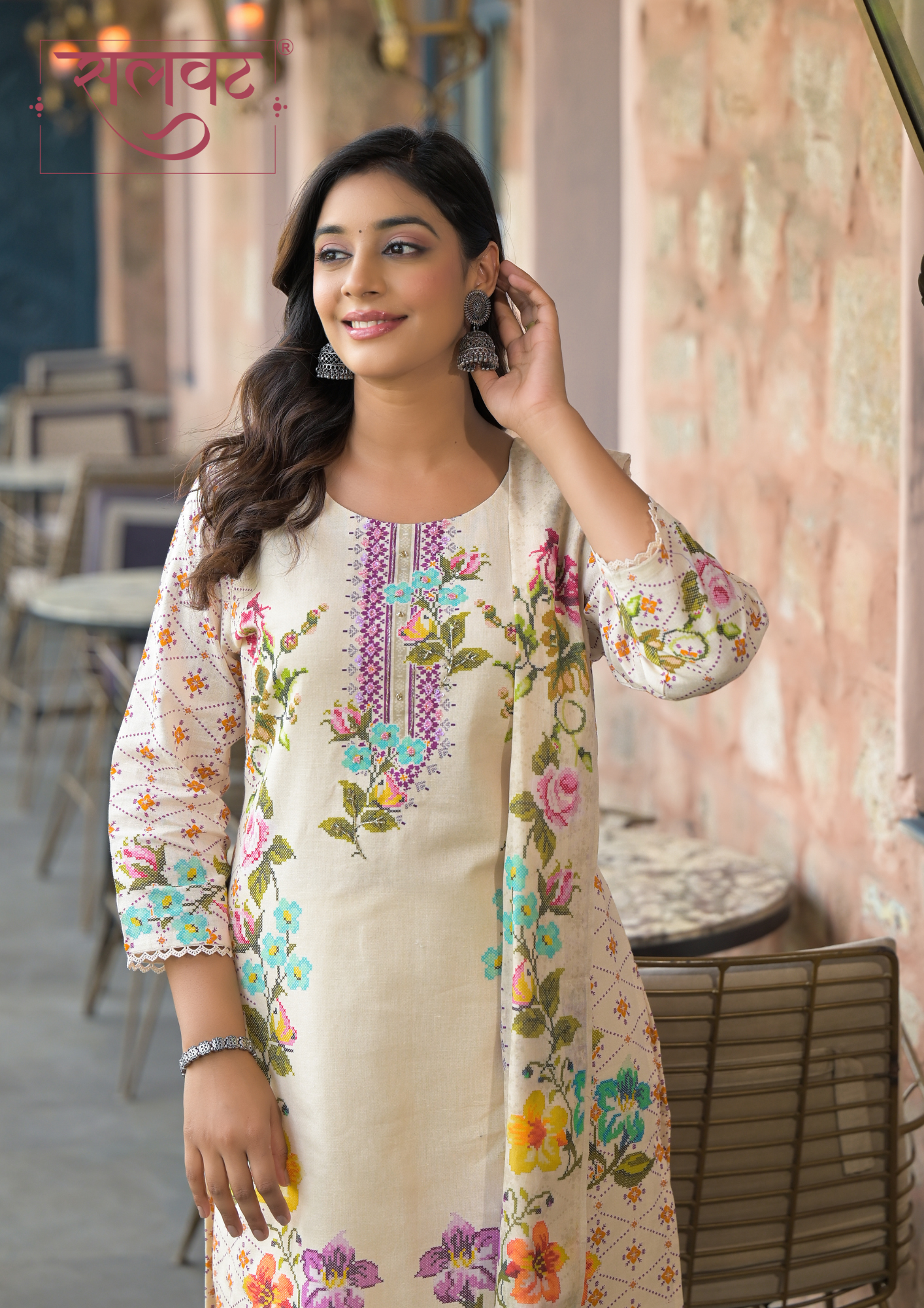 Light Beige-Pink flowers chain stitch style digital printed kurta set with beads-sequins handwork on neck, lace on sleeves & kurta hemline with digital print dupatta.