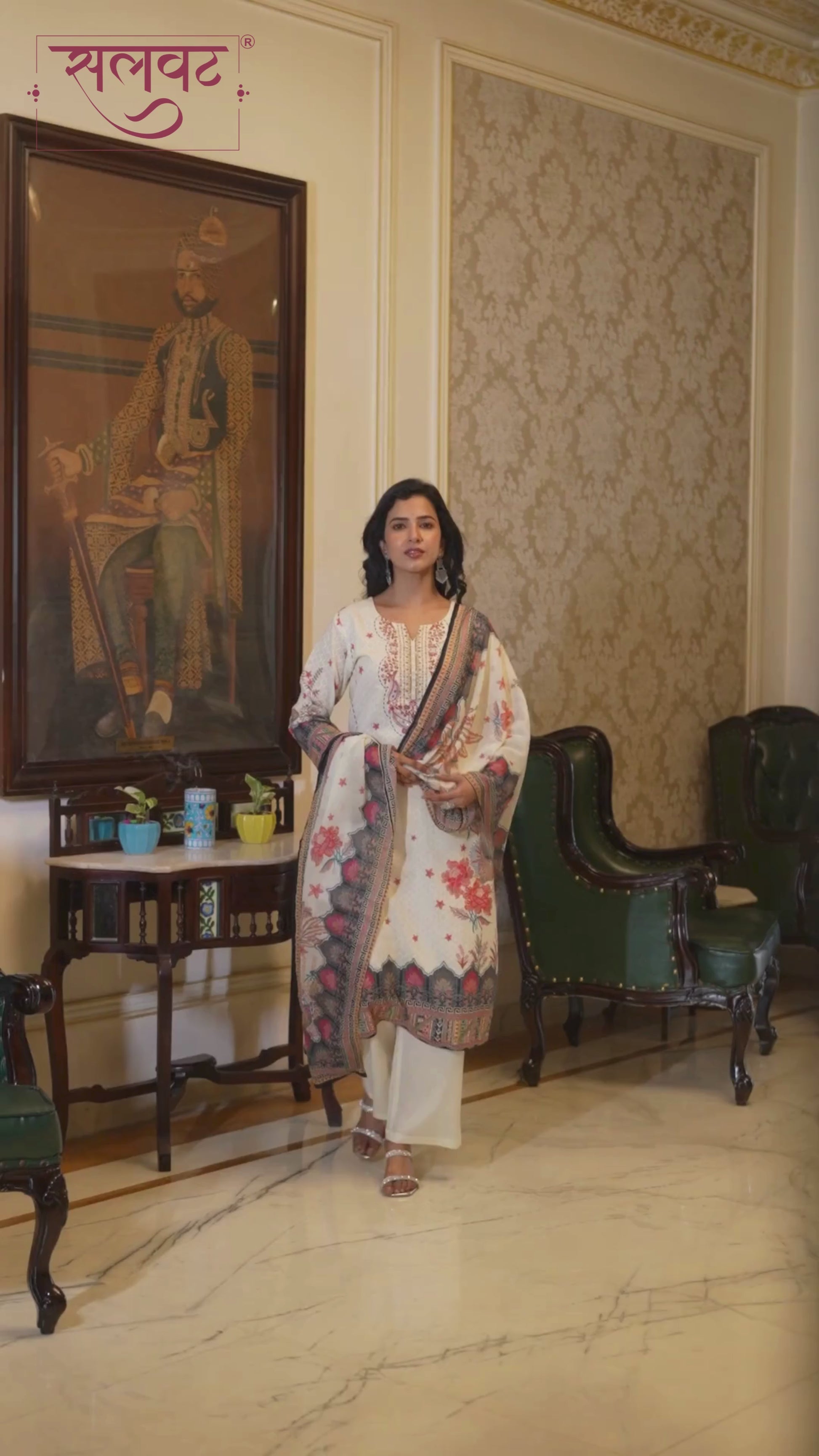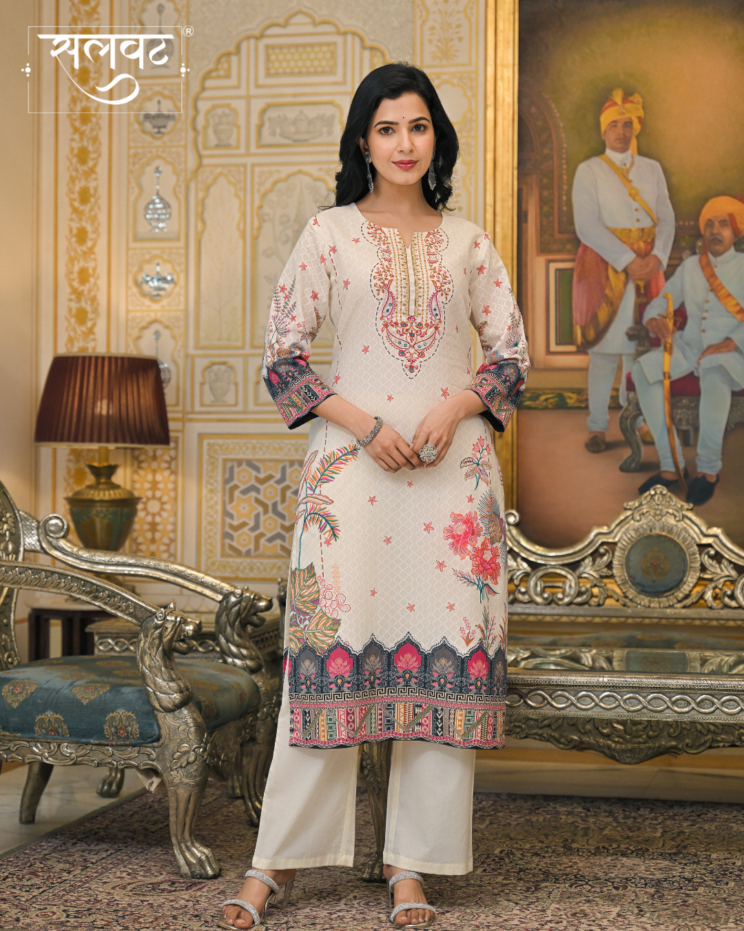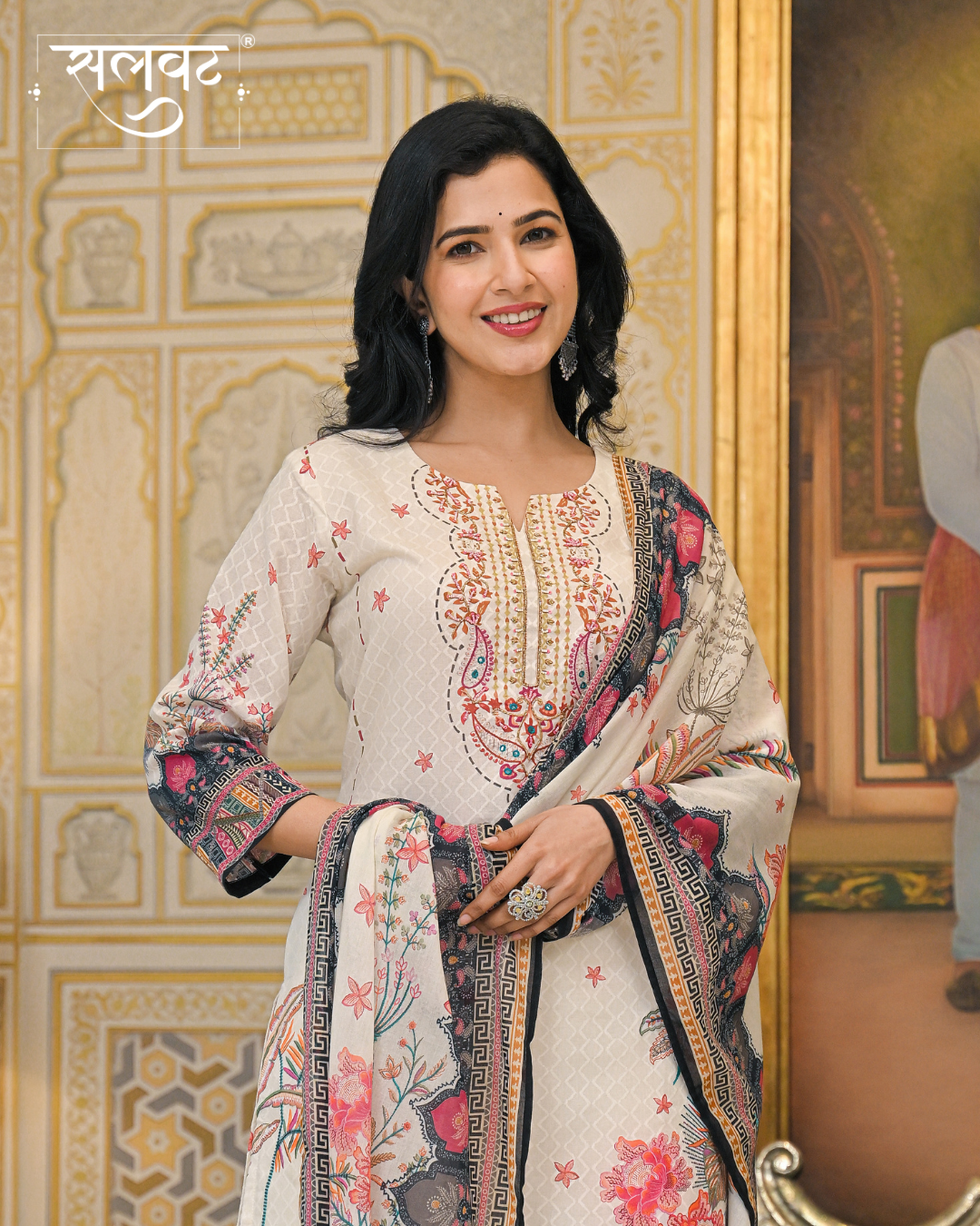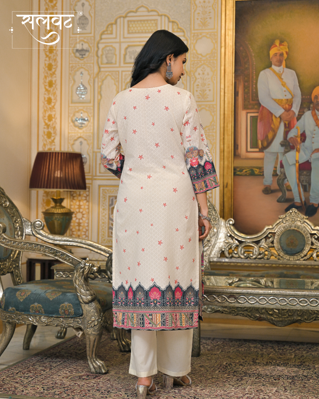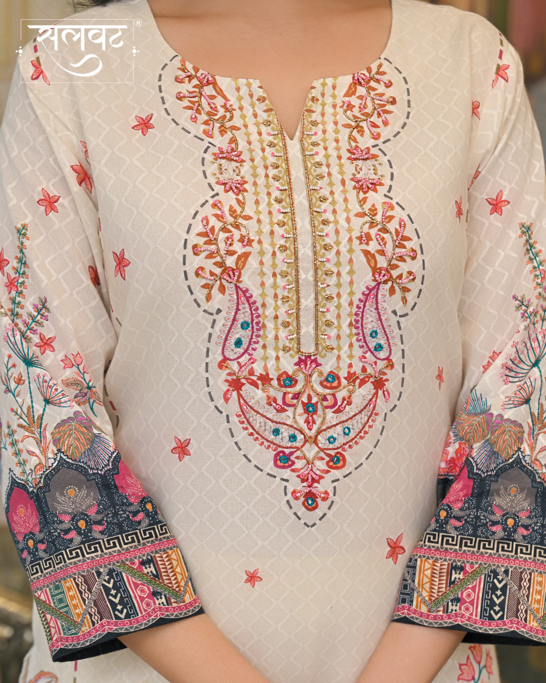 Light Caramel printed kurta set with beads handwork on neck & digital print dupatta.