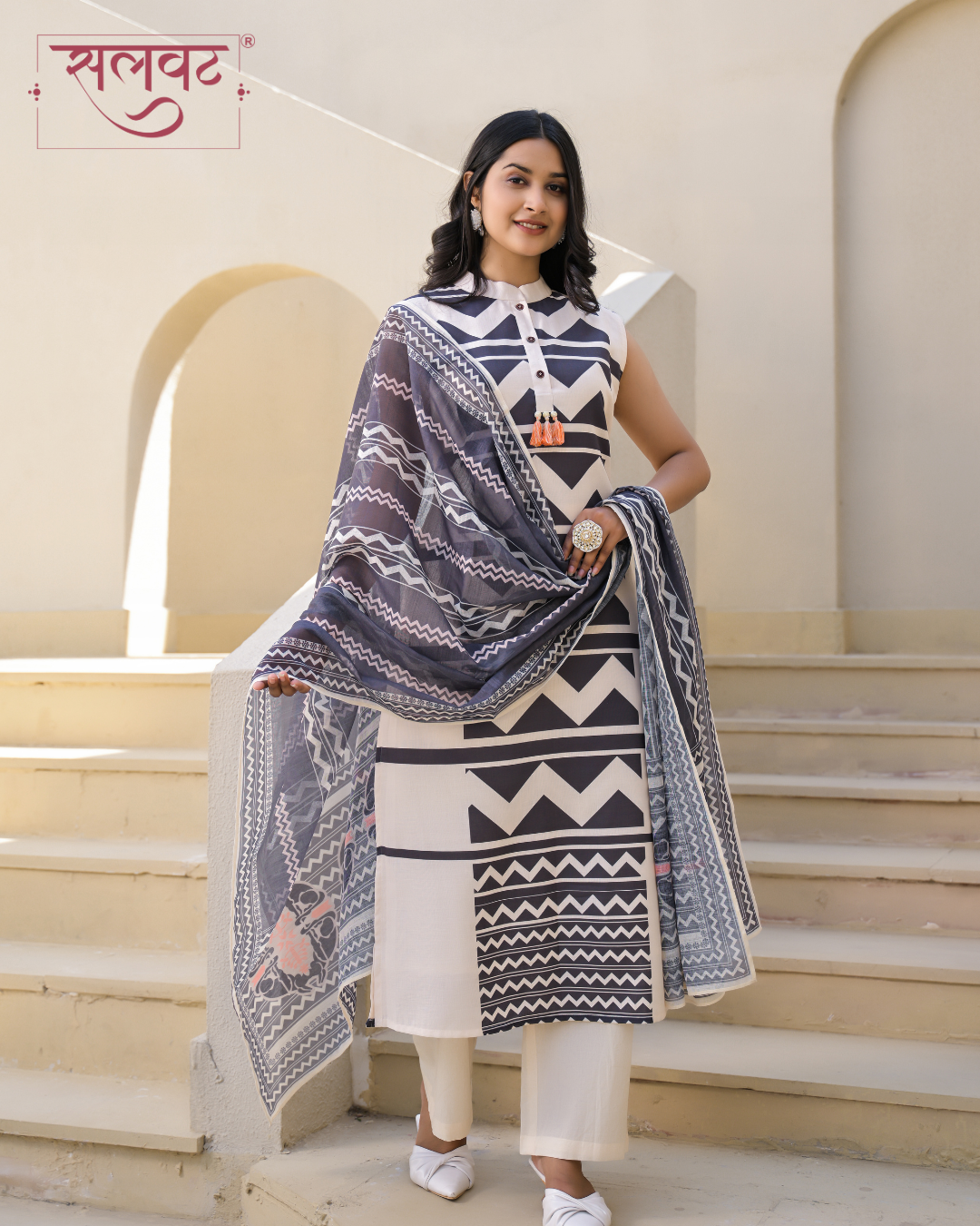 Light Cream & Black Printed Kurta Set With Hand Knot Work & Printed Dupatta