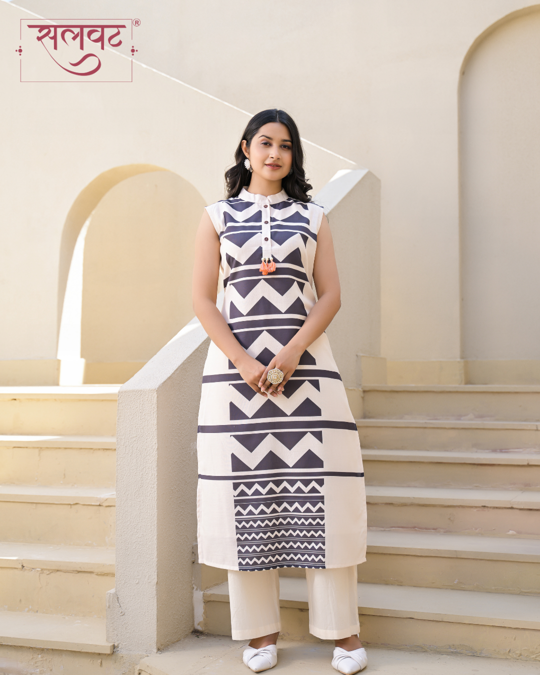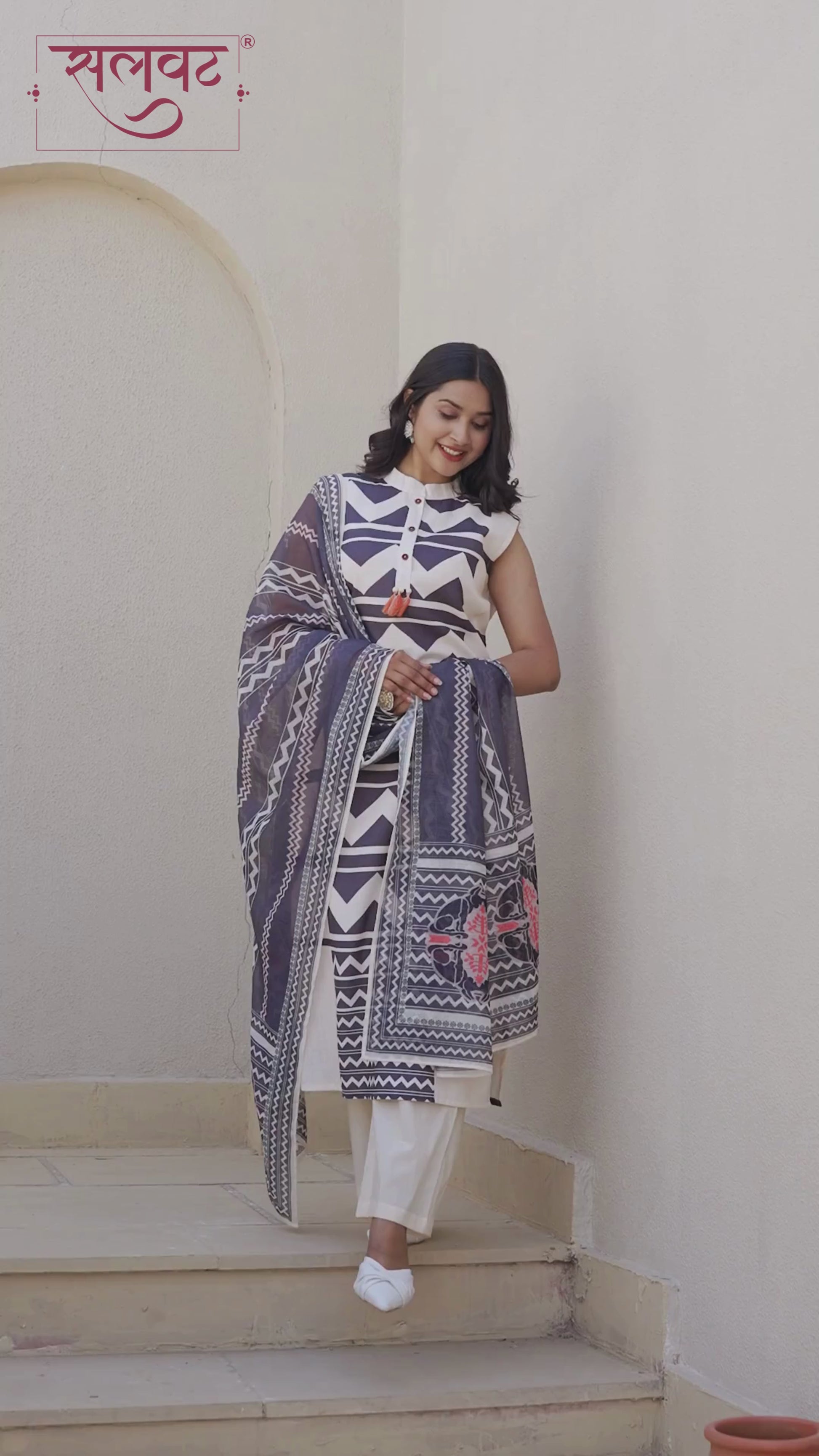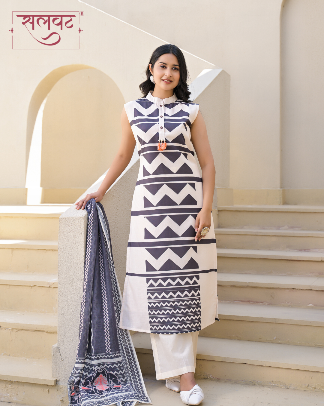 Light Cream & Black sleeveless digital printed kurti set with handwork french knots in back with digital printed dupatta.