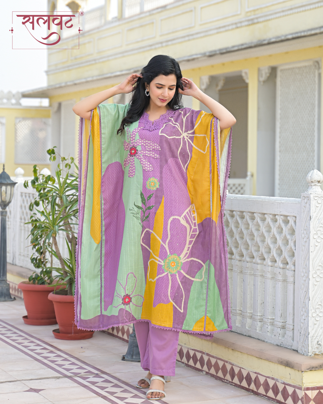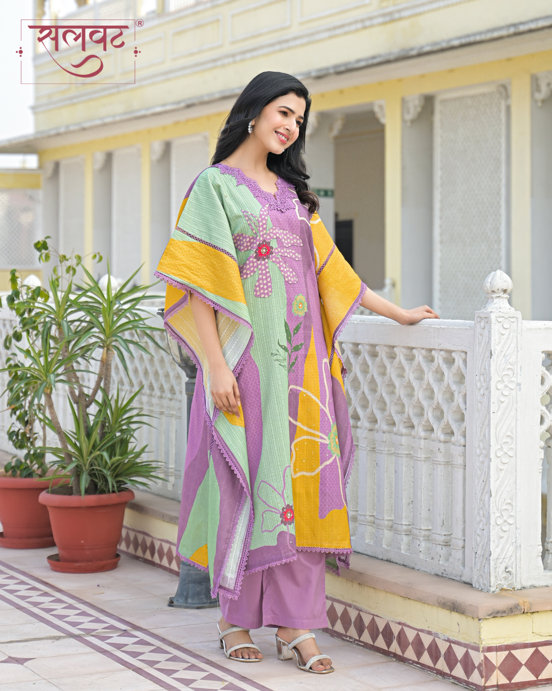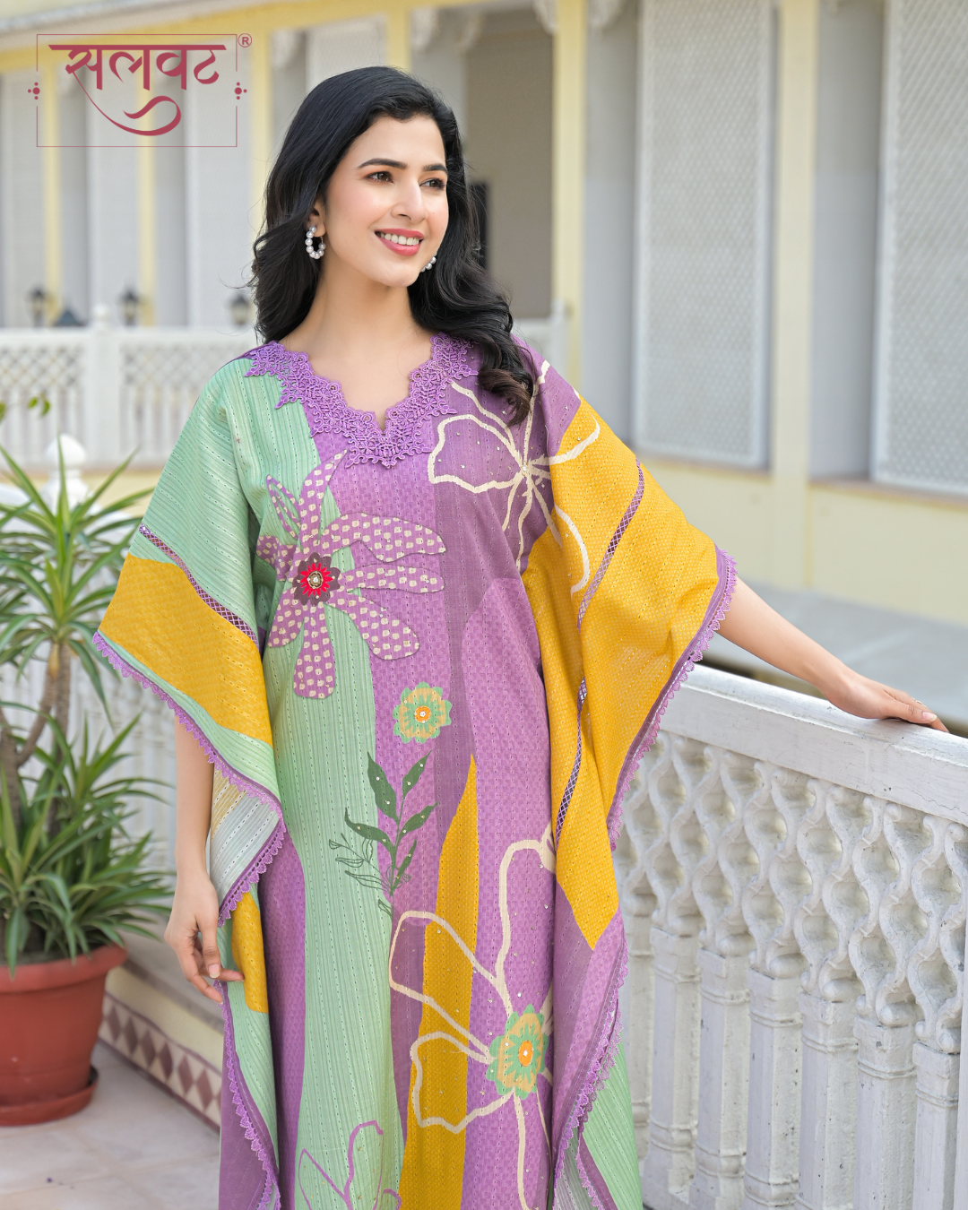 Lilac abstract flowers printed & sequins handwork kaftan set with hand-stitched & hand-dyed lace work.
