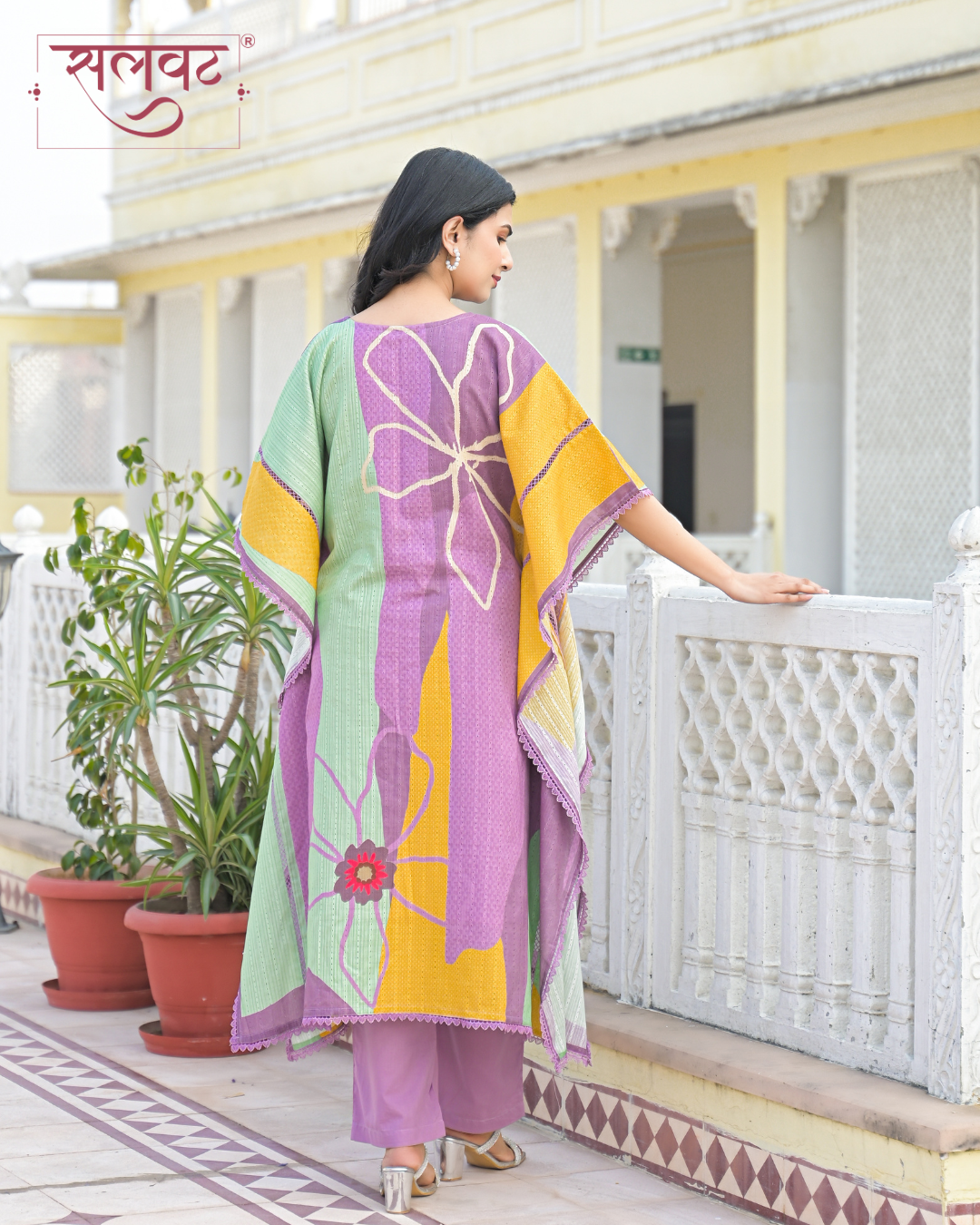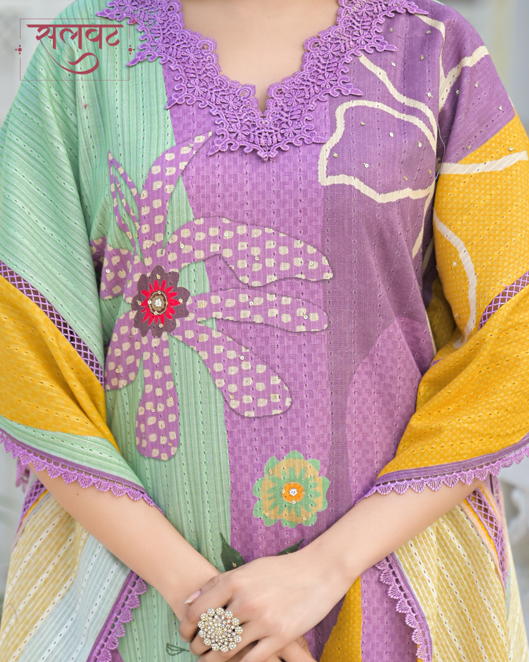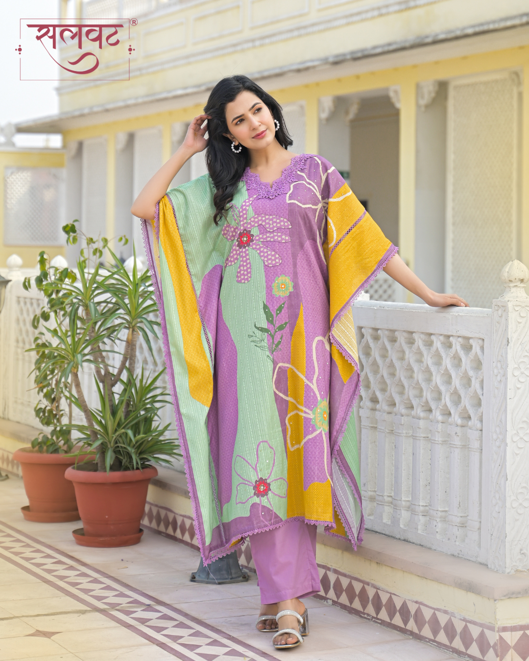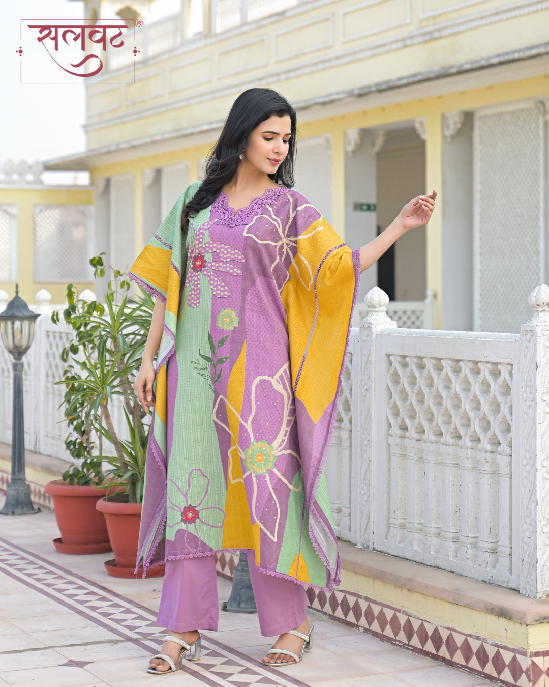 Lilac abstract flowers printed & sequins handwork kaftan set with hand-stitched & hand-dyed lace work.