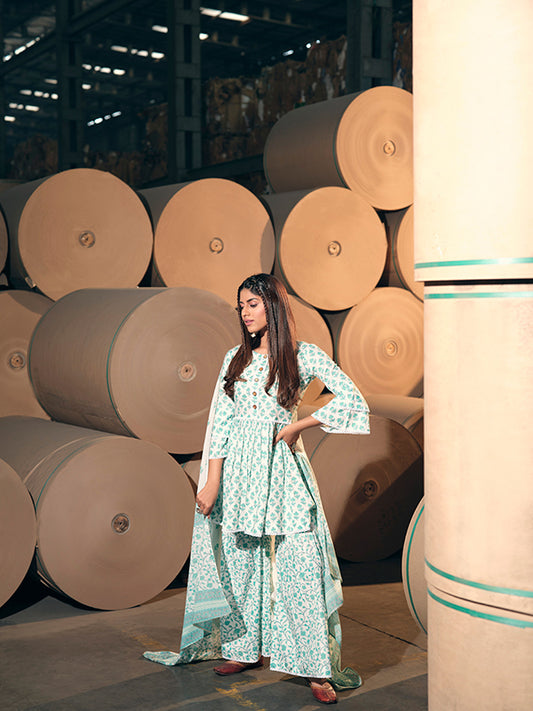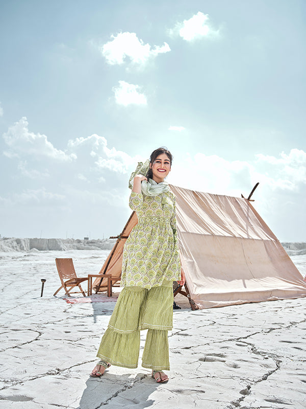 Green handprinted pleated short kurti with layered sharara pants and all over gold foil print