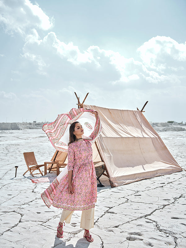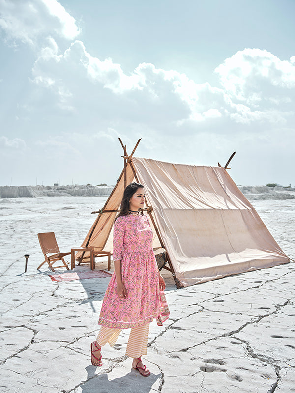 Mauvelous Pink and Golden Yellow Flared Kurta Set