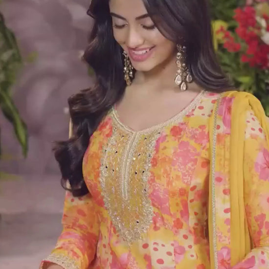 This vibrant Mustard Sharara Set features a Russian Silk Top with digital prints, beautifully highlighted with mirror embroidery on the yolk and sleeves. It is paired with a flowy Chinon Sharara for an elegant drape. Completing the ensemble is a Chinon Dupatta adorned with digitally printed borders, adding a modern touch to this traditional silhouette.