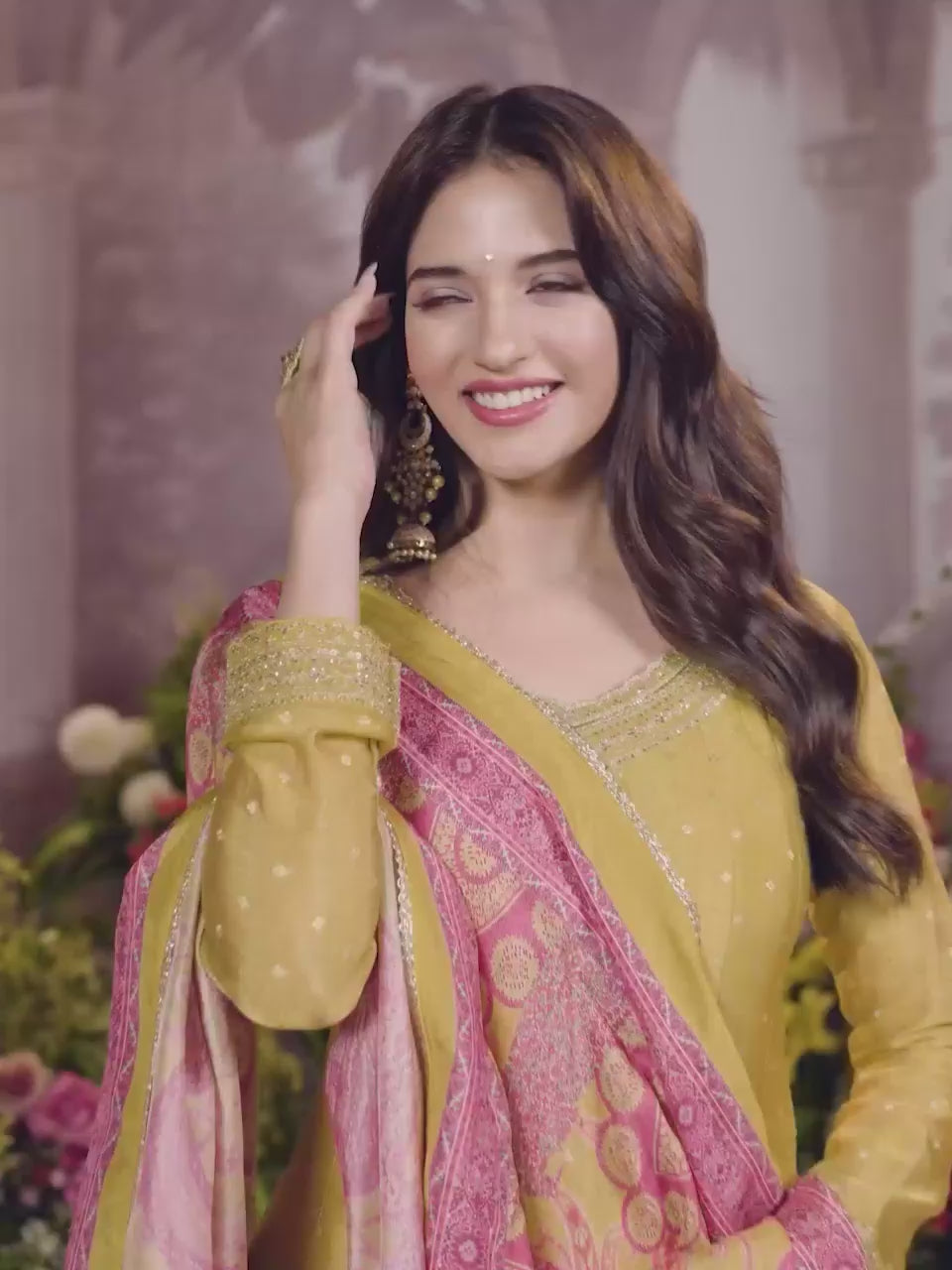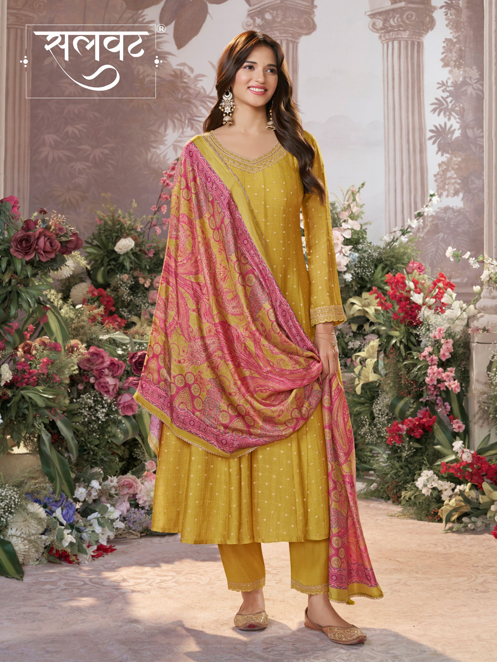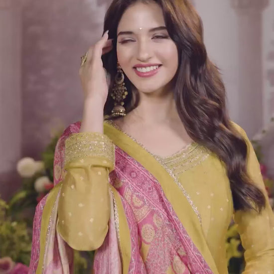 This elegant Mustard Tissue Silk Anarkali features delicate embroidery on the yoke, paired with comfortable Santoon straight pants. A pure Russian Silk dupatta with contrast digital print completes the look, making it perfect for festive and special occasions.