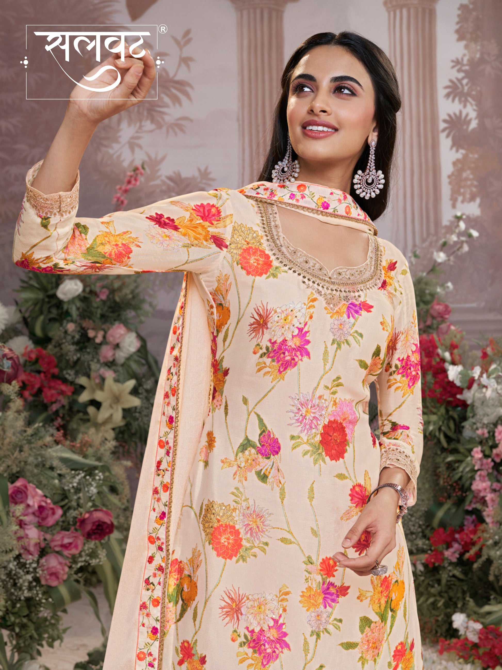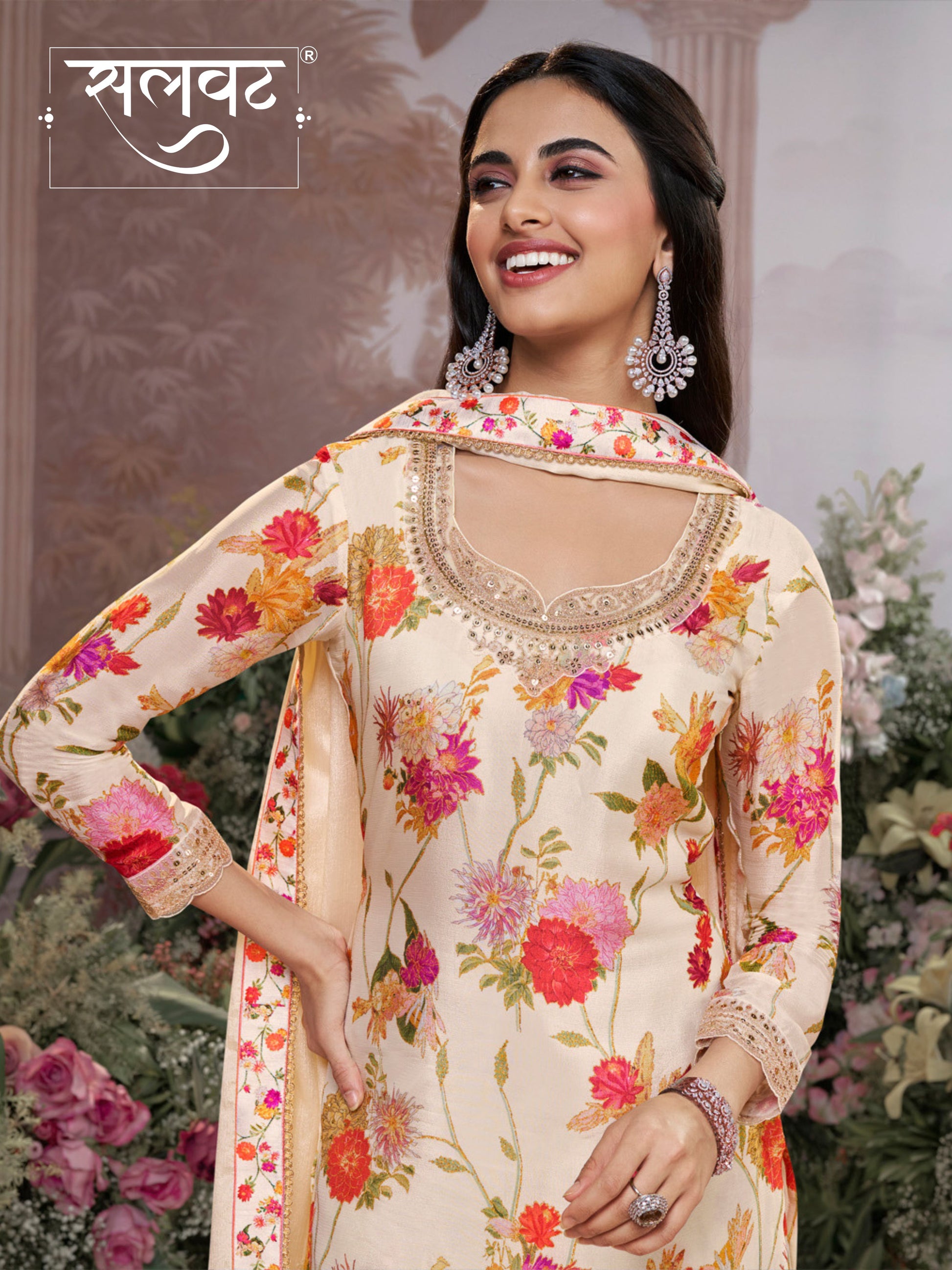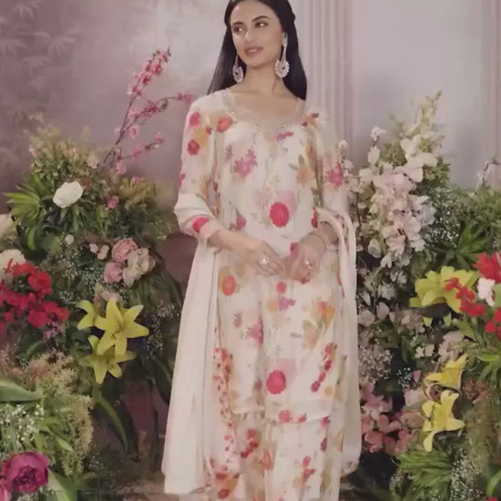 Off-white Chinon top featuring floral digital prints, enhanced with designer embroidery on the neckline and sleeves. Paired with a matching sharara and a Chinon dupatta adorned with floral print lace along the border.