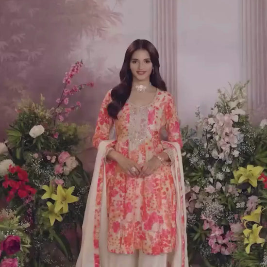 This vibrant Off-White Sharara Set features a Russian Silk Top with digital prints, beautifully highlighted with mirror embroidery on the yolk and sleeves. It is paired with a flowy Chinon Sharara for an elegant drape. Completing the ensemble is a Chinon Dupatta adorned with digitally printed borders, adding a modern touch to this traditional silhouette.