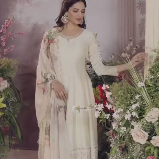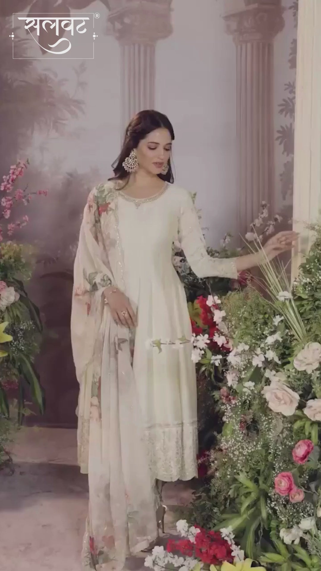 This Elegant Off-White Anarkali Set Features A Vichitra Silk Top Adorned With Intricate Embroidery On The Daman, Complemented By Delicately Highlighted Embroidery On The Yoke And Sleeves. It Is Paired With A Graceful Viscose Santoon Straight Pant That Drapes Beautifully, Enhancing The Ensemble’s Sophistication. The Look Is Completed With A Chiffon Dupatta, Digitally Printed And Finished With A Scalloped Border, Bringing A Modern Charm To This Timeless Traditional Silhouette.