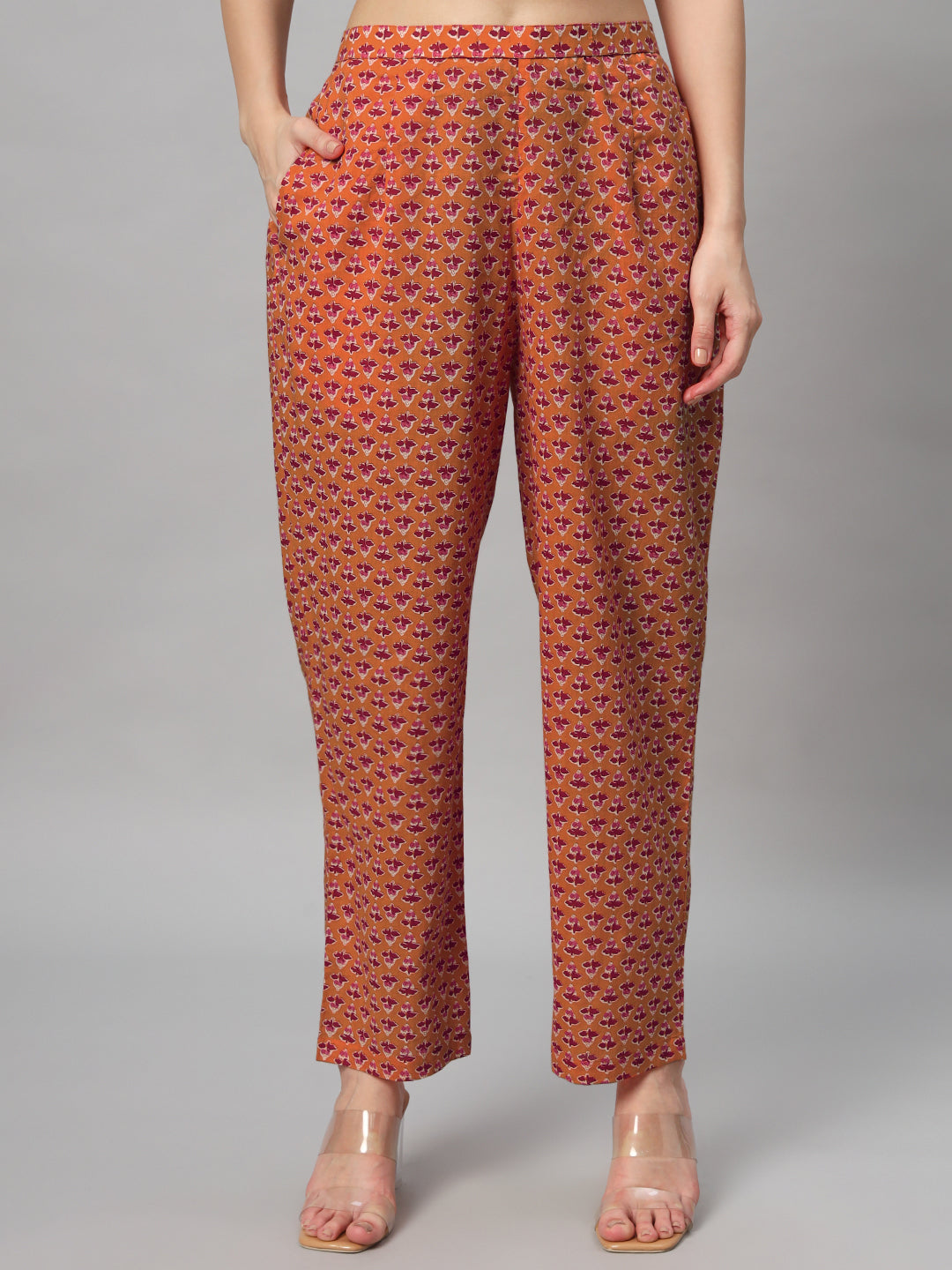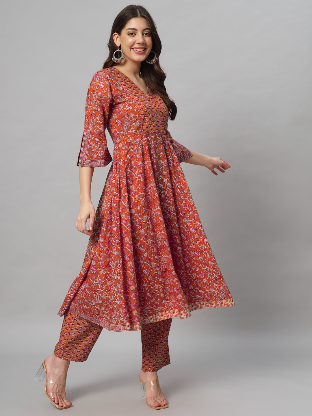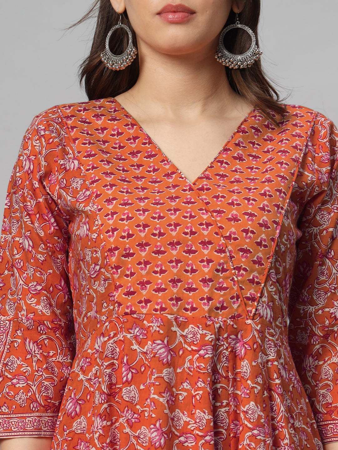 Hand blocked printed orange floral flared kurti with beautiful neck design and stylish sleeves with a trouser.