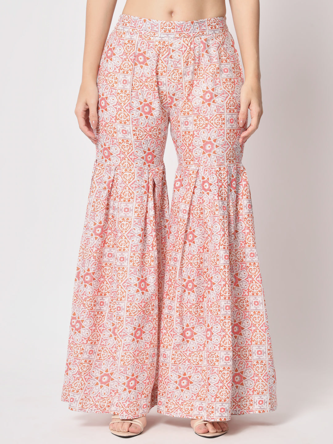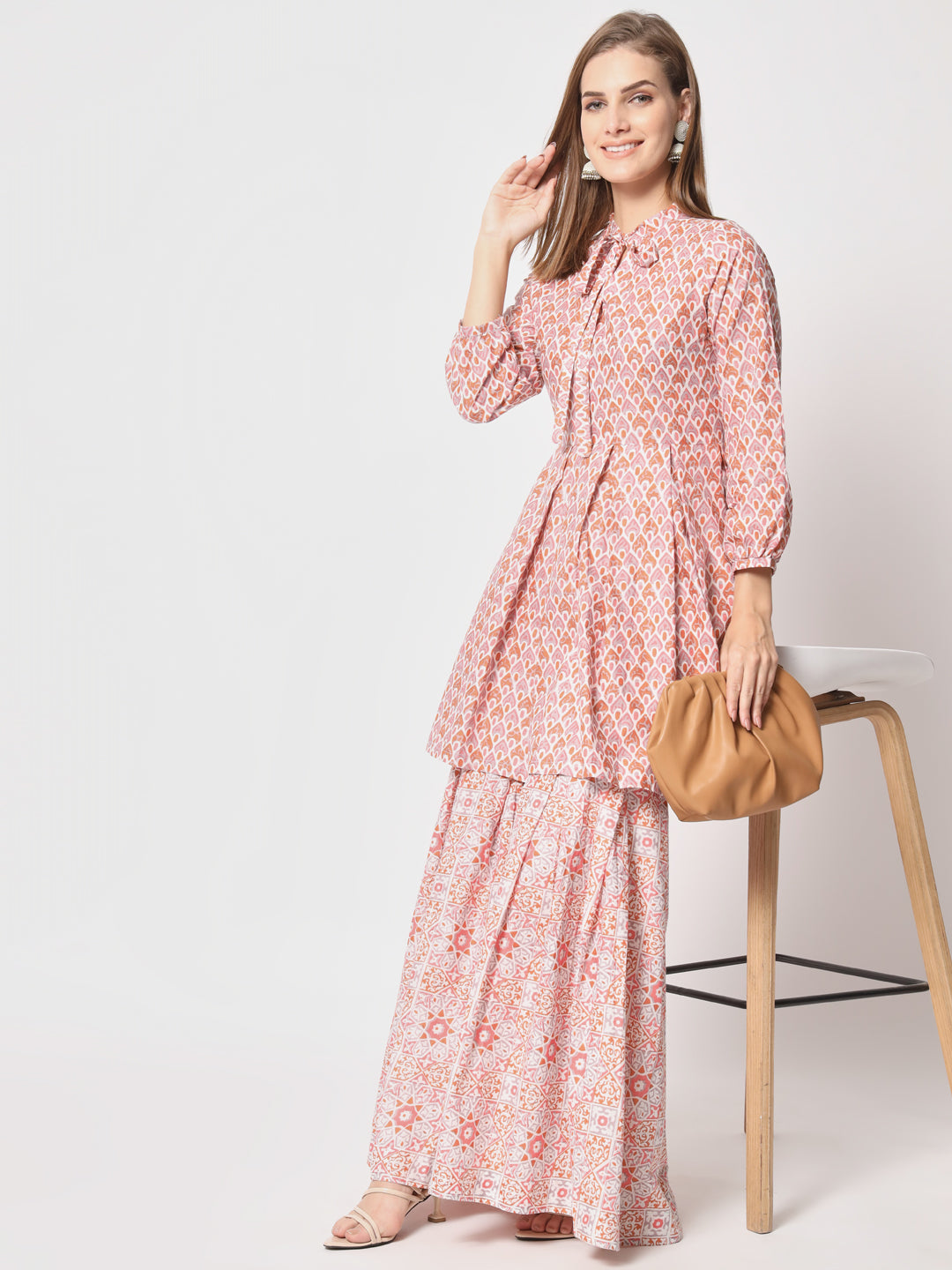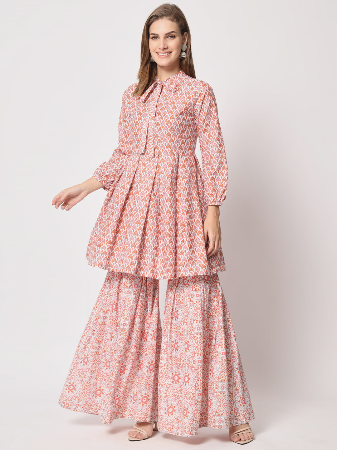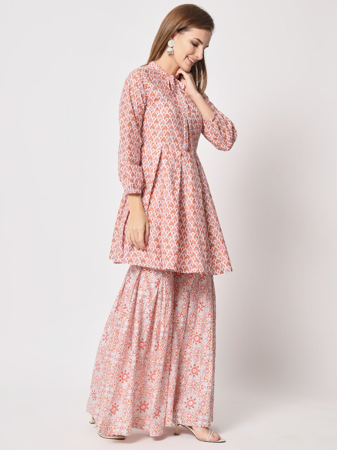 Hand printed pink neck tie peplum kurti with baloon sleeves and a sharara pant.