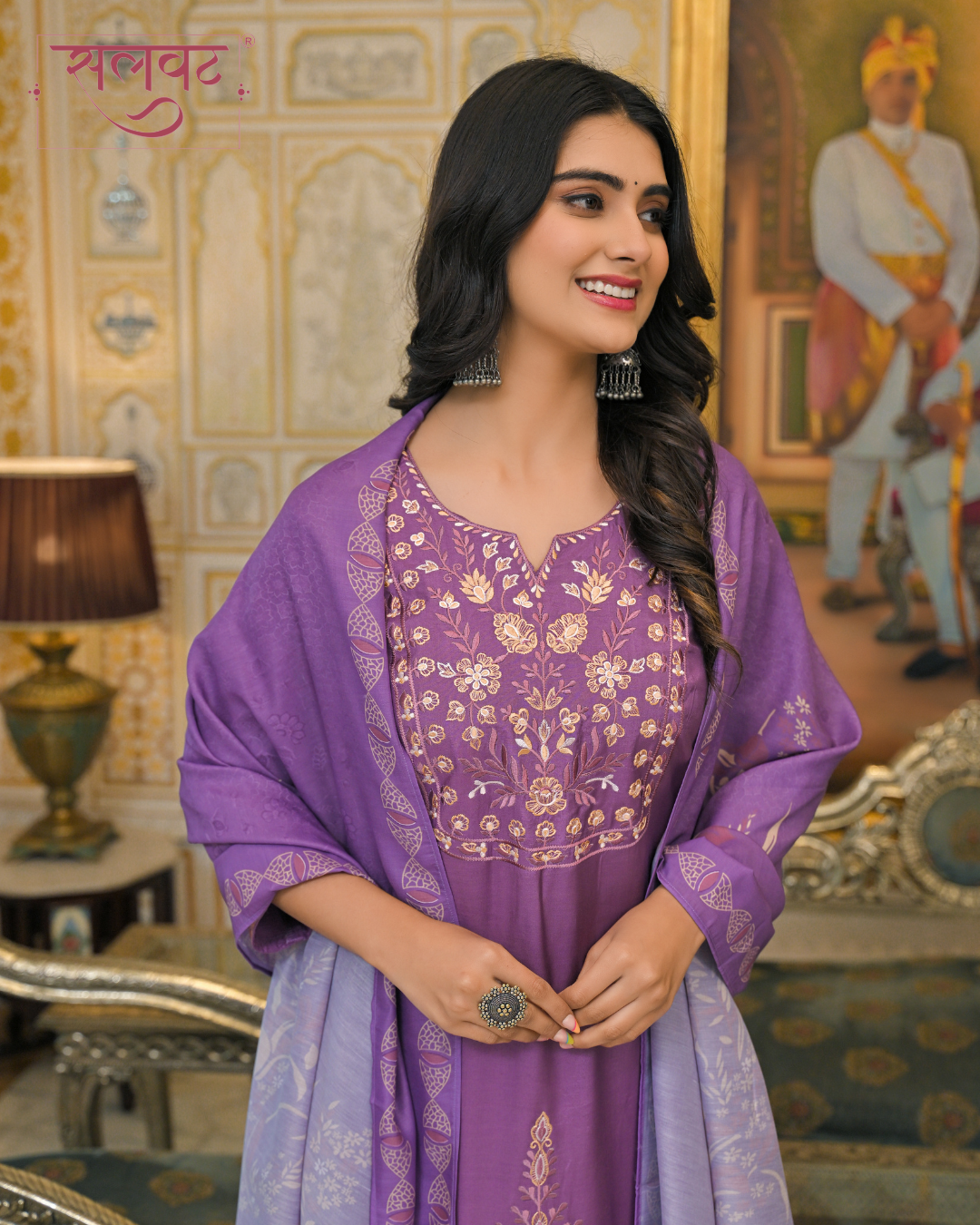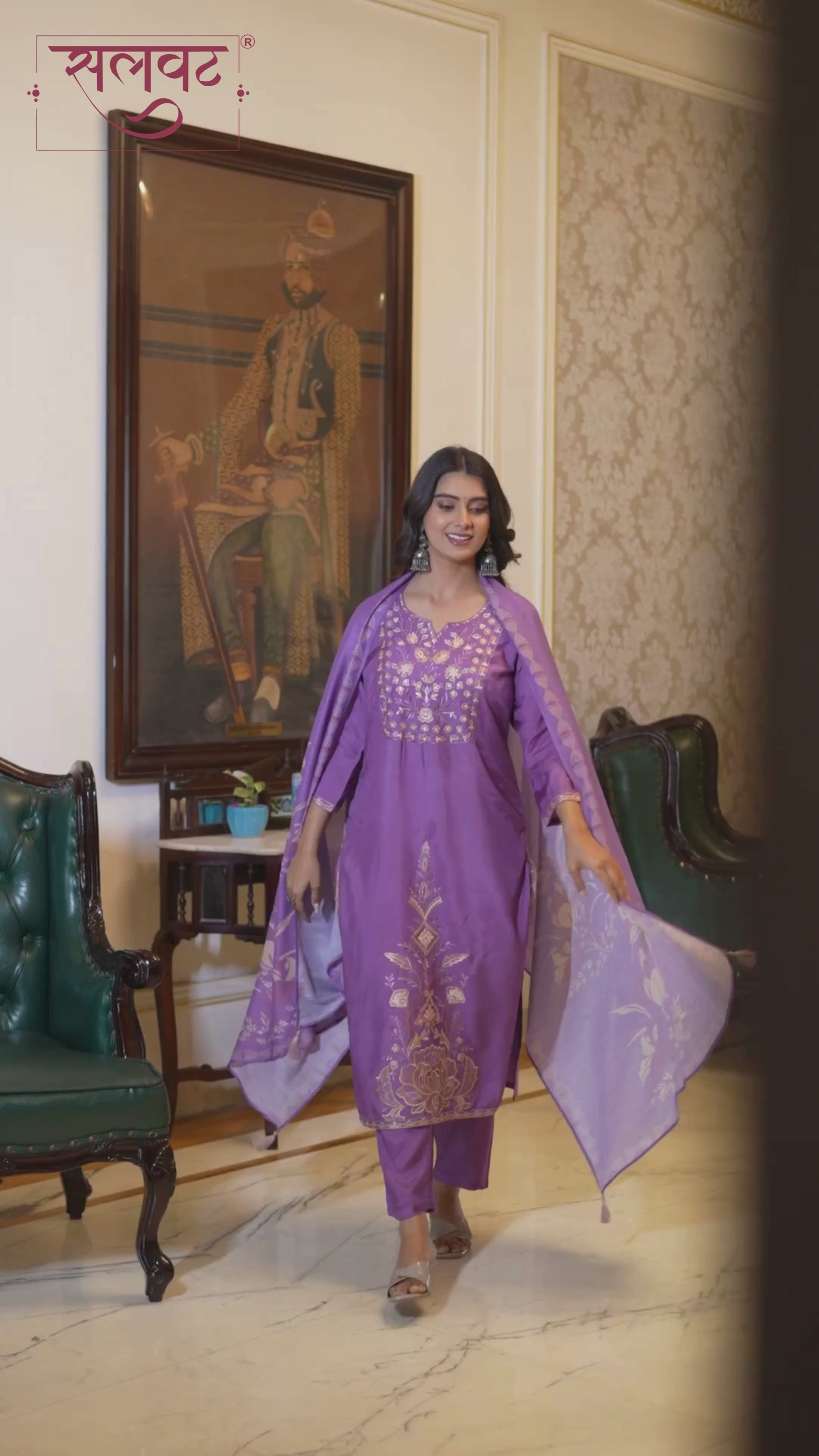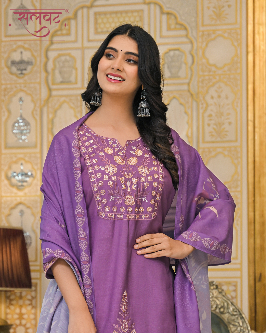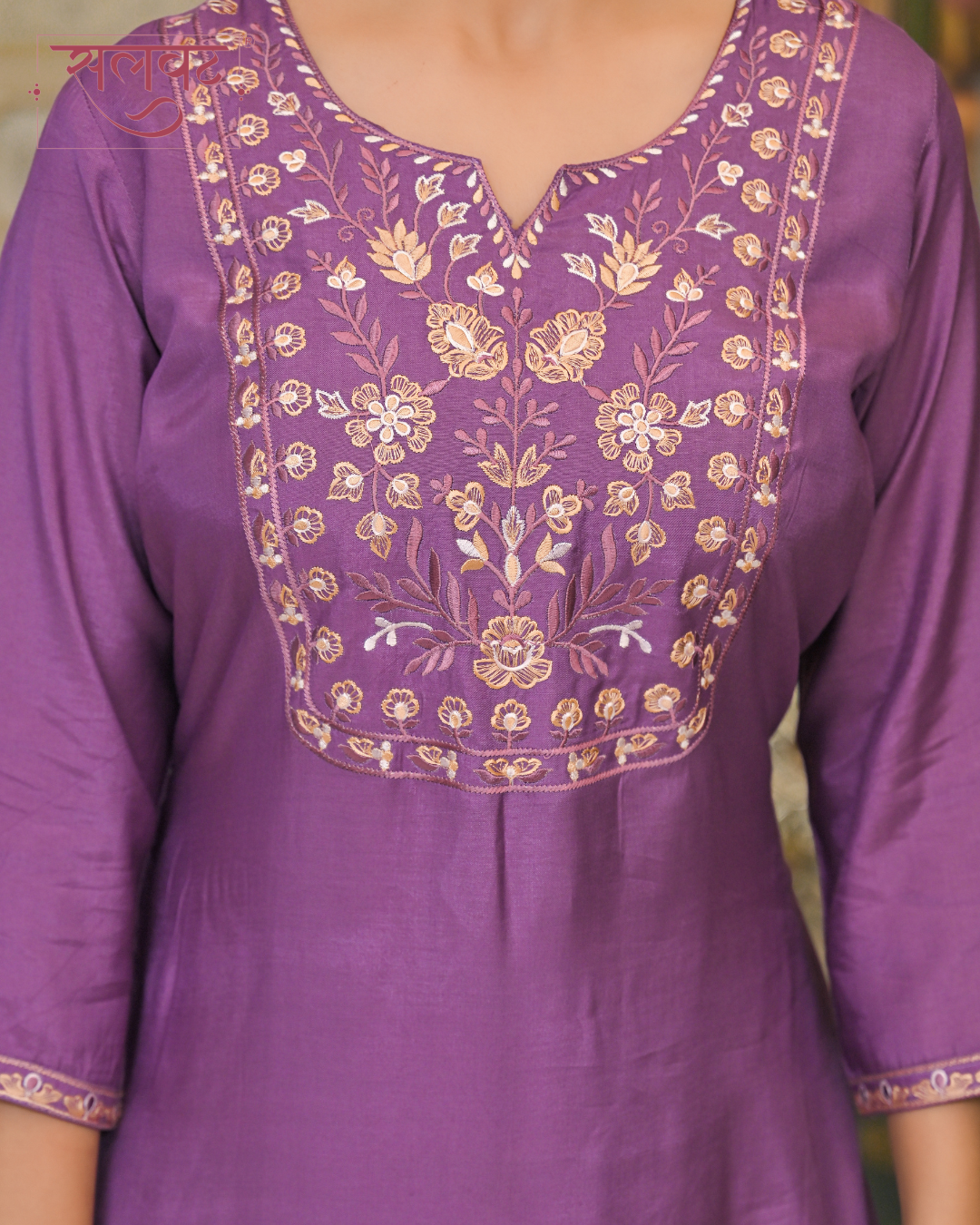 This Plum Purple hand-dyed center placement muslin thread embroidery kurta with pants & elegant digital printed dupatta,